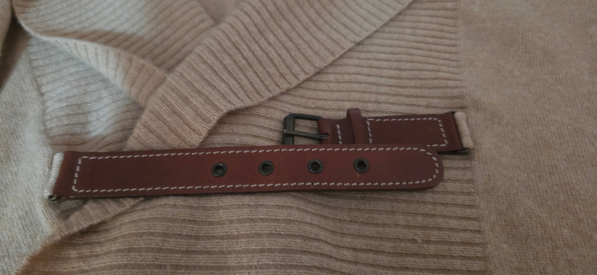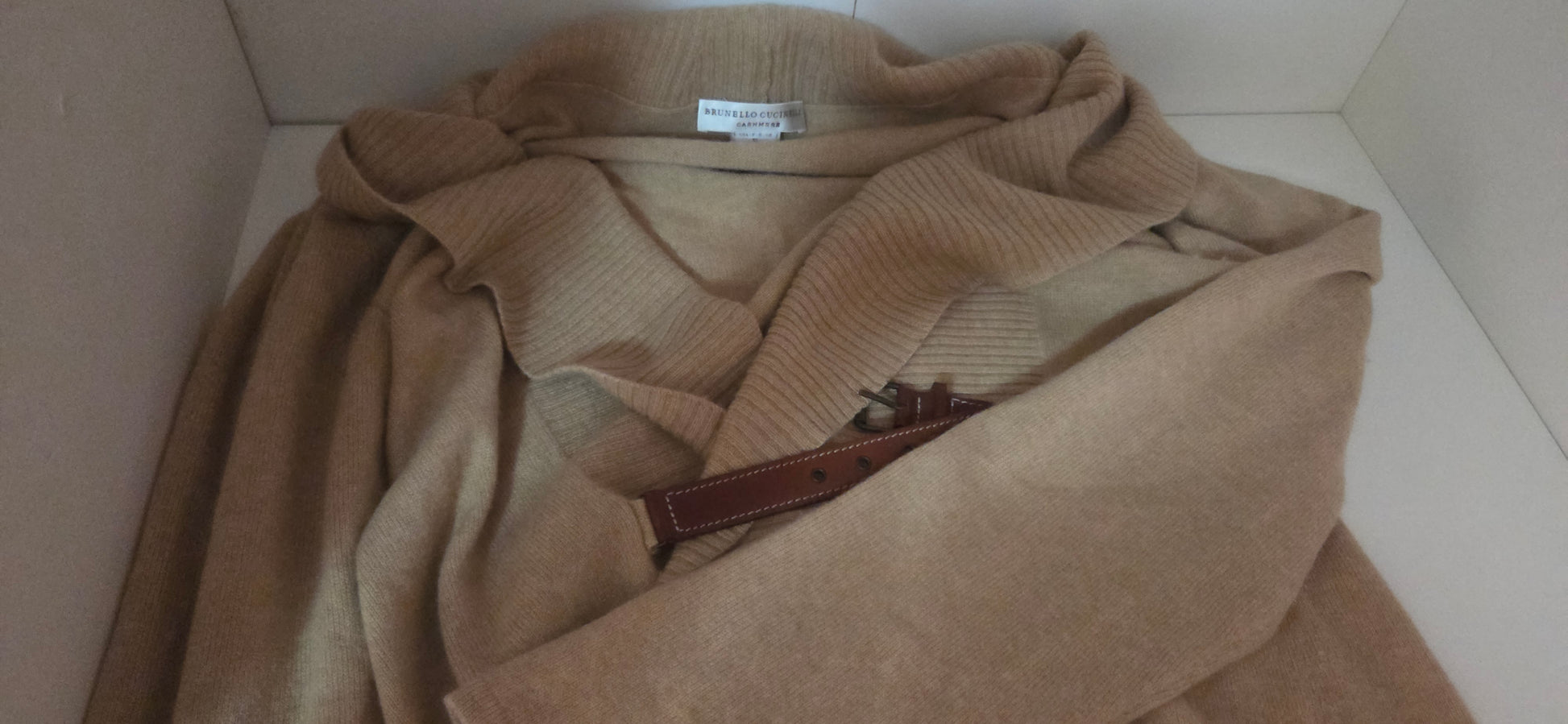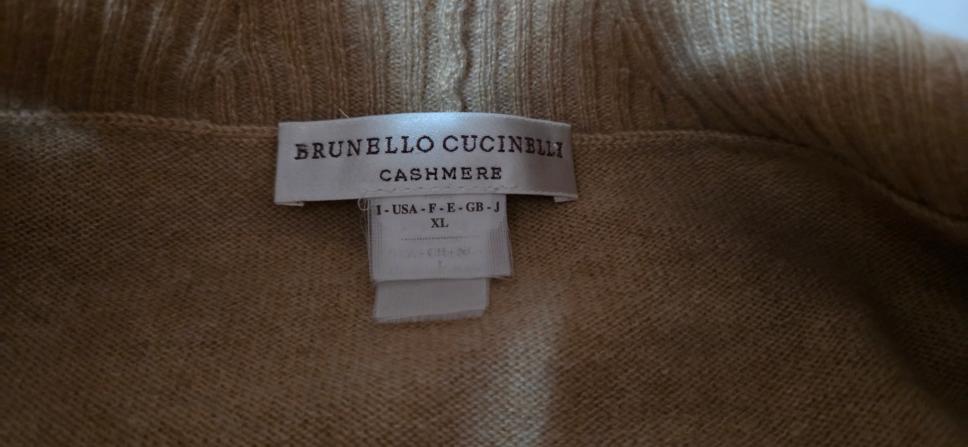 Gilet Brunello Cucinelli en cachemire côtelé camel , demi ceinture en cuir Taille XL.