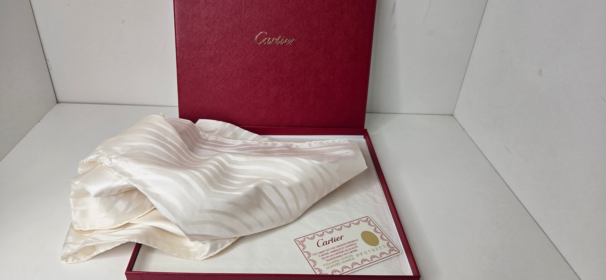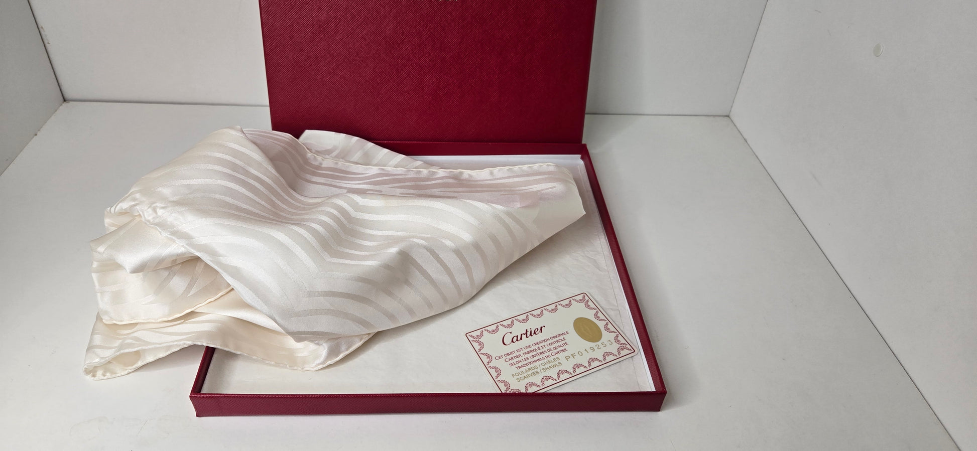Cartier Carré en soie (70x70cm) en excellent état avec sa Boîte et sa carte.