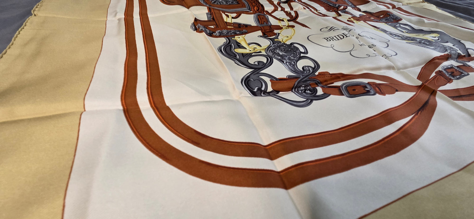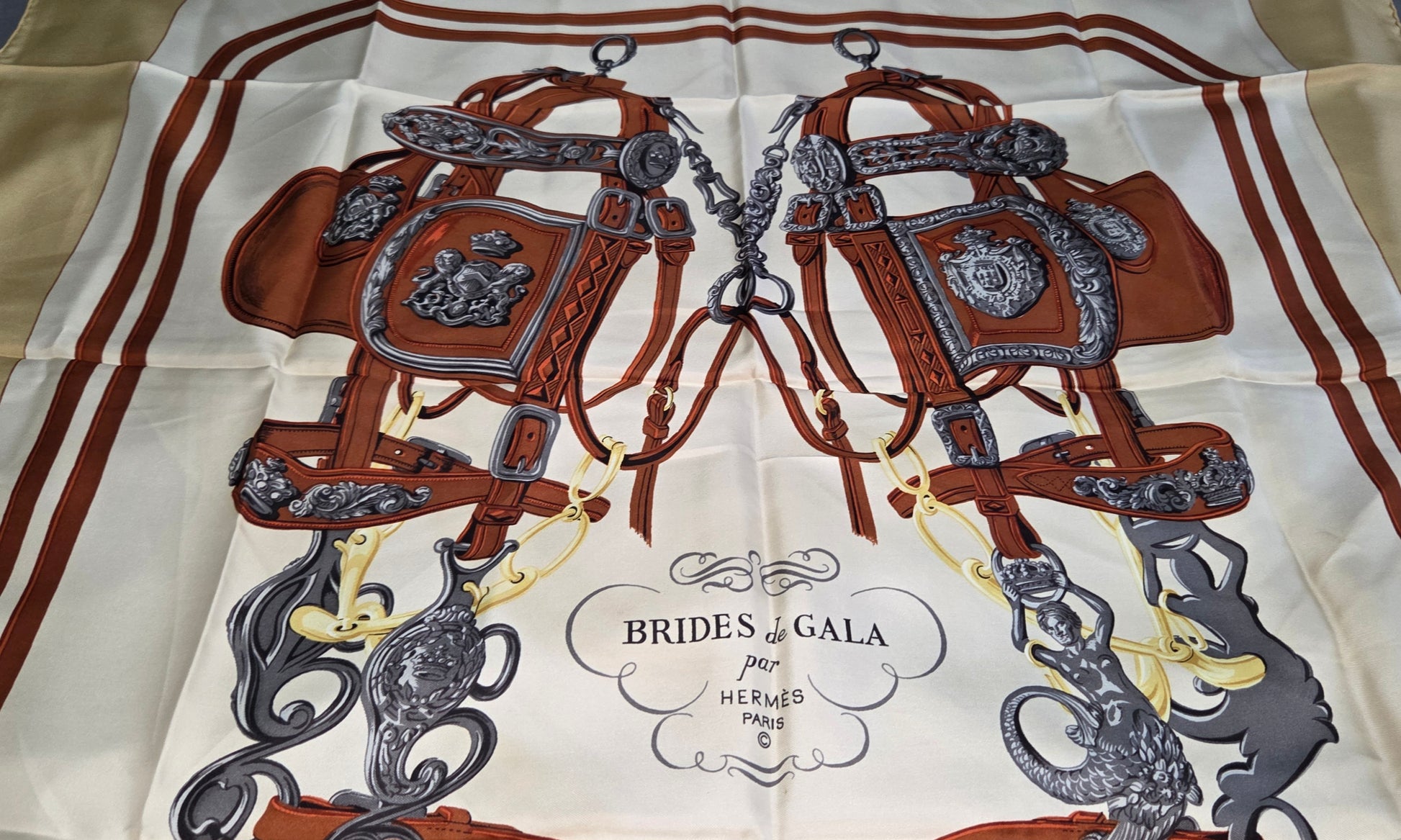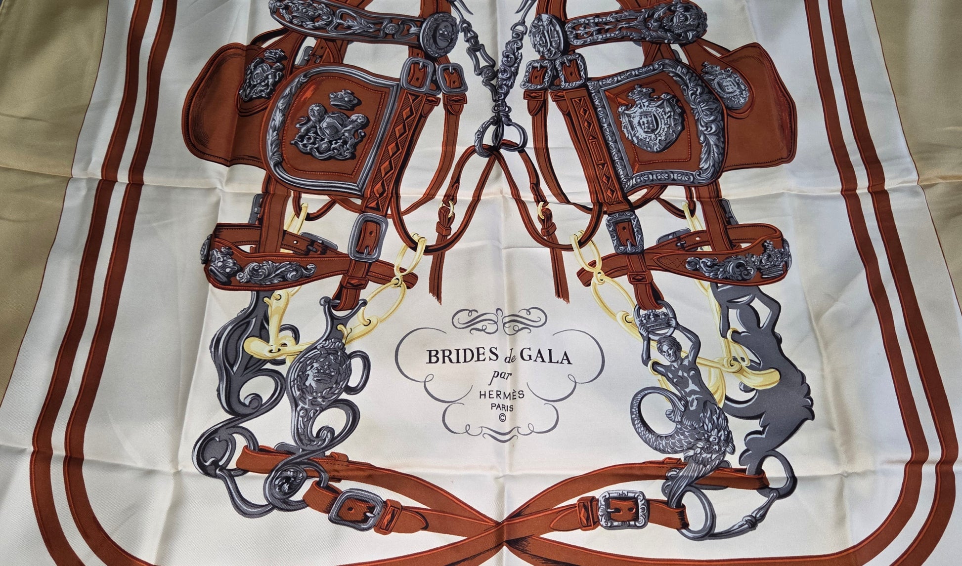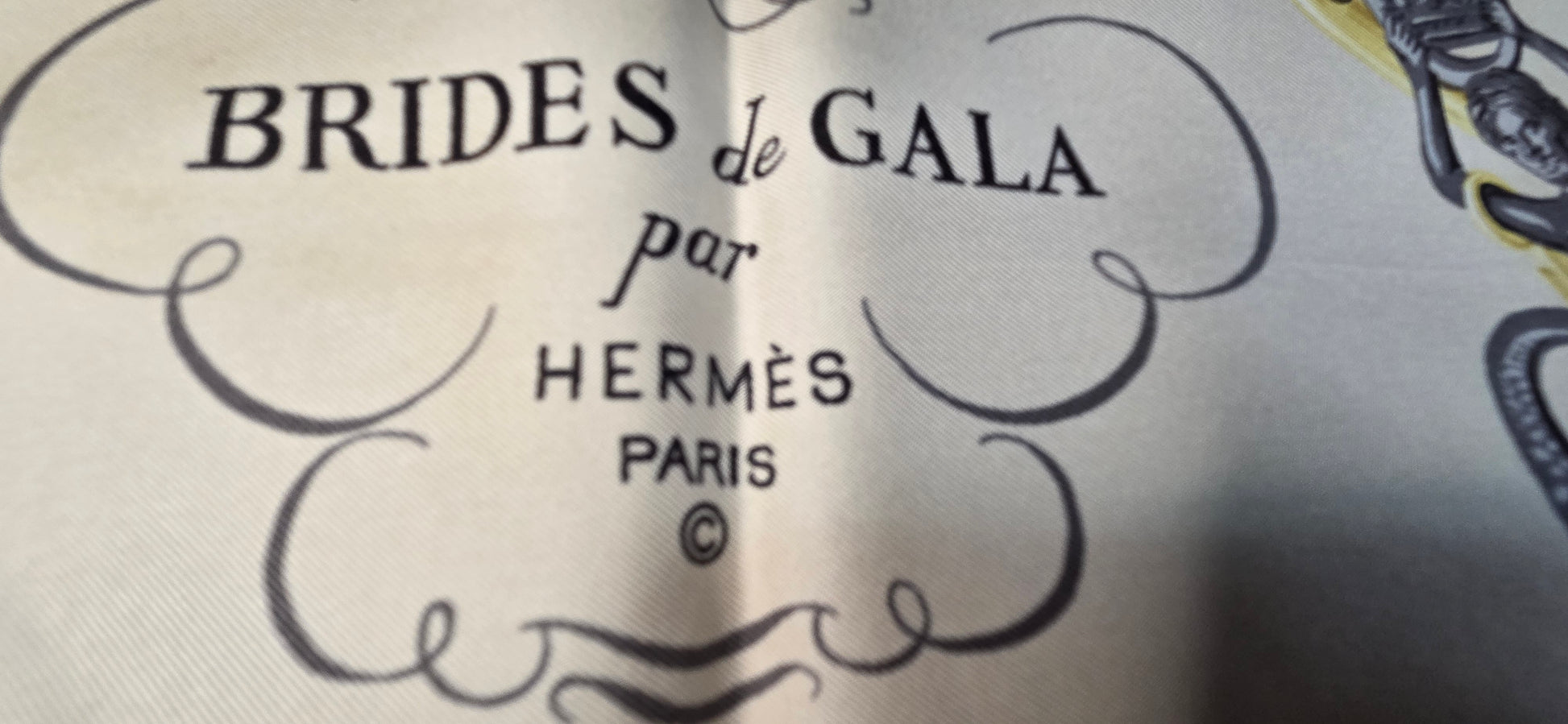 Carré Hermès en twill de soie intitulé "Brides de Gala" dessiné et travaillé par Hugo Grygkar et Robert Dumas . C'est l'un des dessins les plus emblématiques de la Maison Hermès.