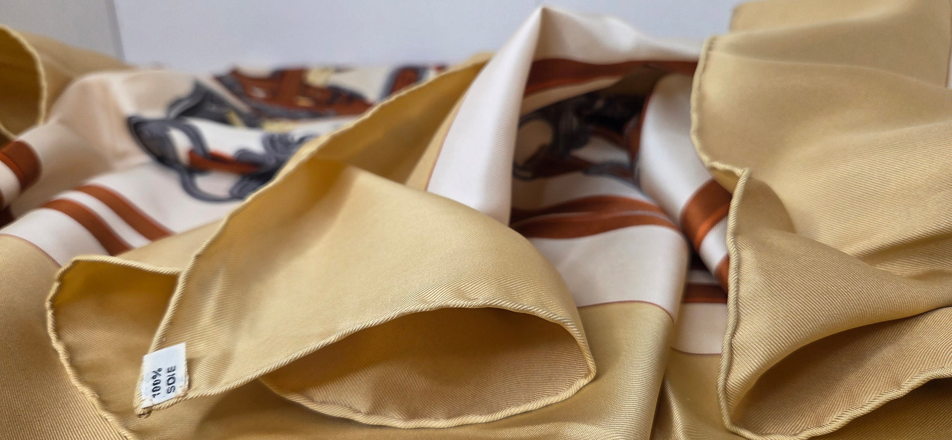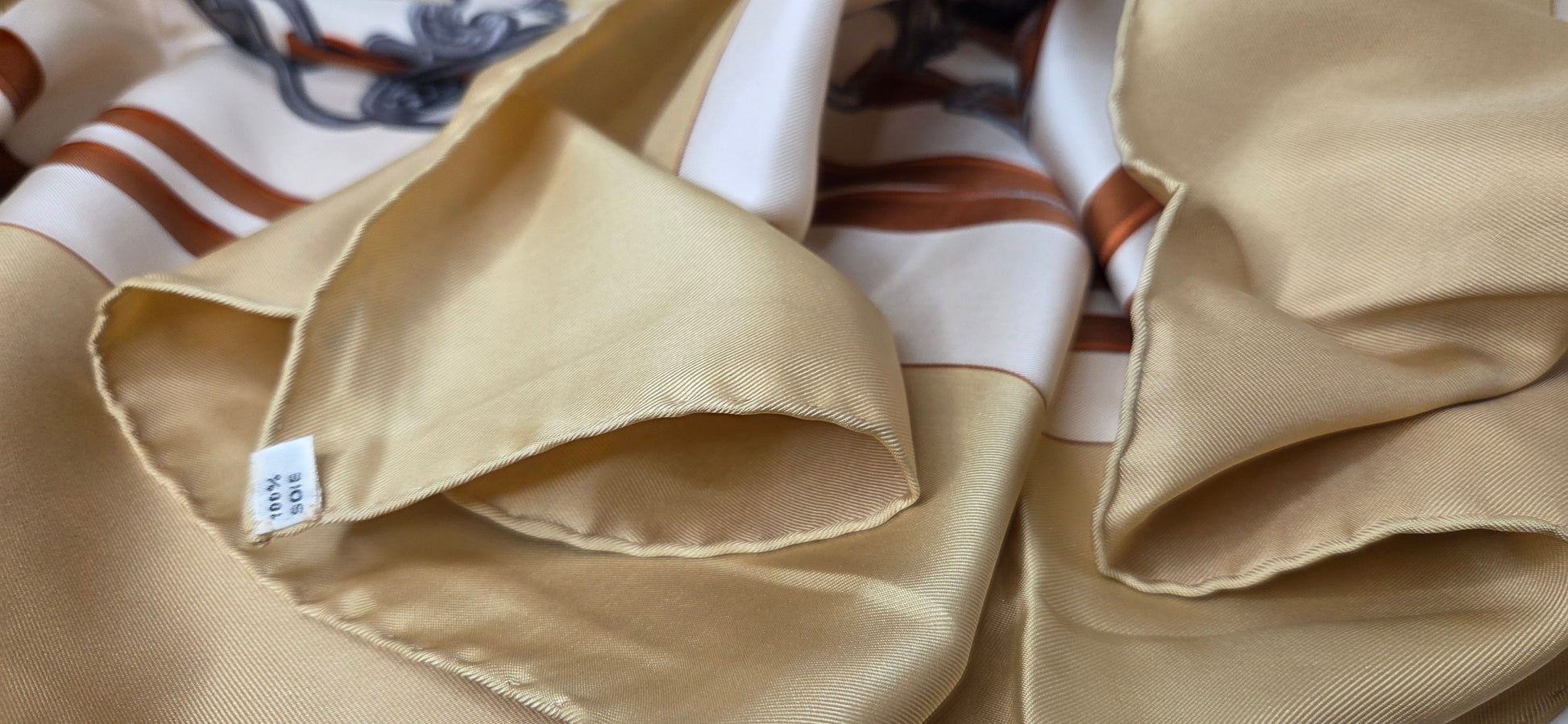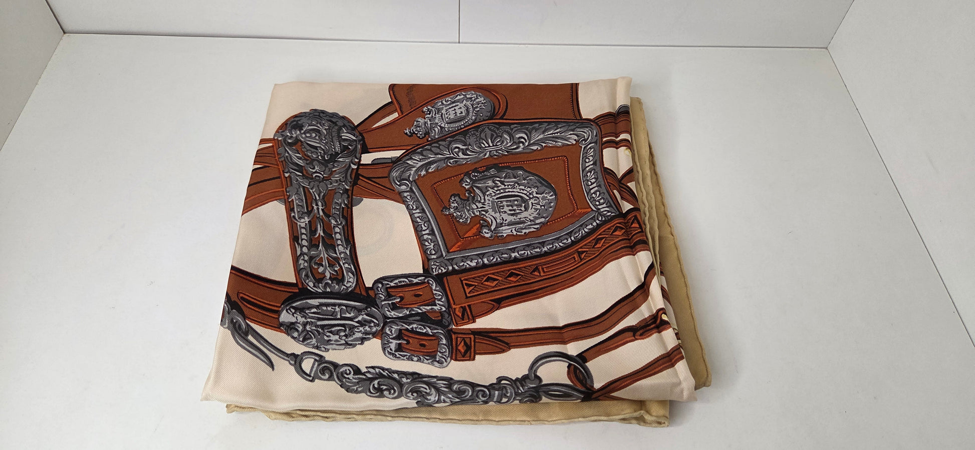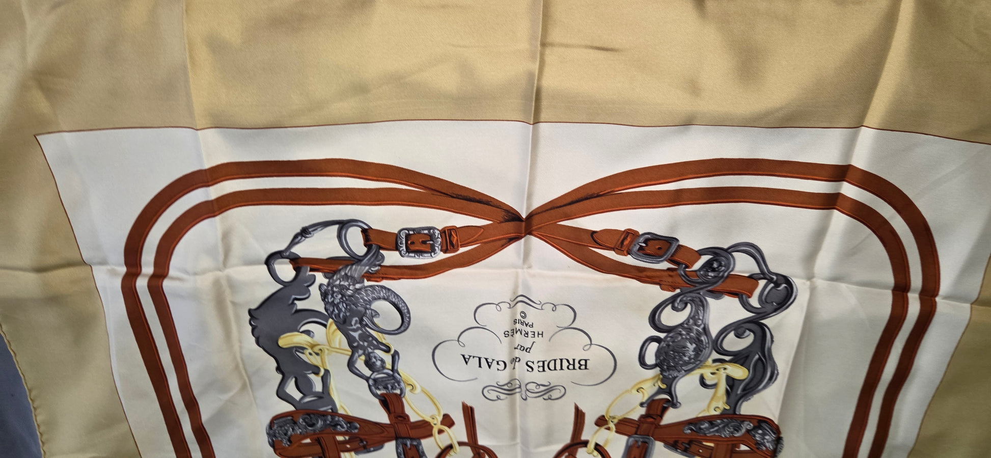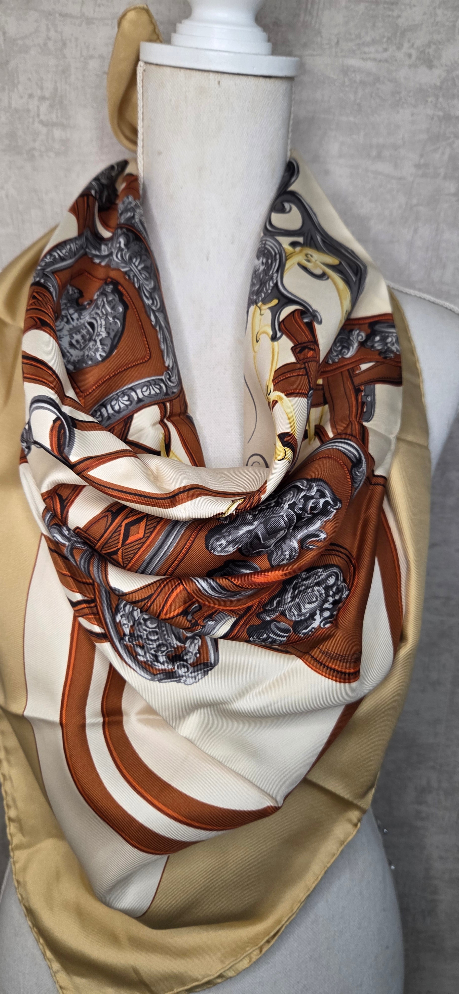 Carré Hermès en twill de soie intitulé "Brides de Gala" dessiné et travaillé par Hugo Grygkar et Robert Dumas . C'est l'un des dessins les plus emblématiques de la Maison Hermès.