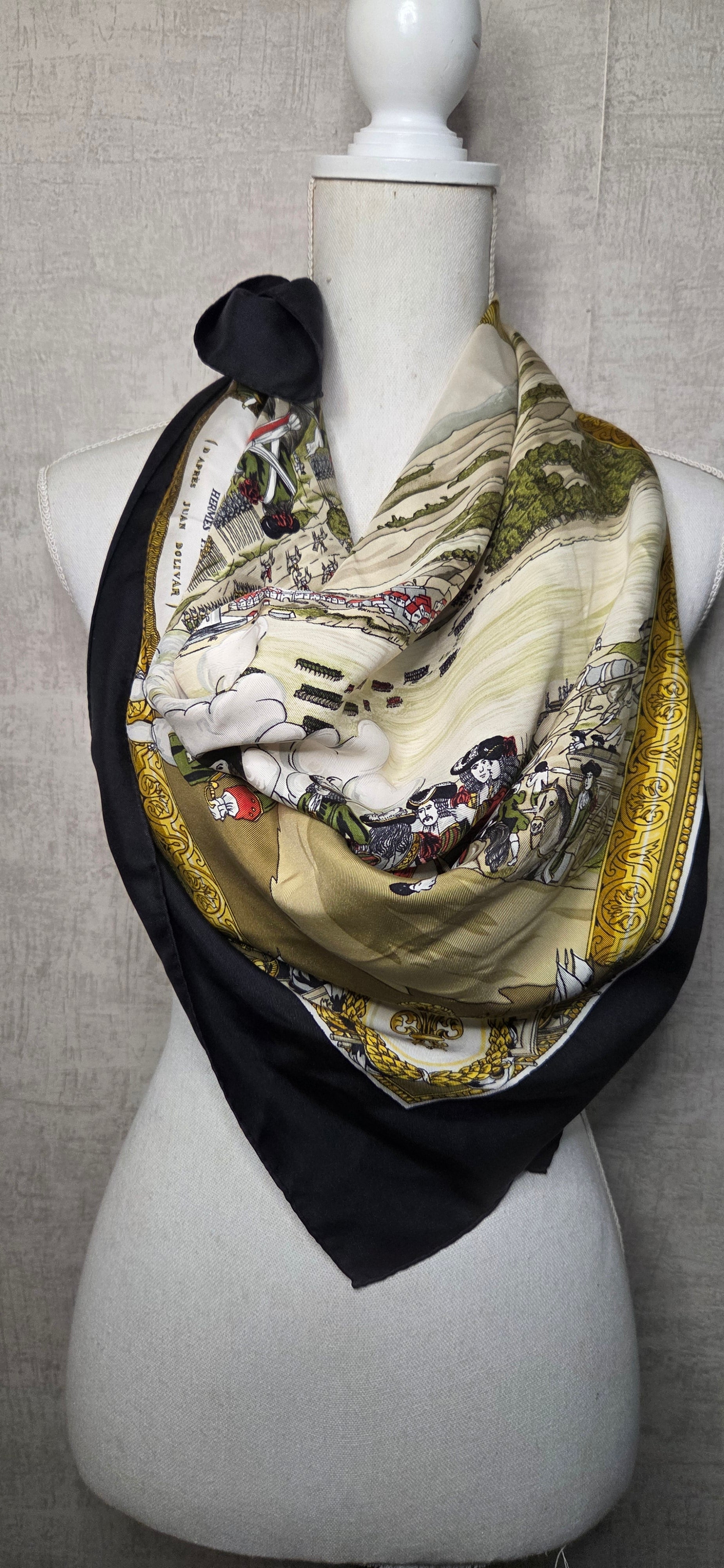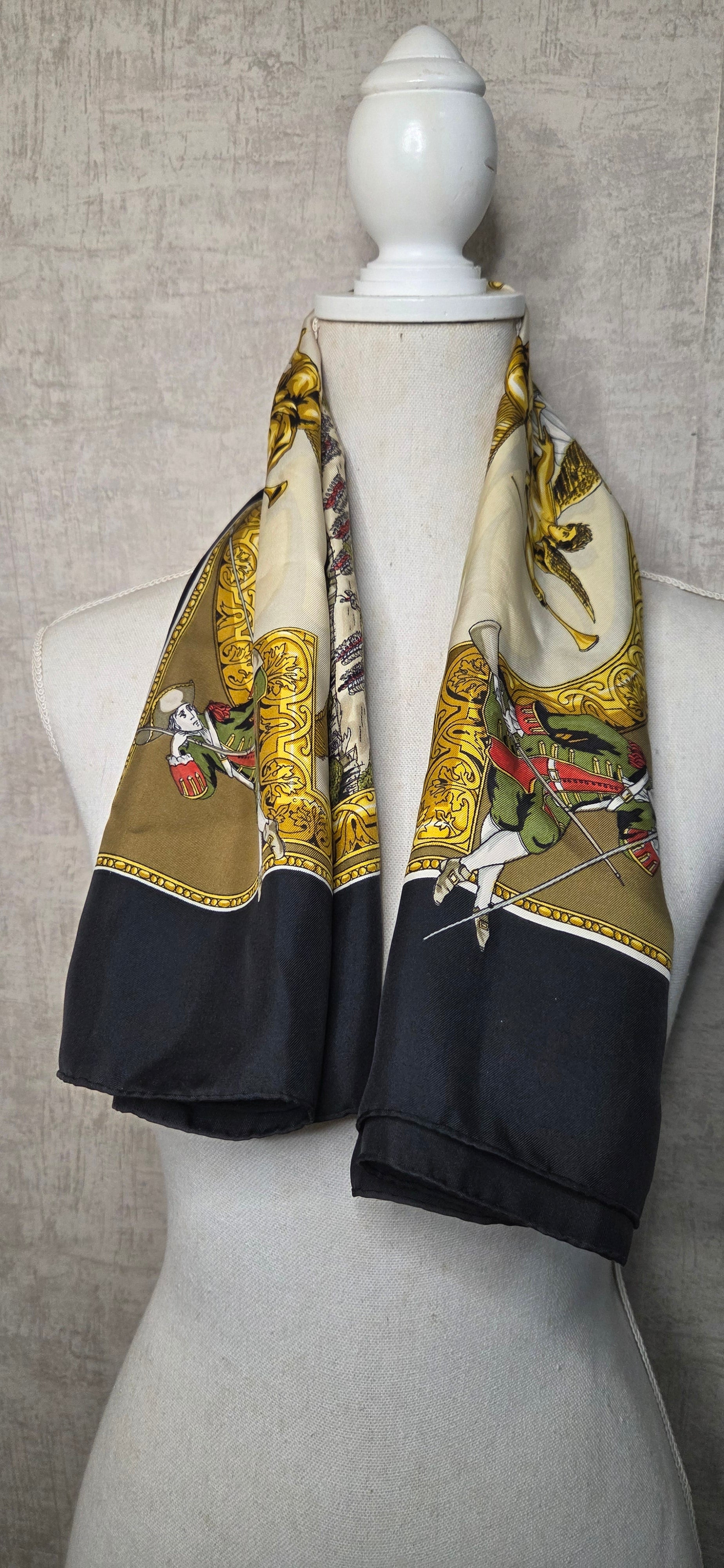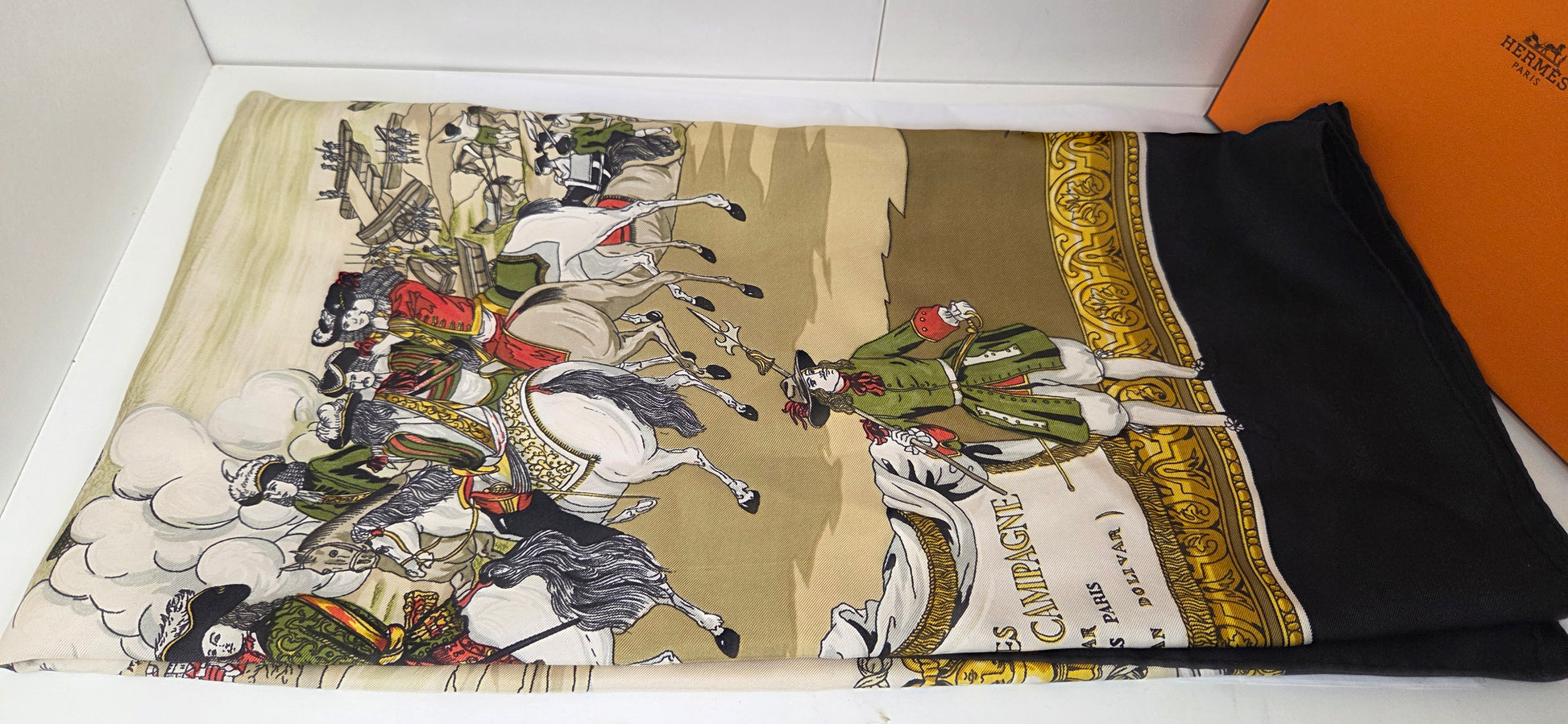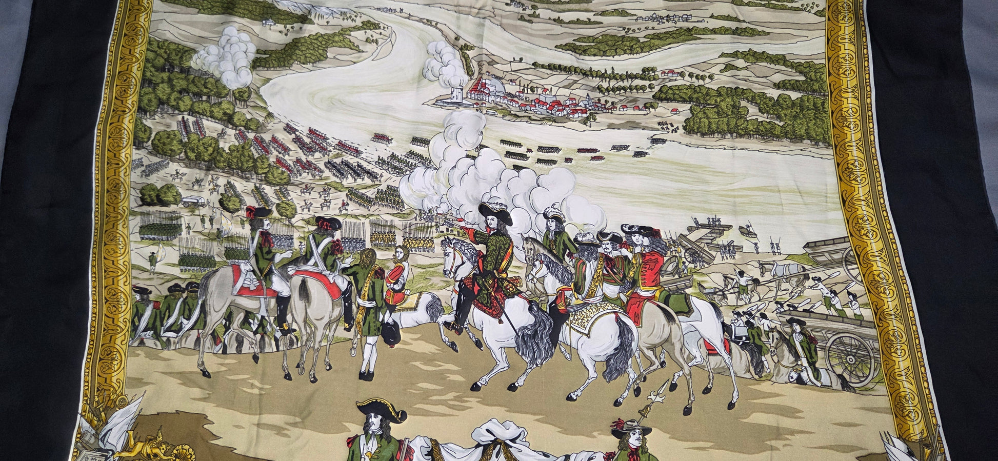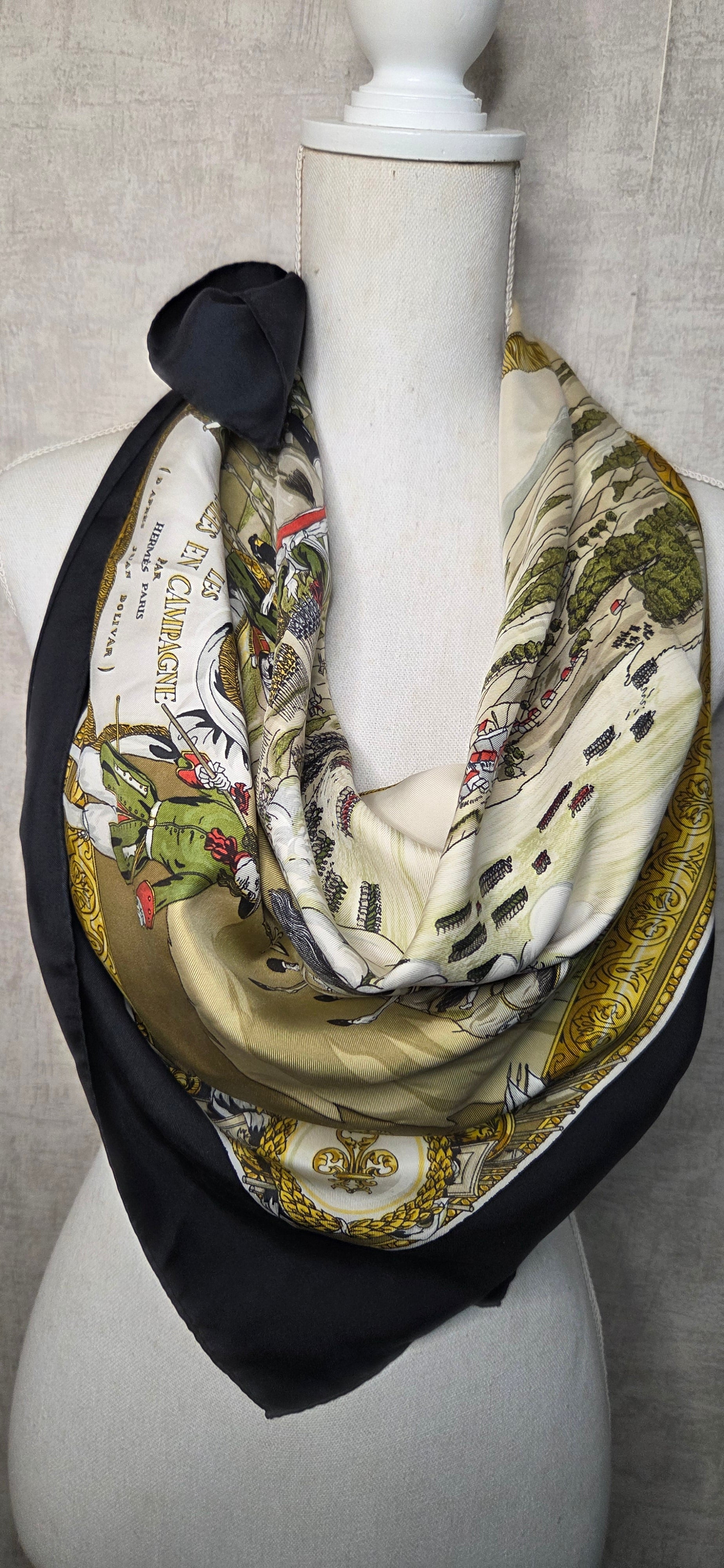 Carré Hermès en twill de soie " Les Armées en Campagne " Bordures noires.