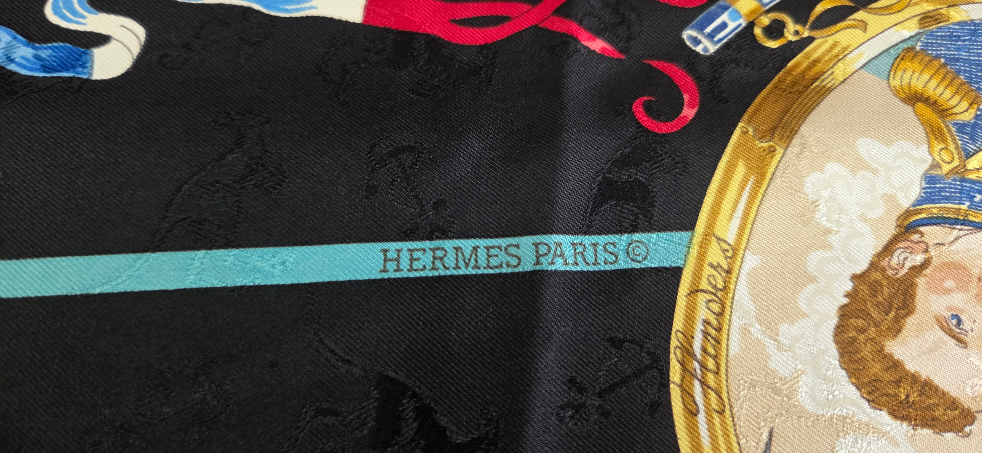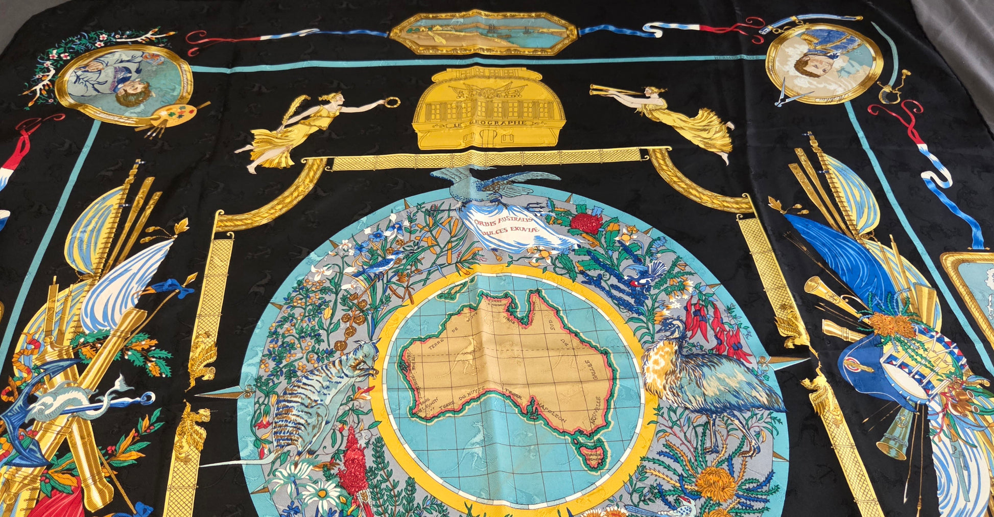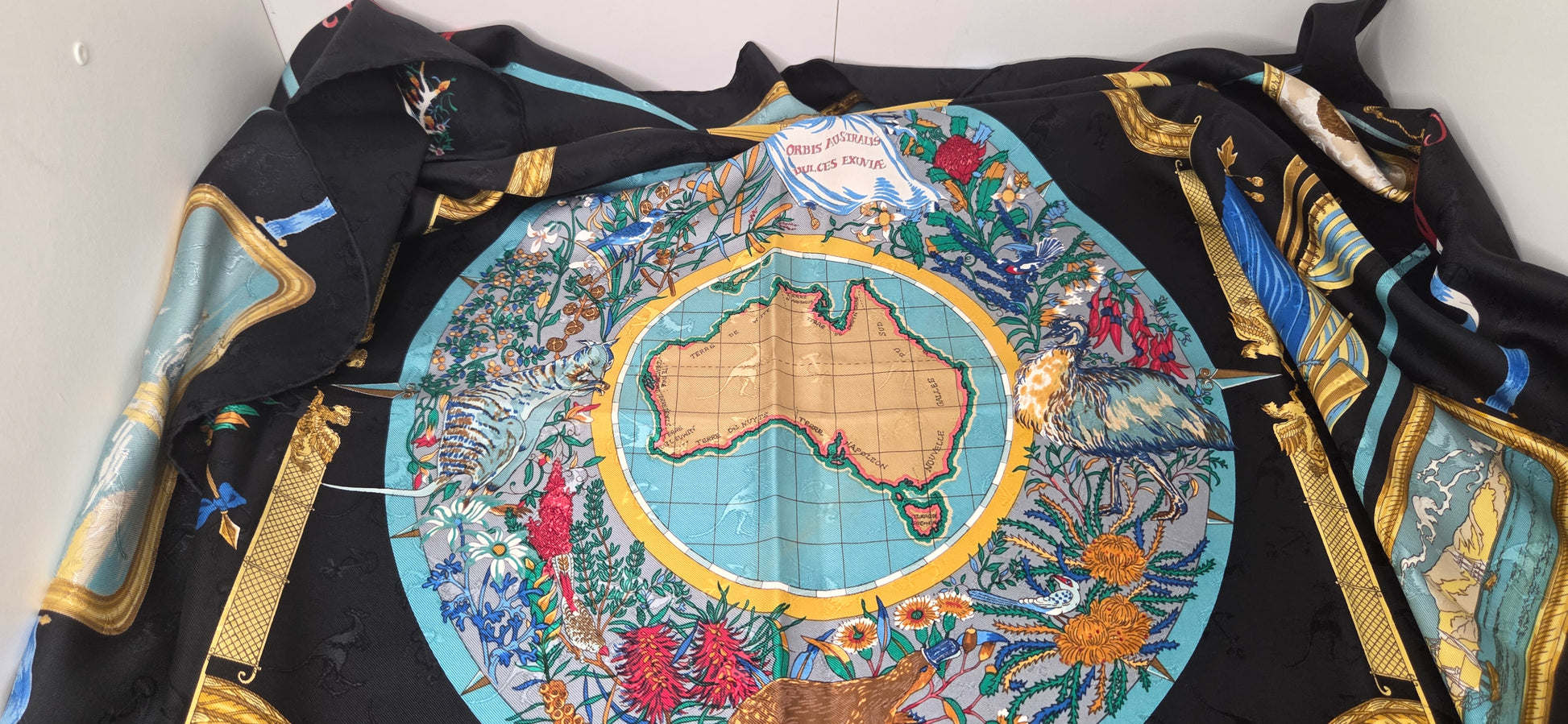 Carré Hermès en twill de soie damassee aux Kangourous intitulé " Le Geographe".sur fond noir.