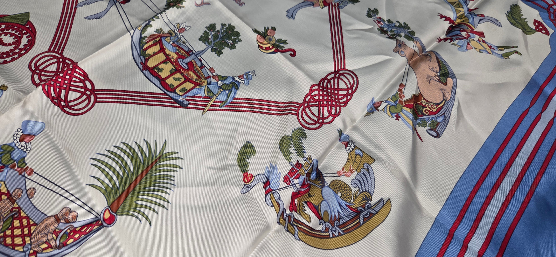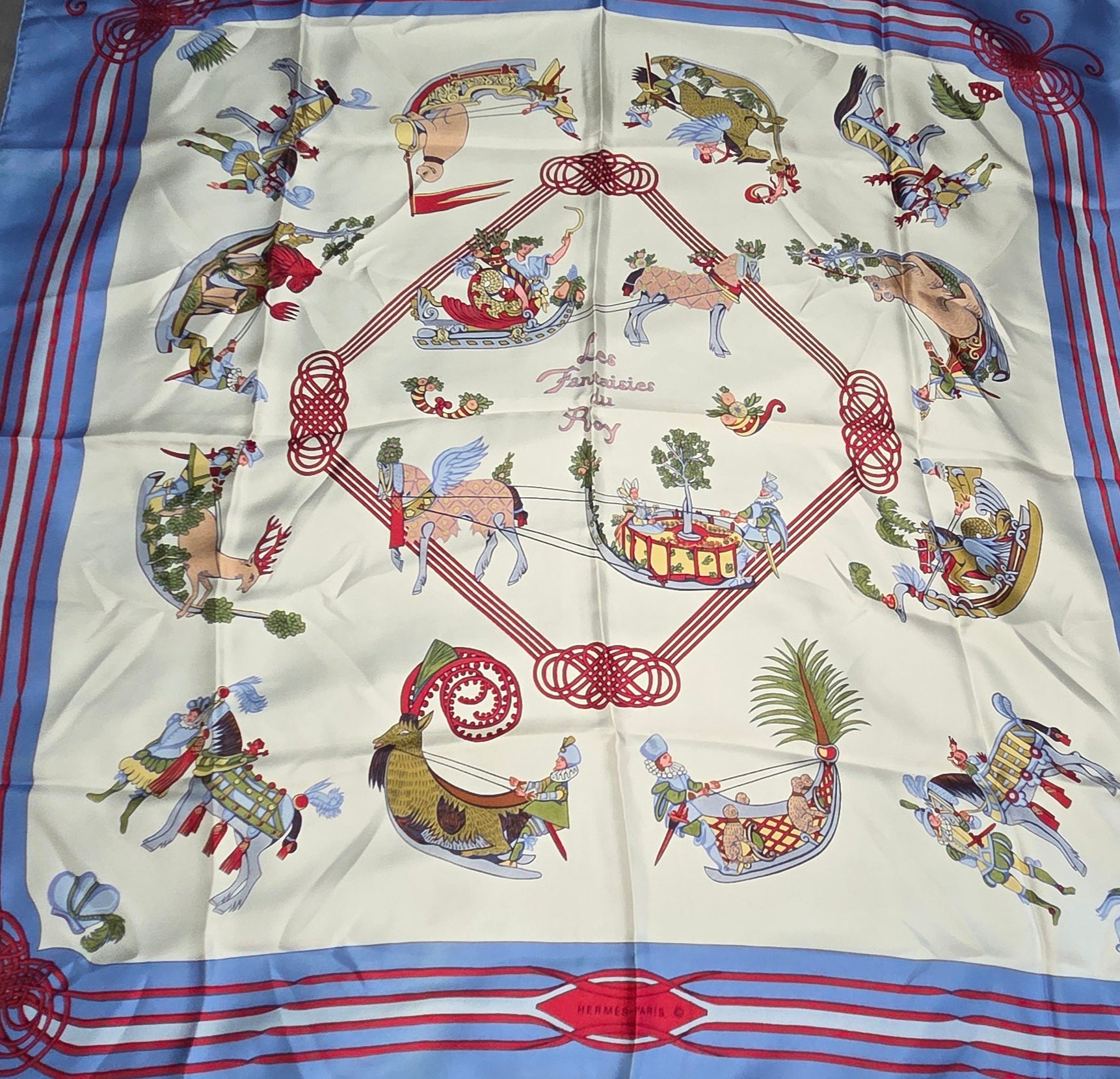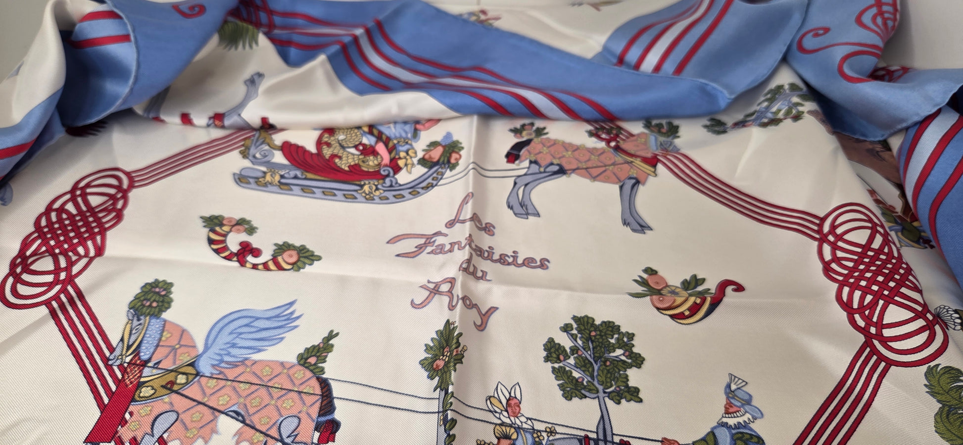 Carré Hermès en twill de soie intitulé "les fantaisies du Roy". Signée Annie Faivre.