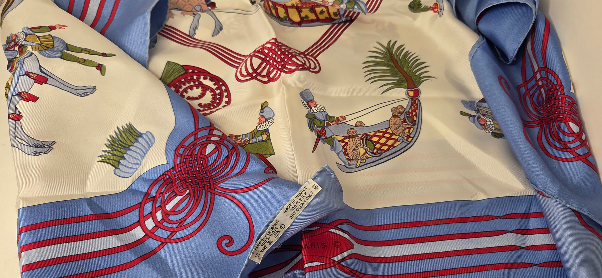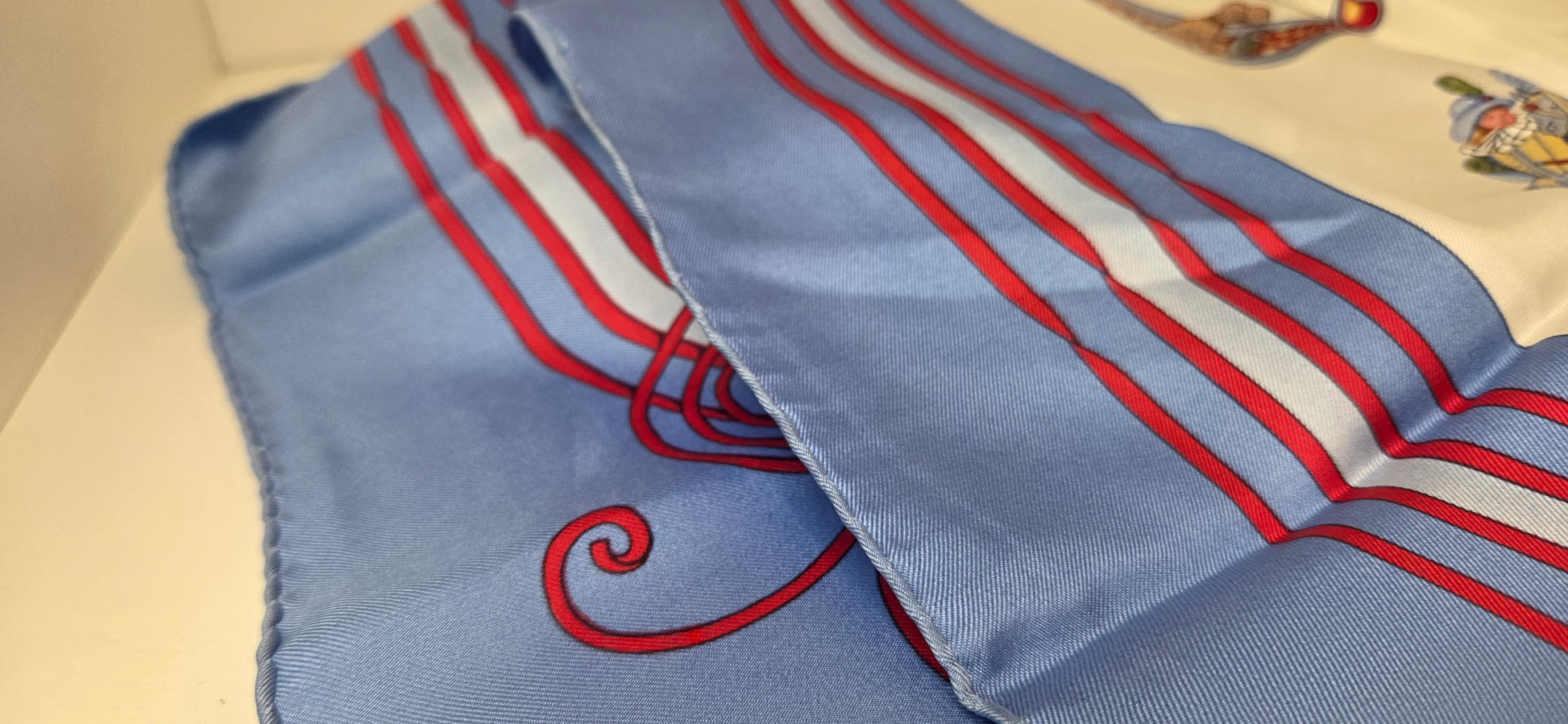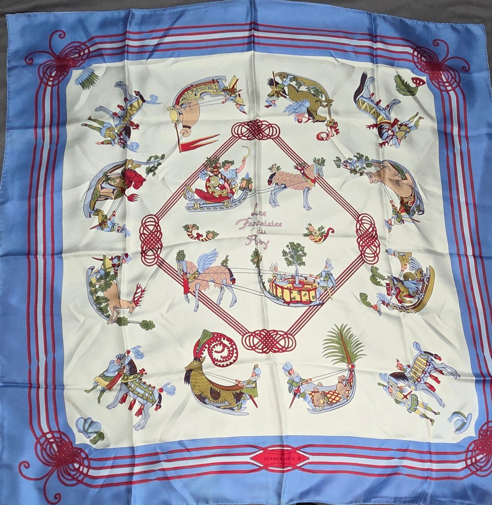 Carré Hermès en twill de soie intitulé "les fantaisies du Roy". Signée Annie Faivre.