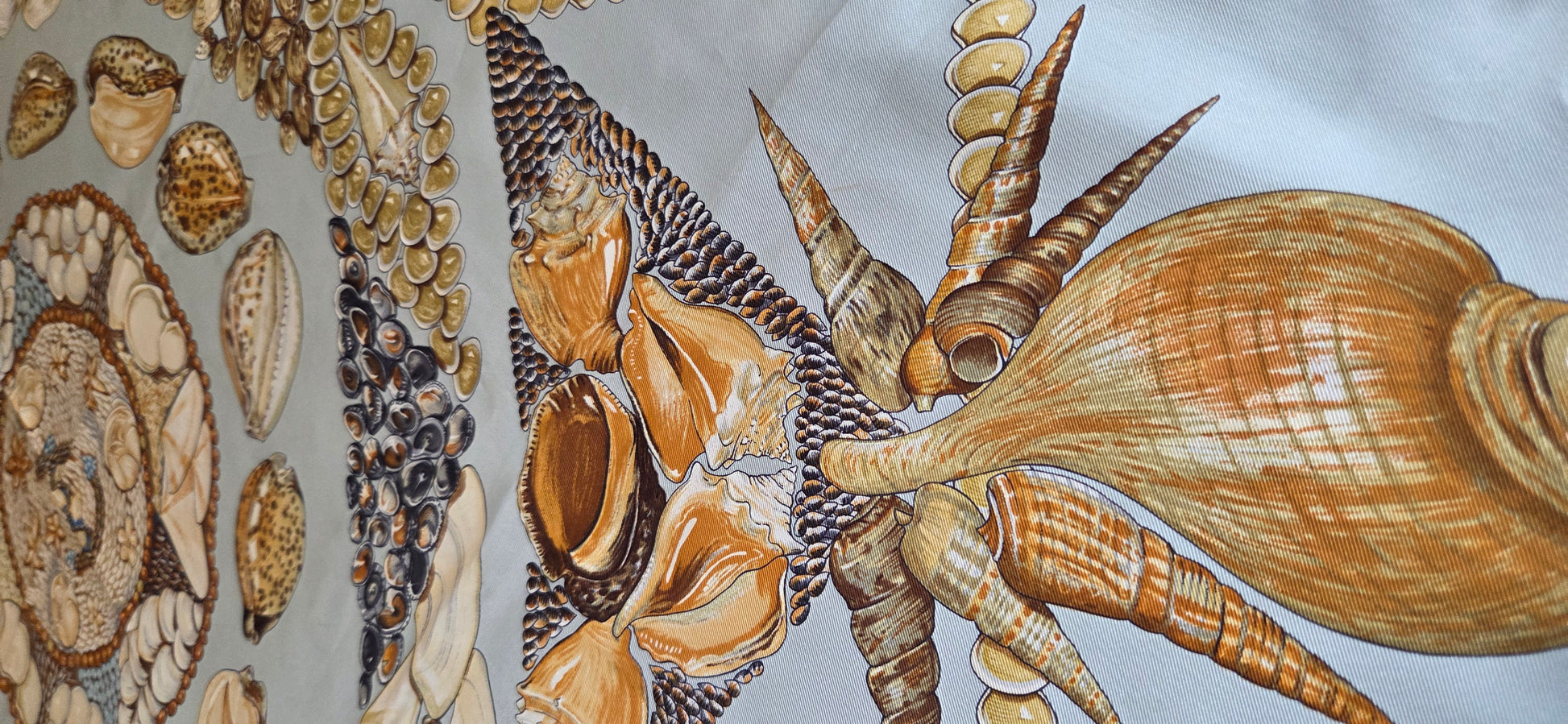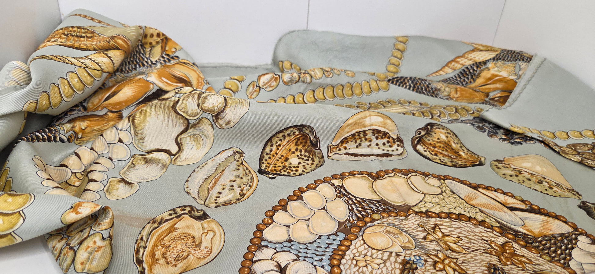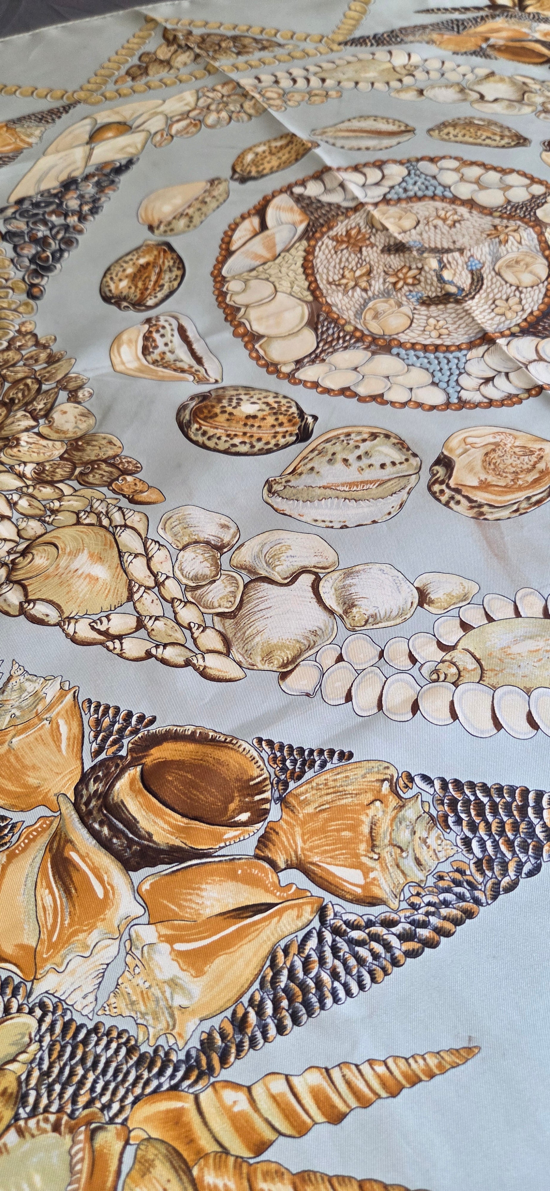 dans les tons vert d'eau et ocre, à motif de coquillages.