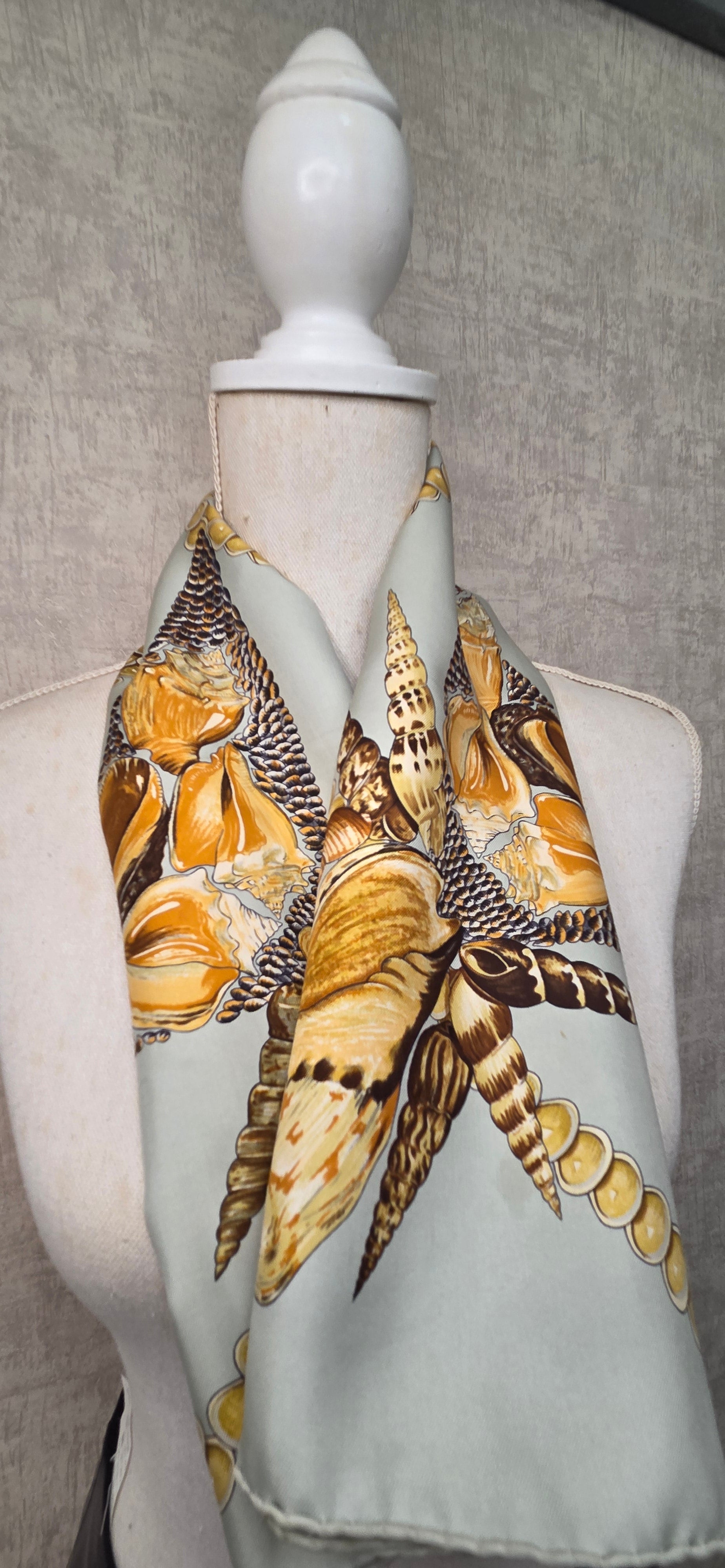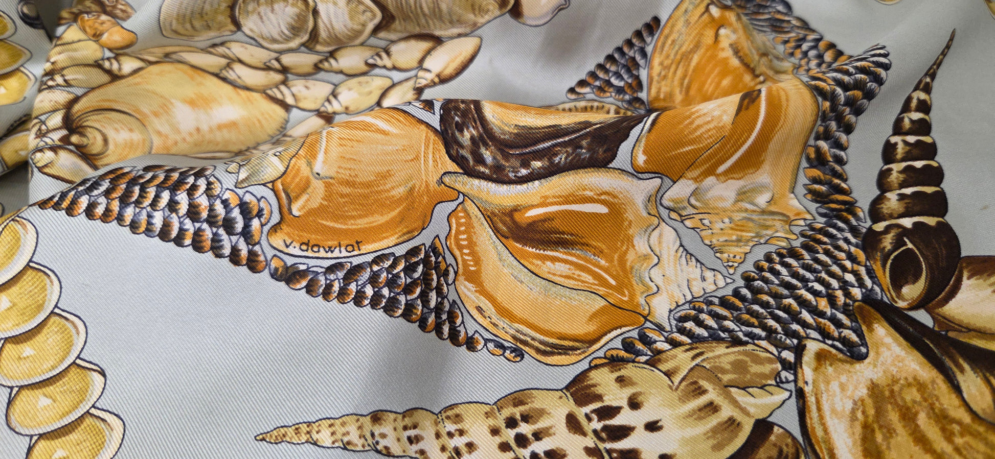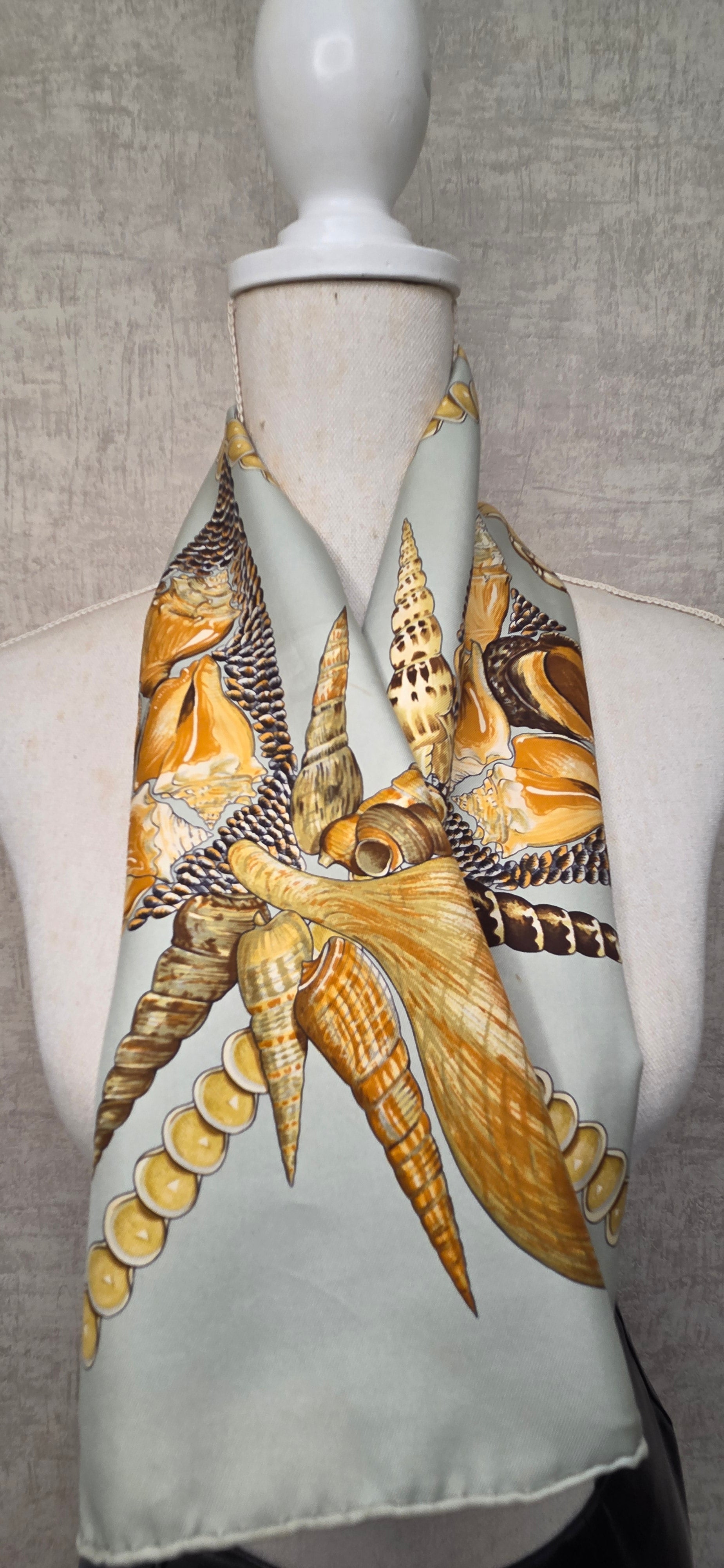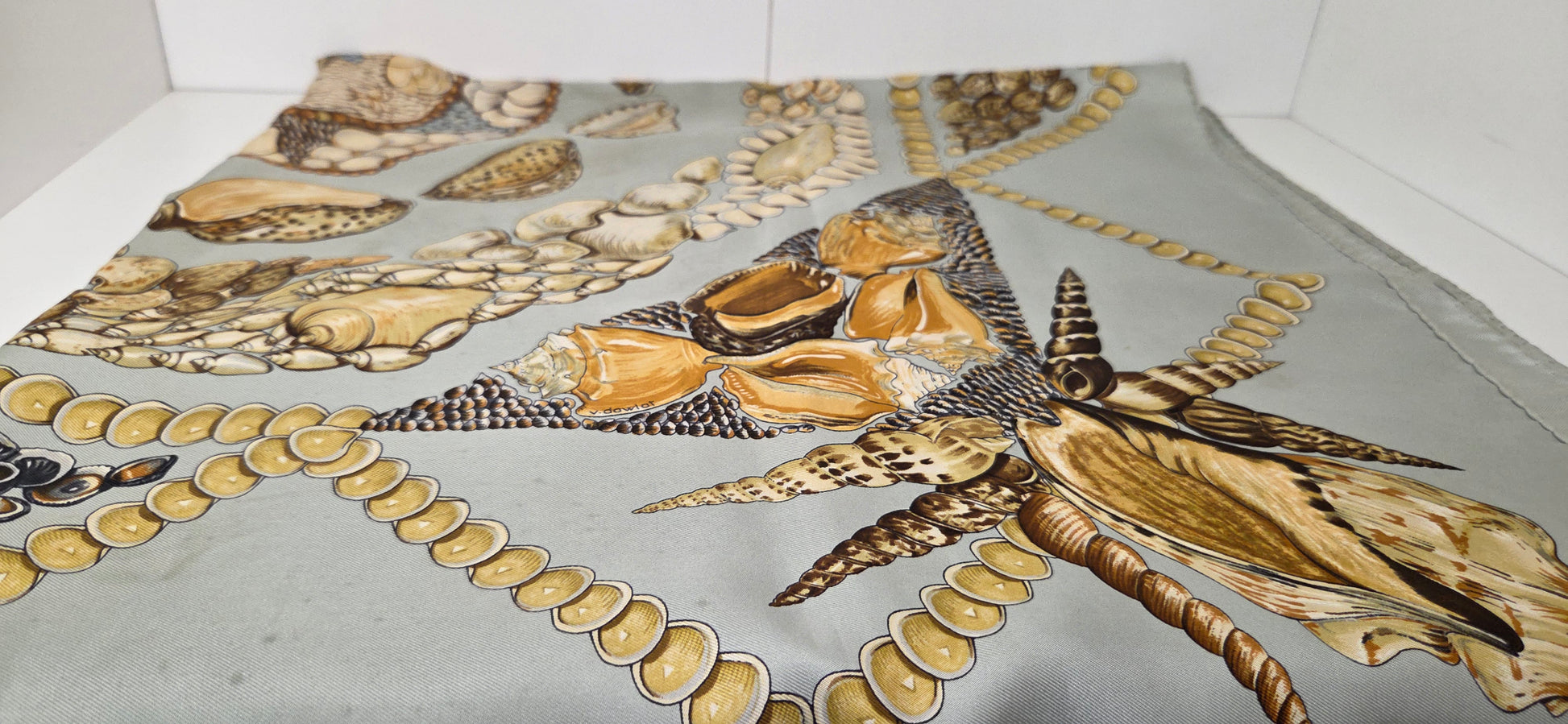 dans les tons vert d'eau et ocre, à motif de coquillages.