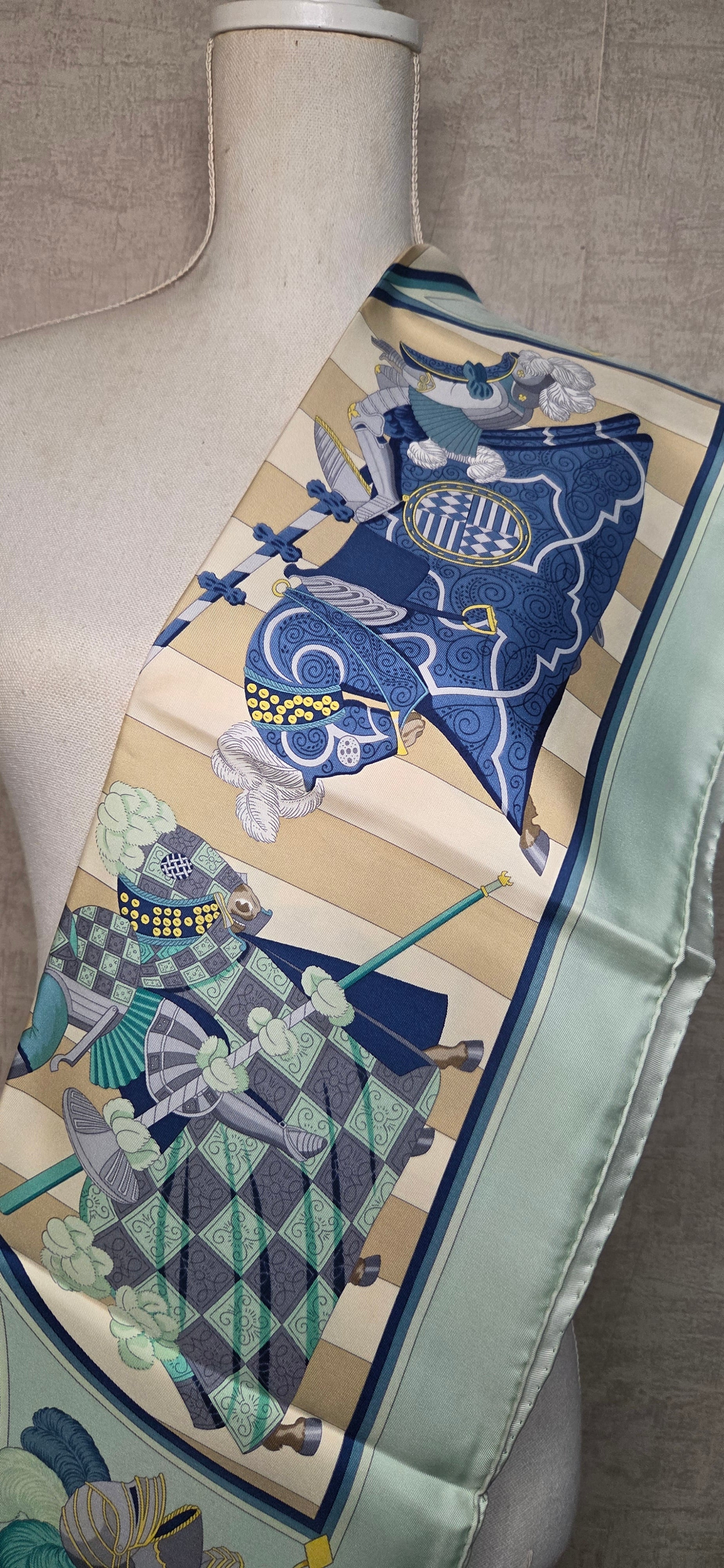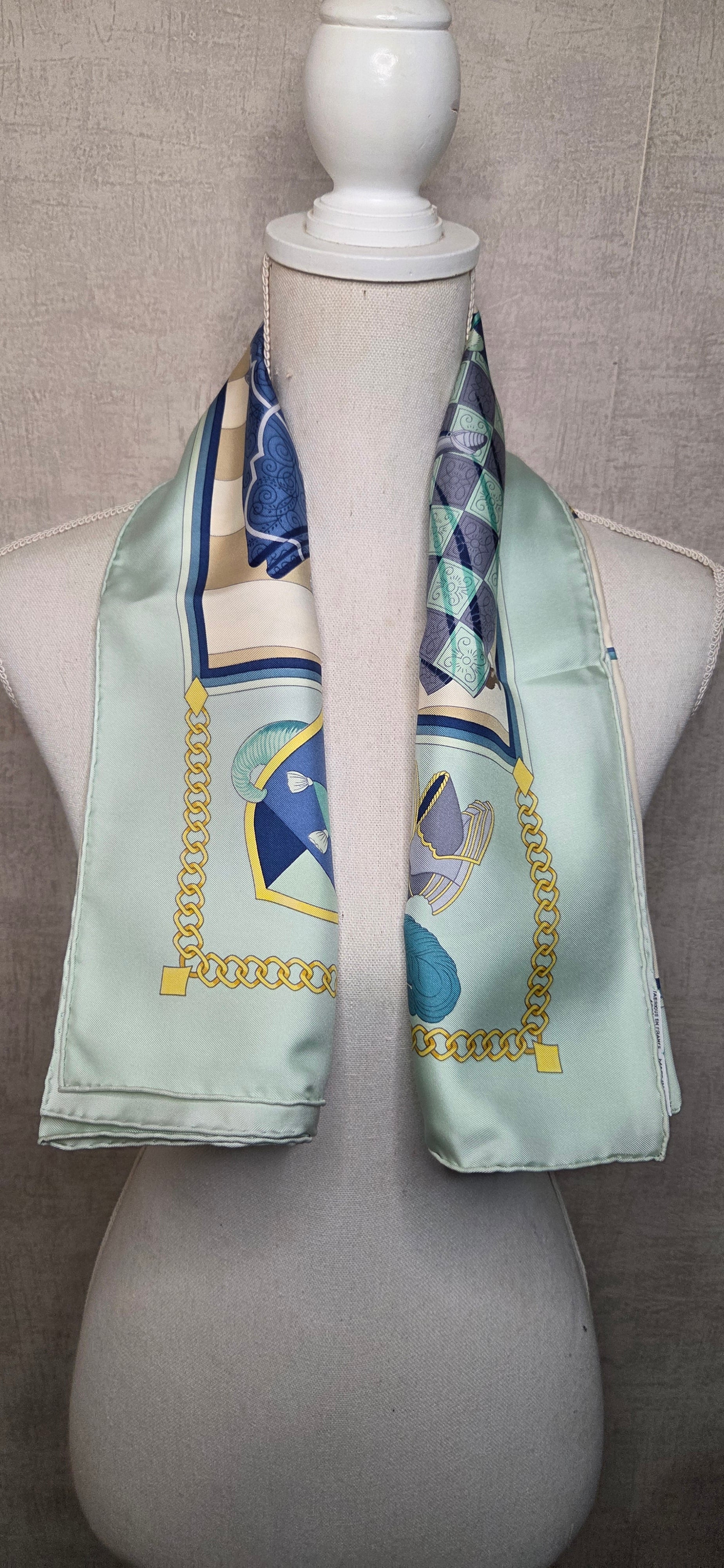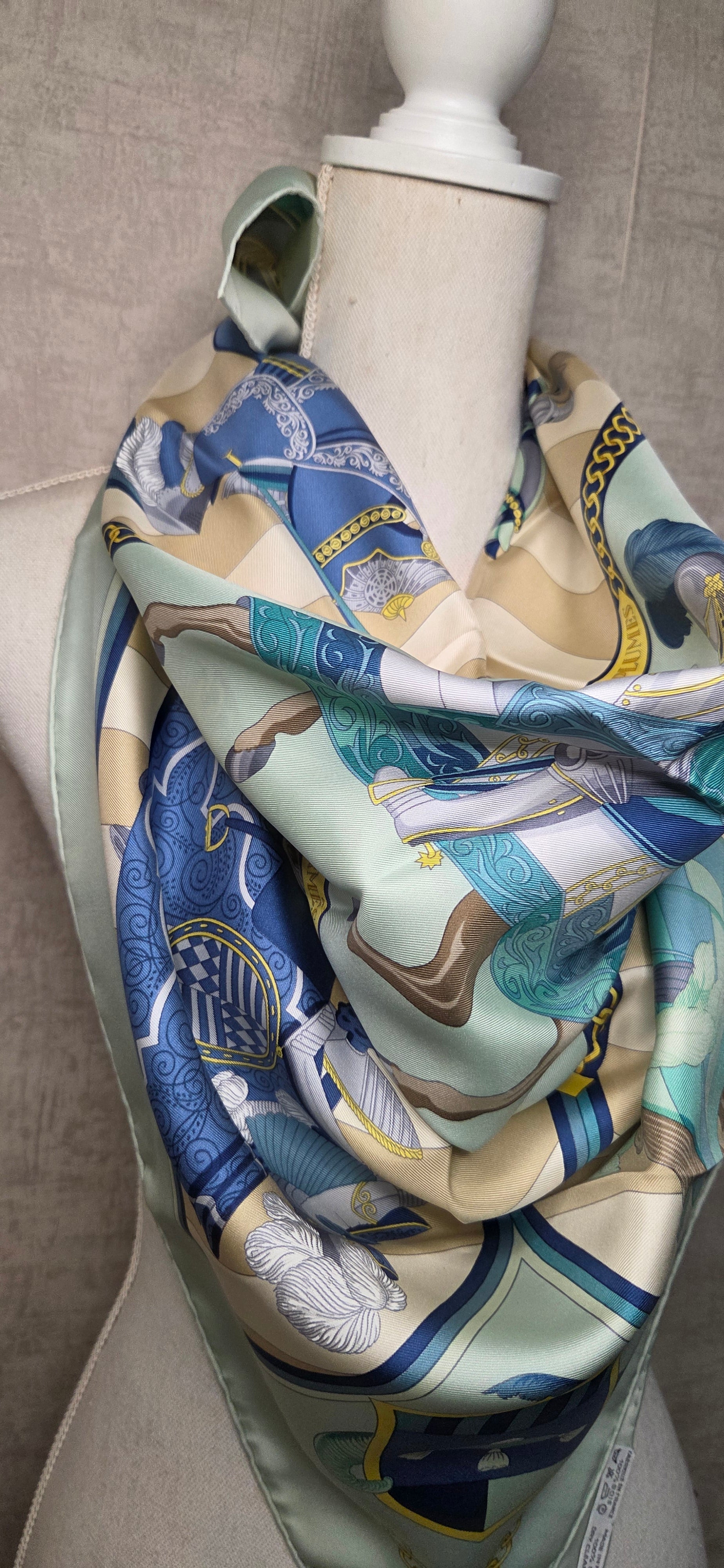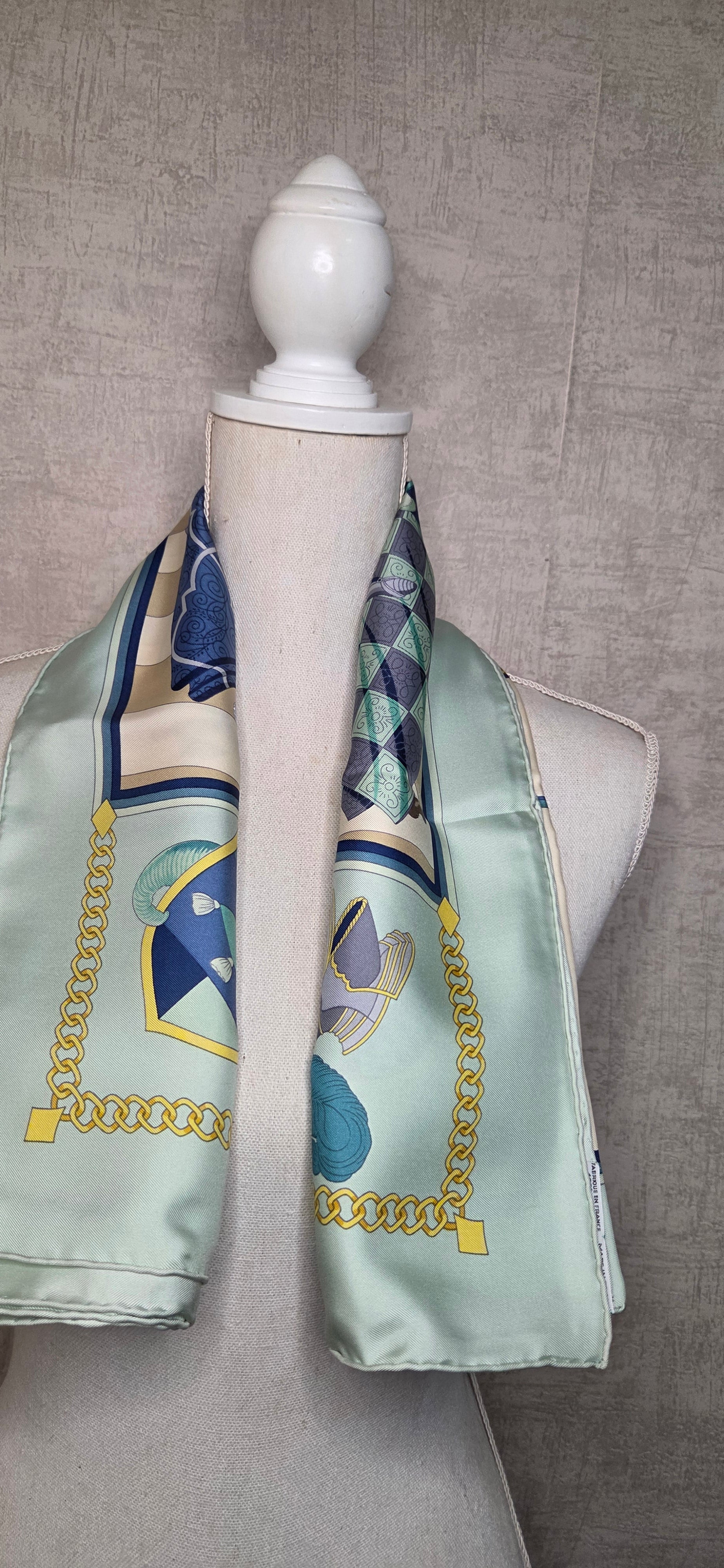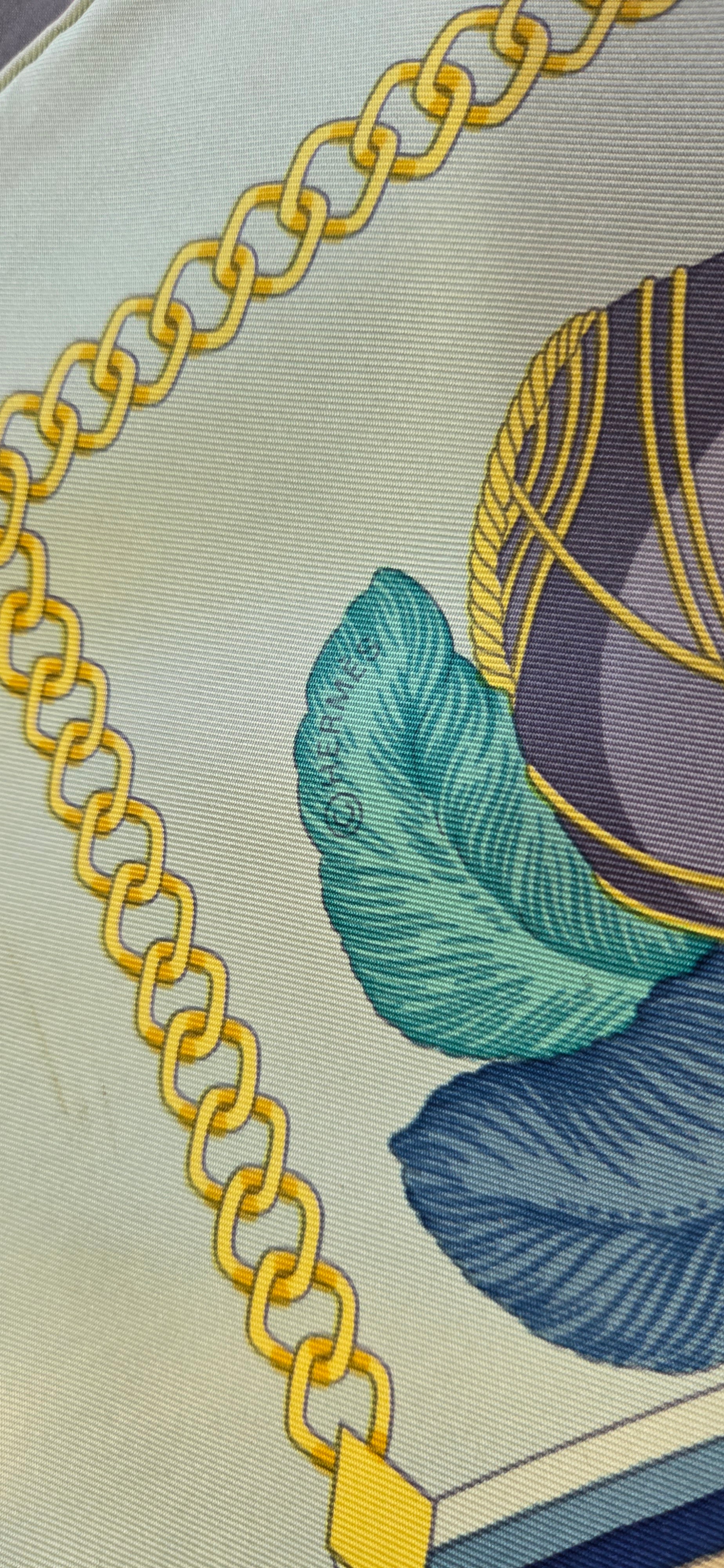 Carré Hermès en twill de soie intitulé "Chocs en Plumes " fait par Chrisiane Vauzelles.