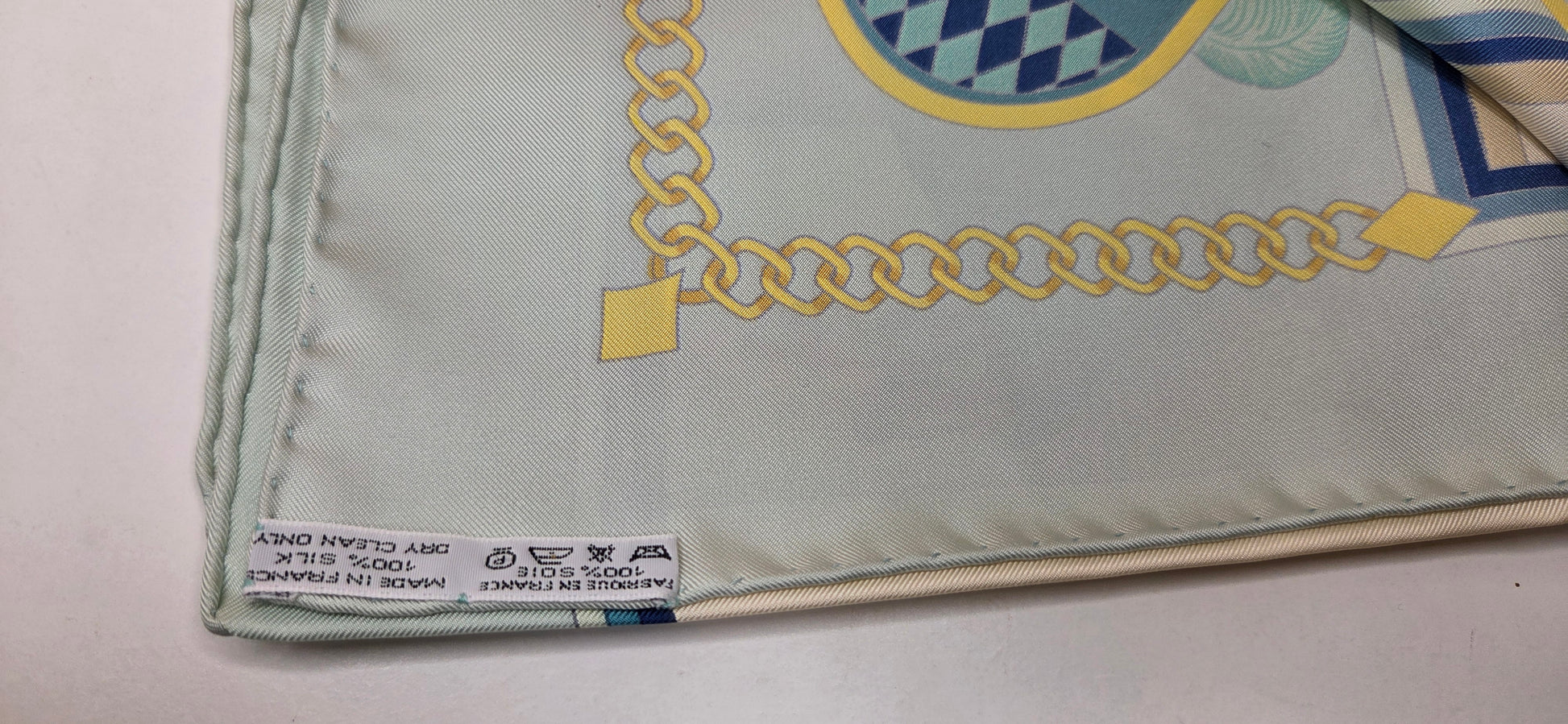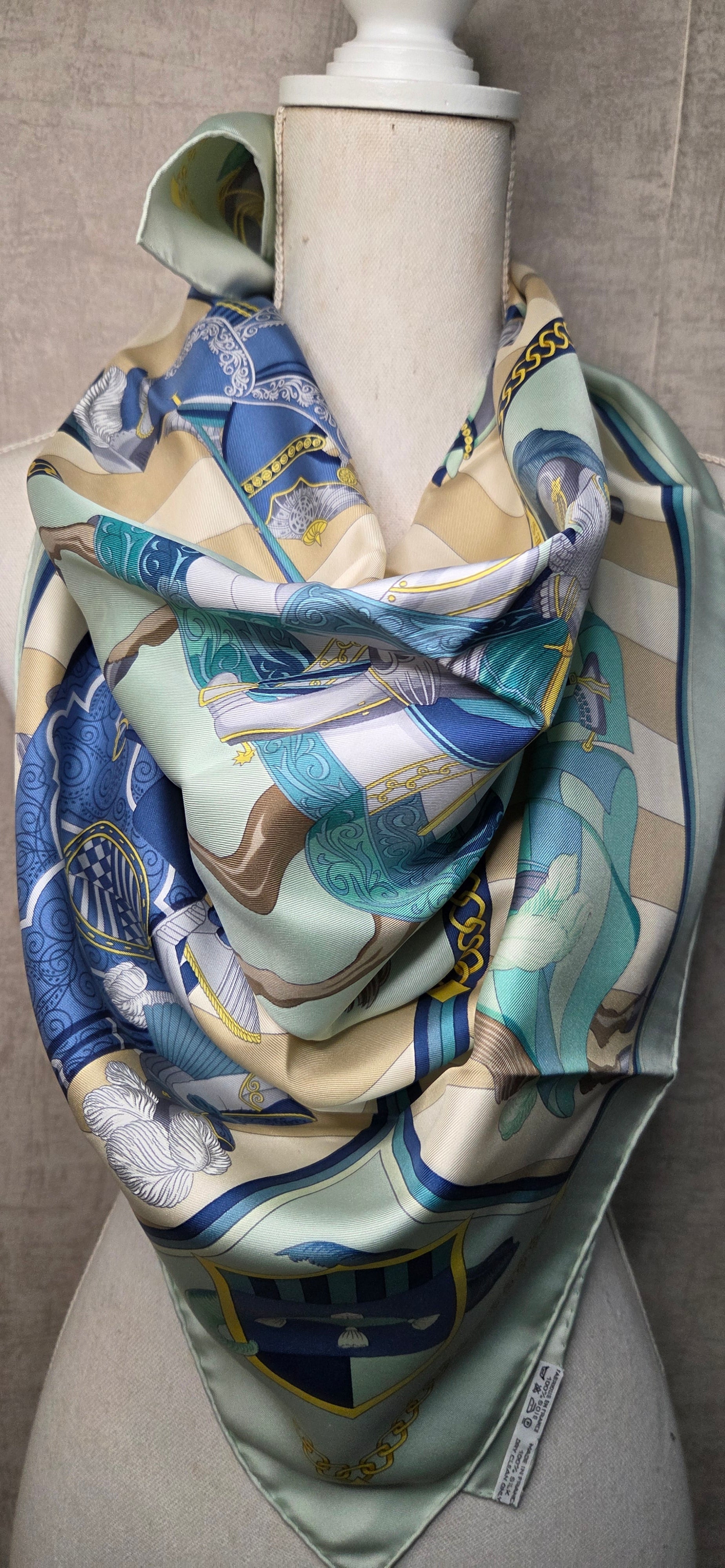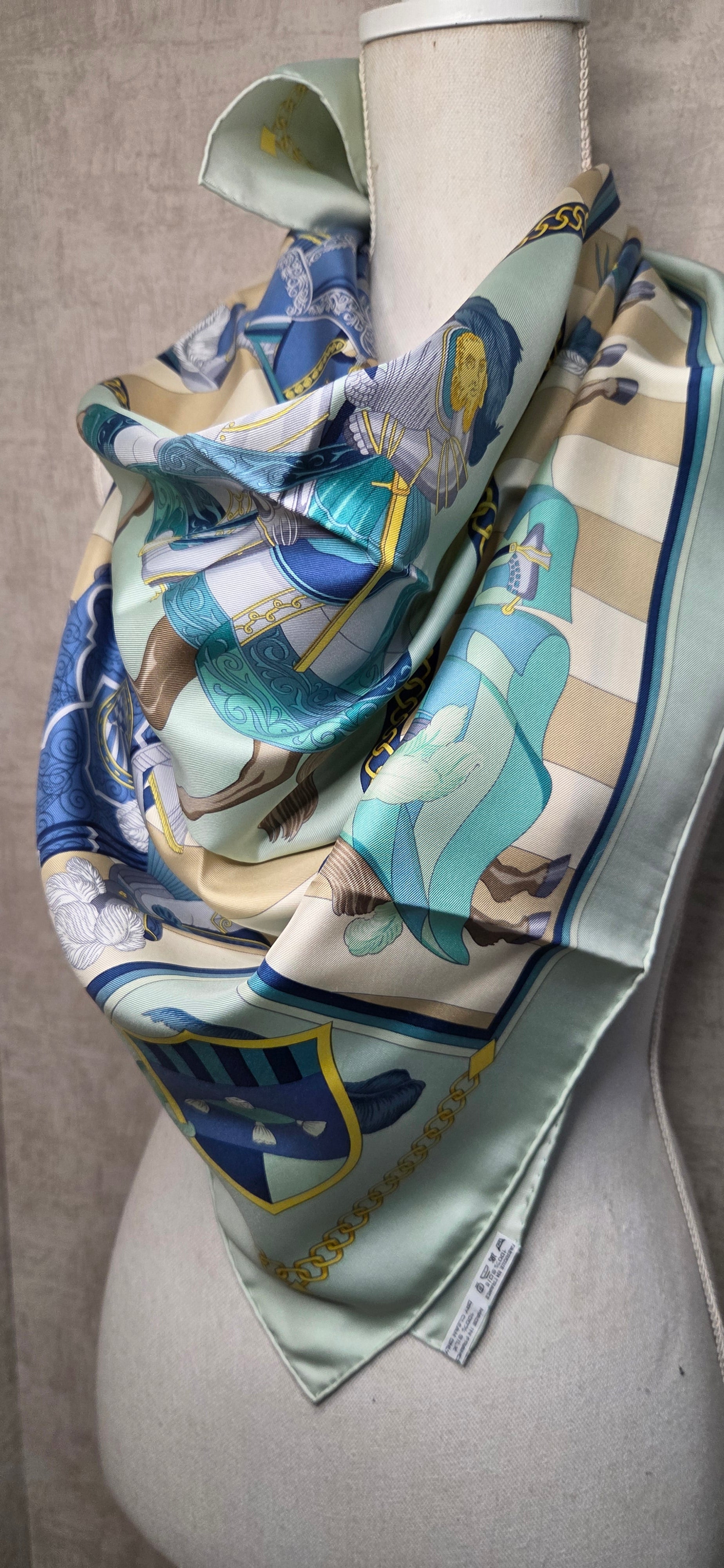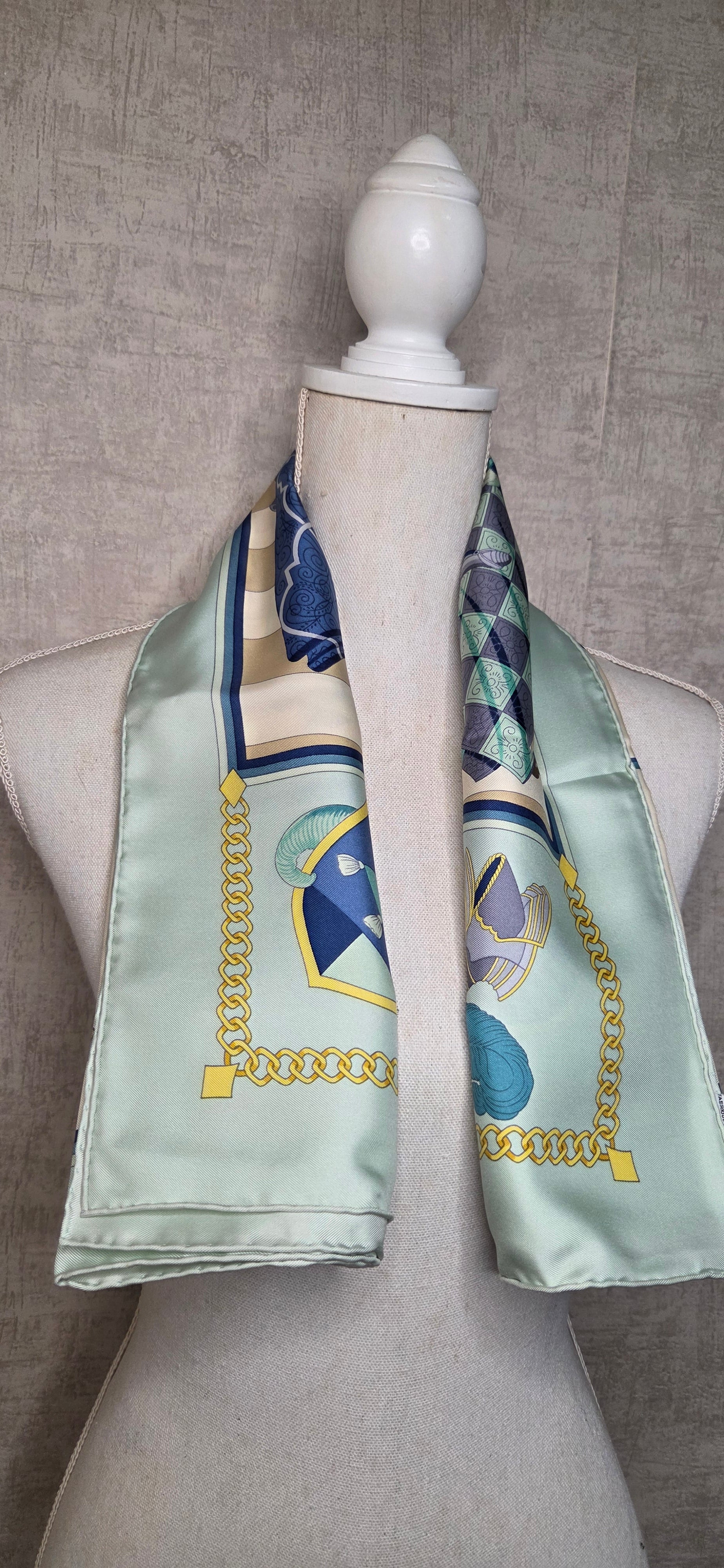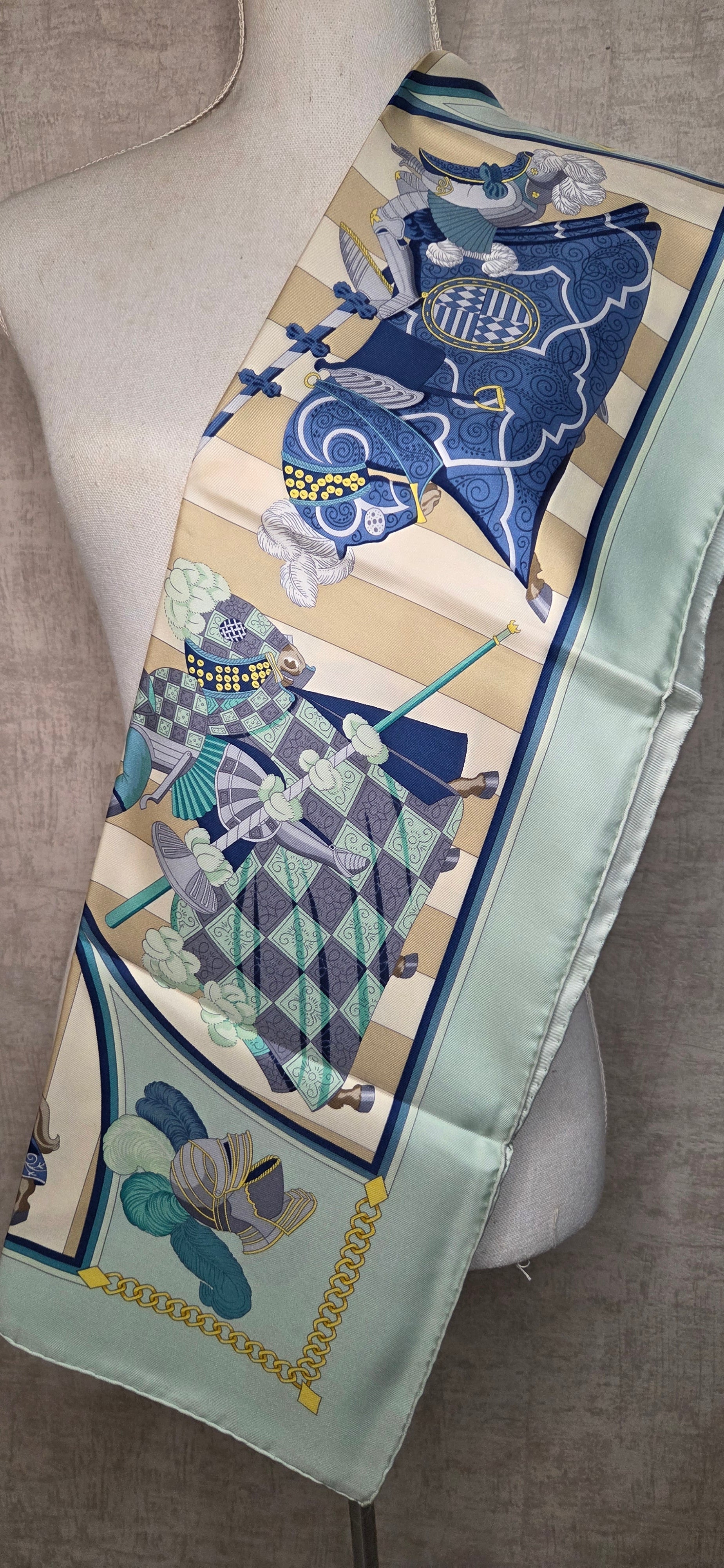 Carré Hermès en twill de soie intitulé "Chocs en Plumes " fait par Chrisiane Vauzelles.