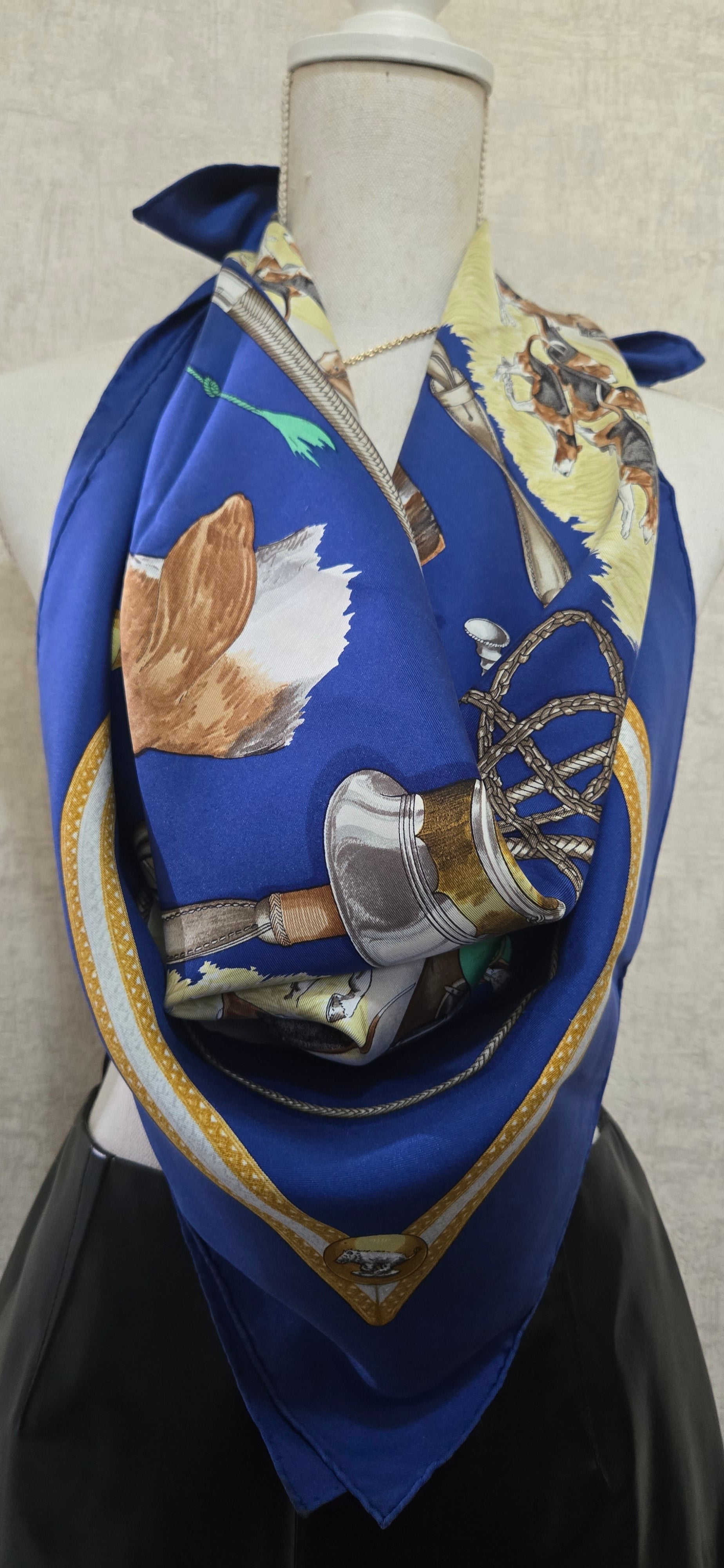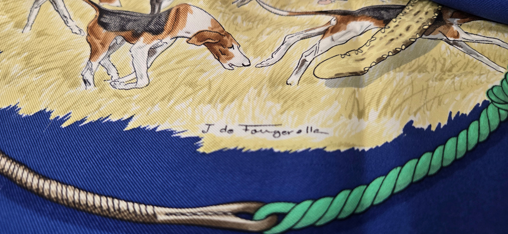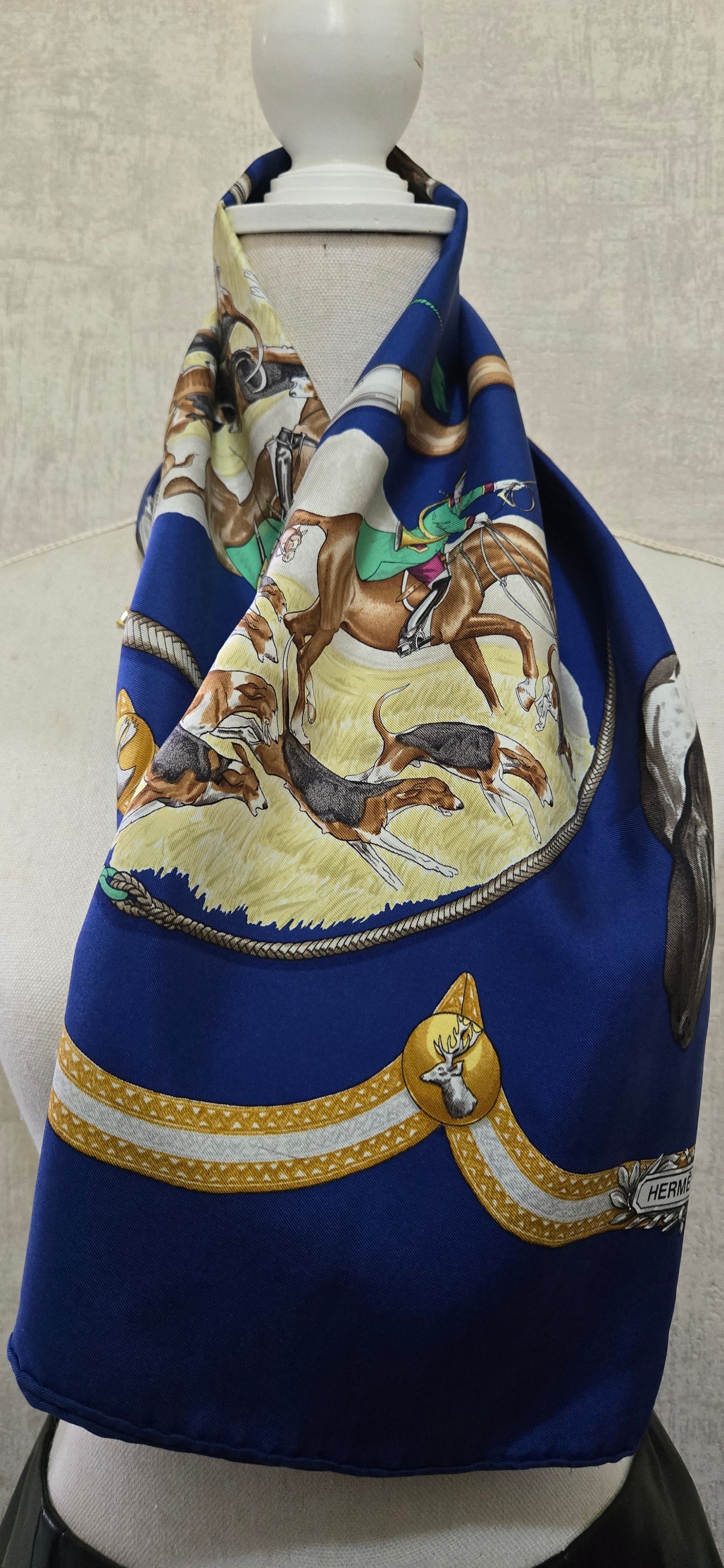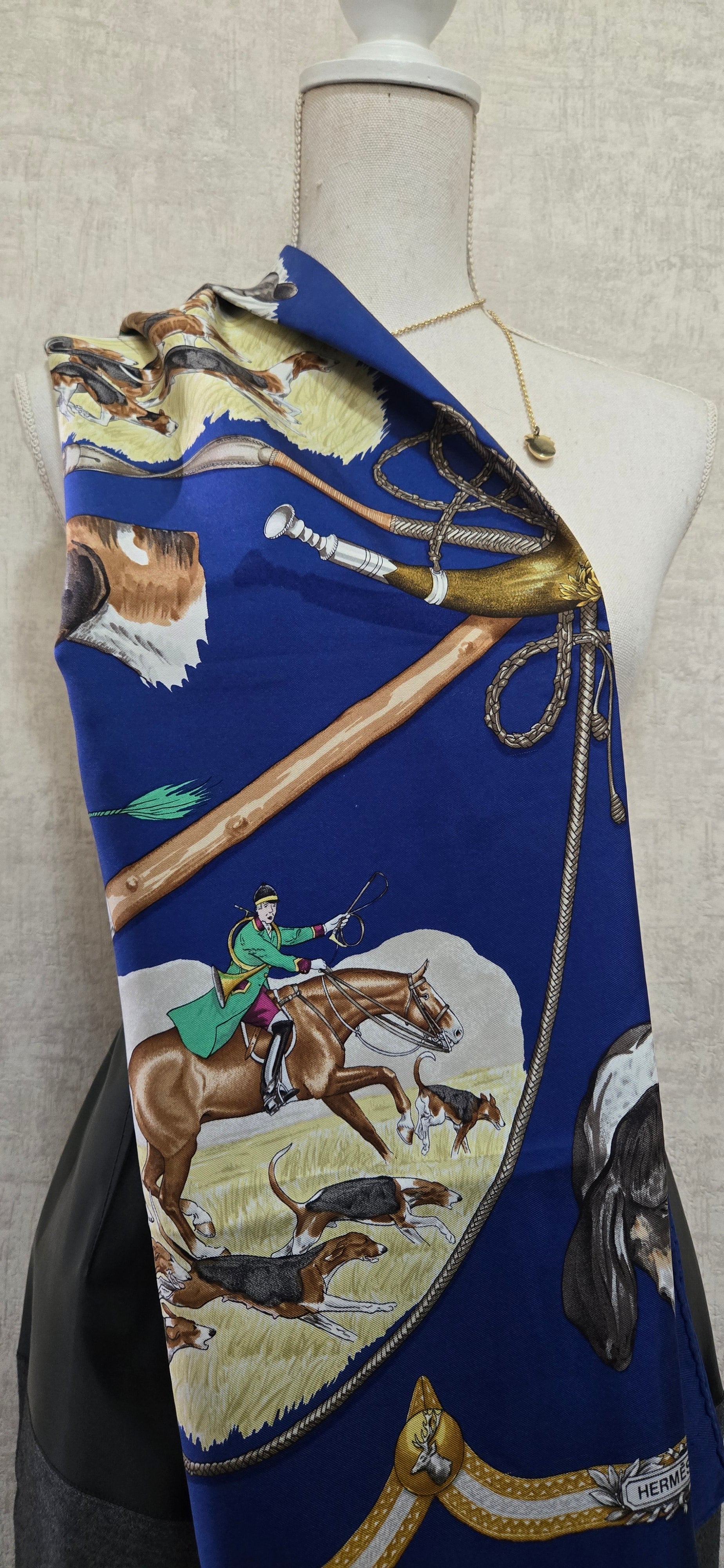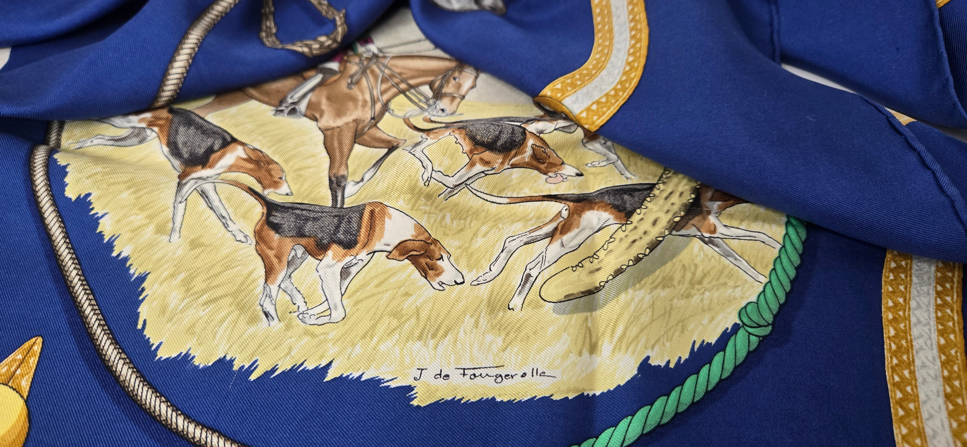 Carré Hermès "Le Laissee Courre" en twill de soie signé par J. de Fougerolles en excellent état .