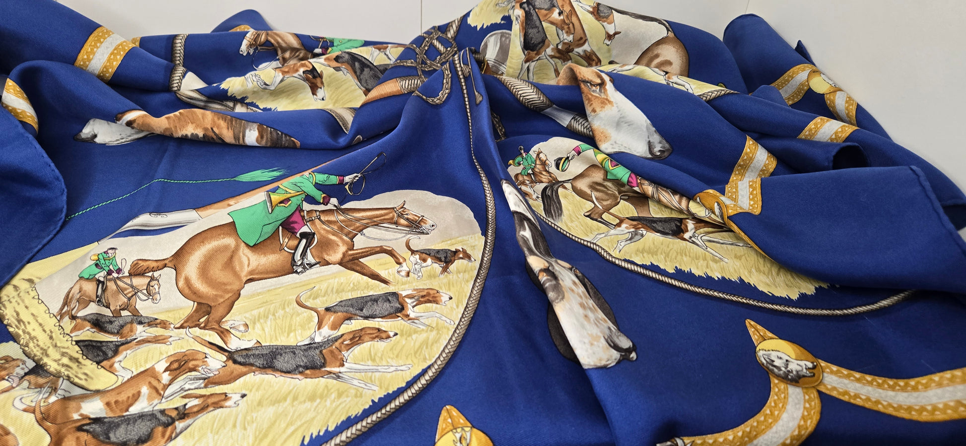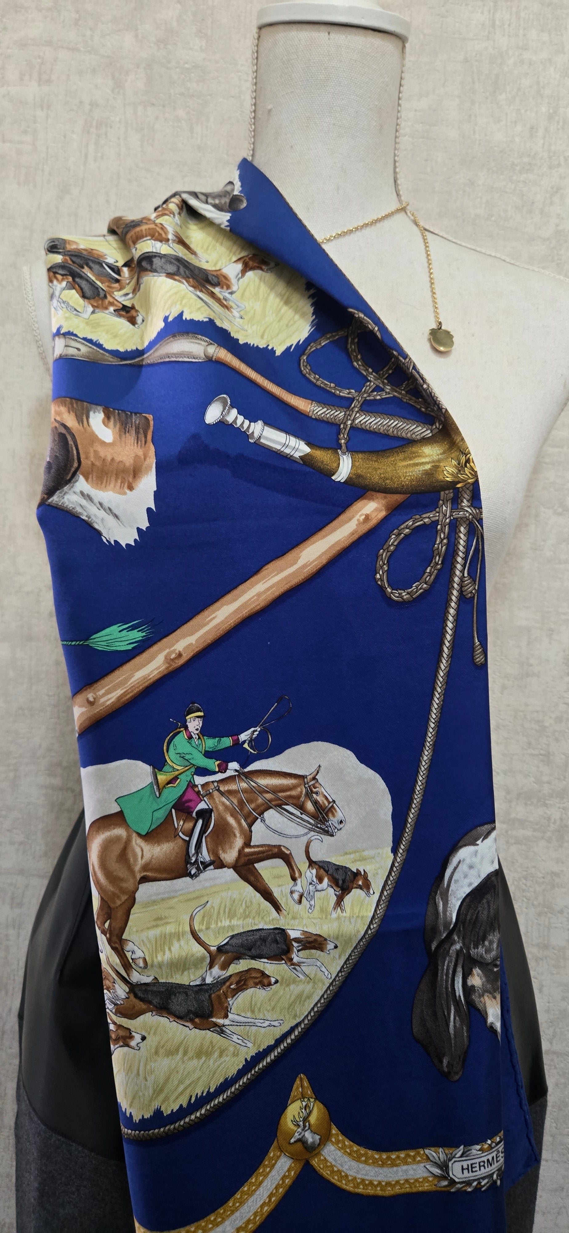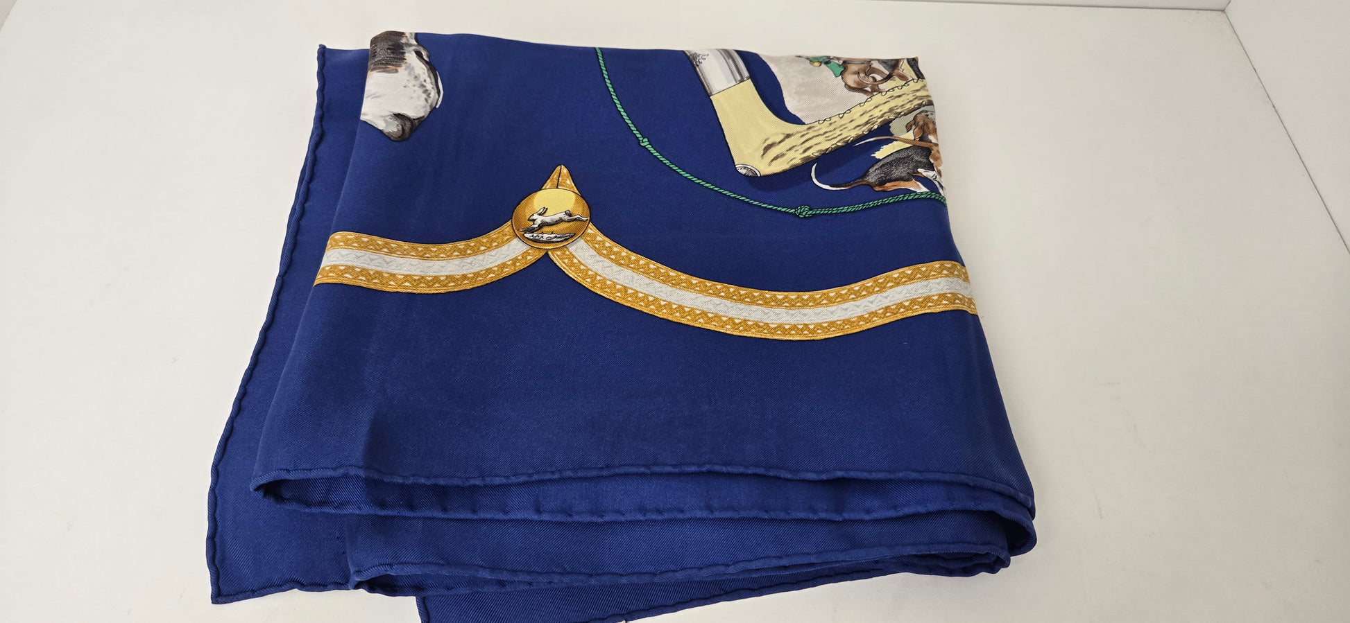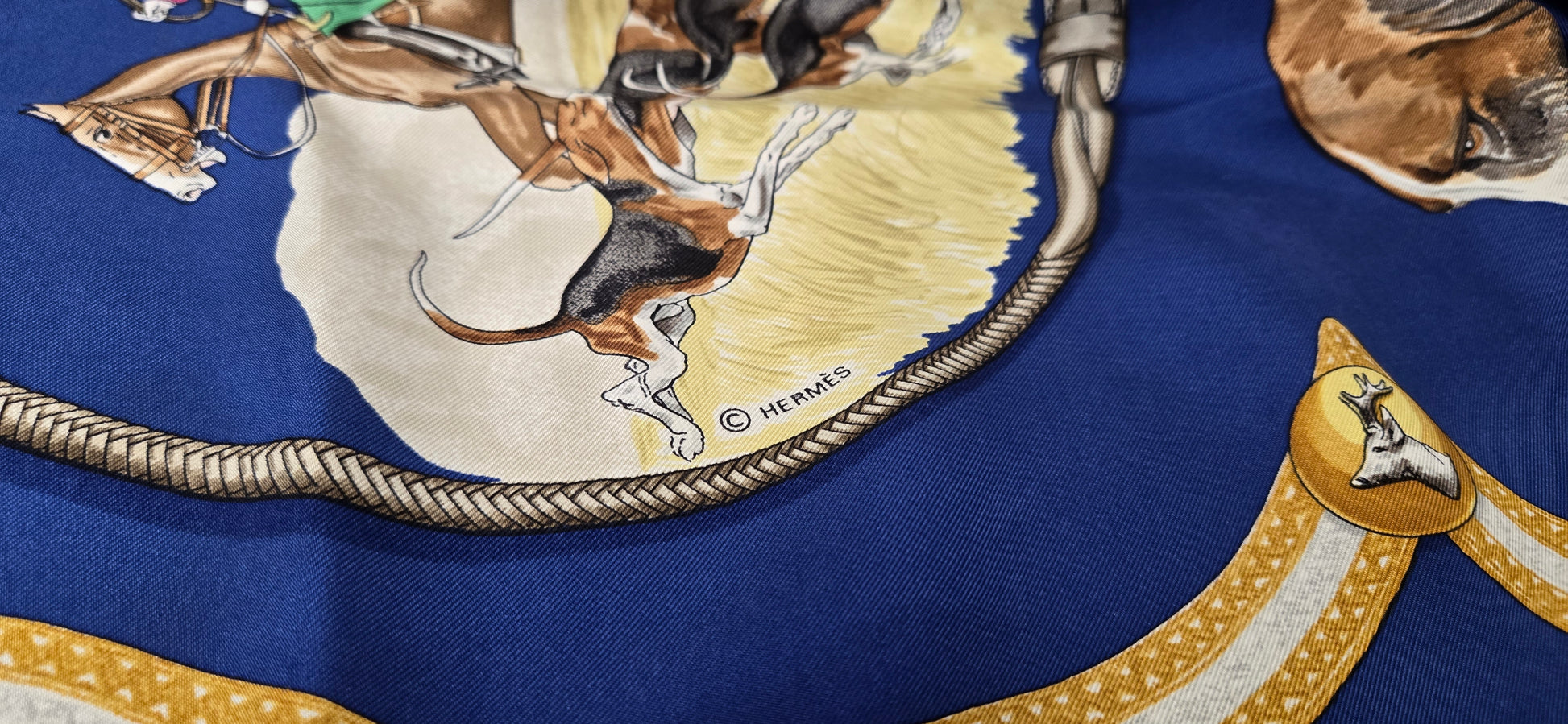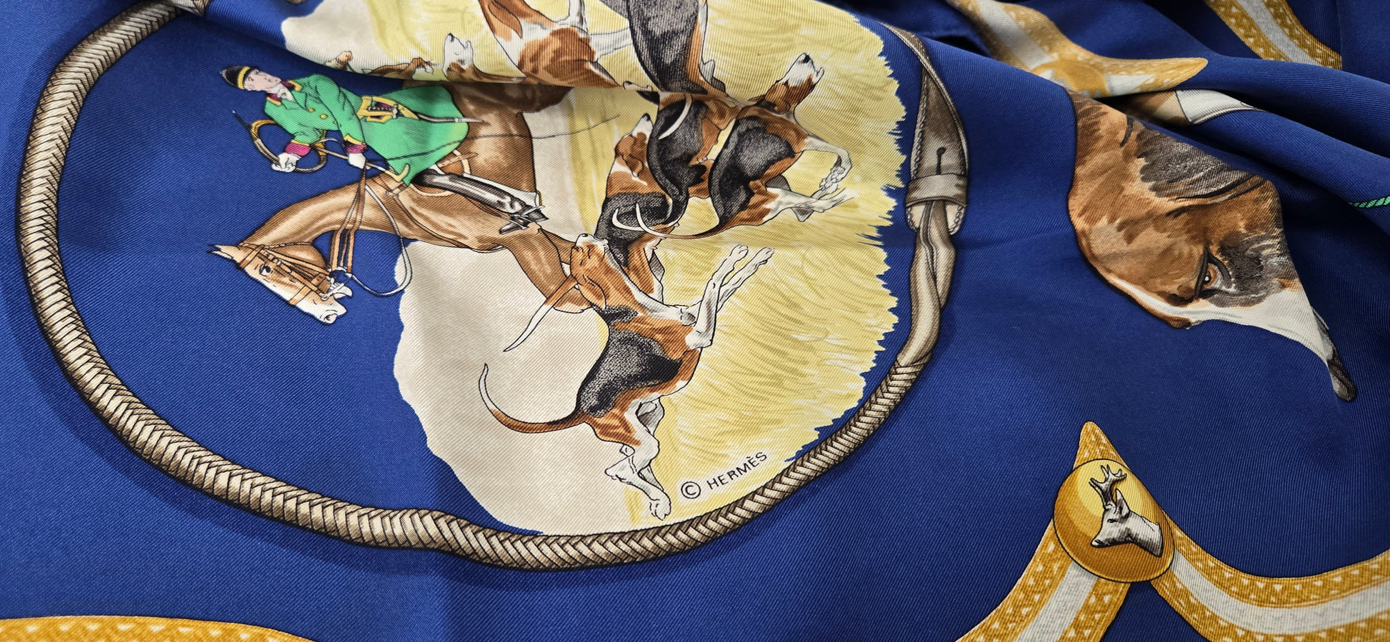 Carré Hermès "Le Laissee Courre" en twill de soie signé par J. de Fougerolles en excellent état .