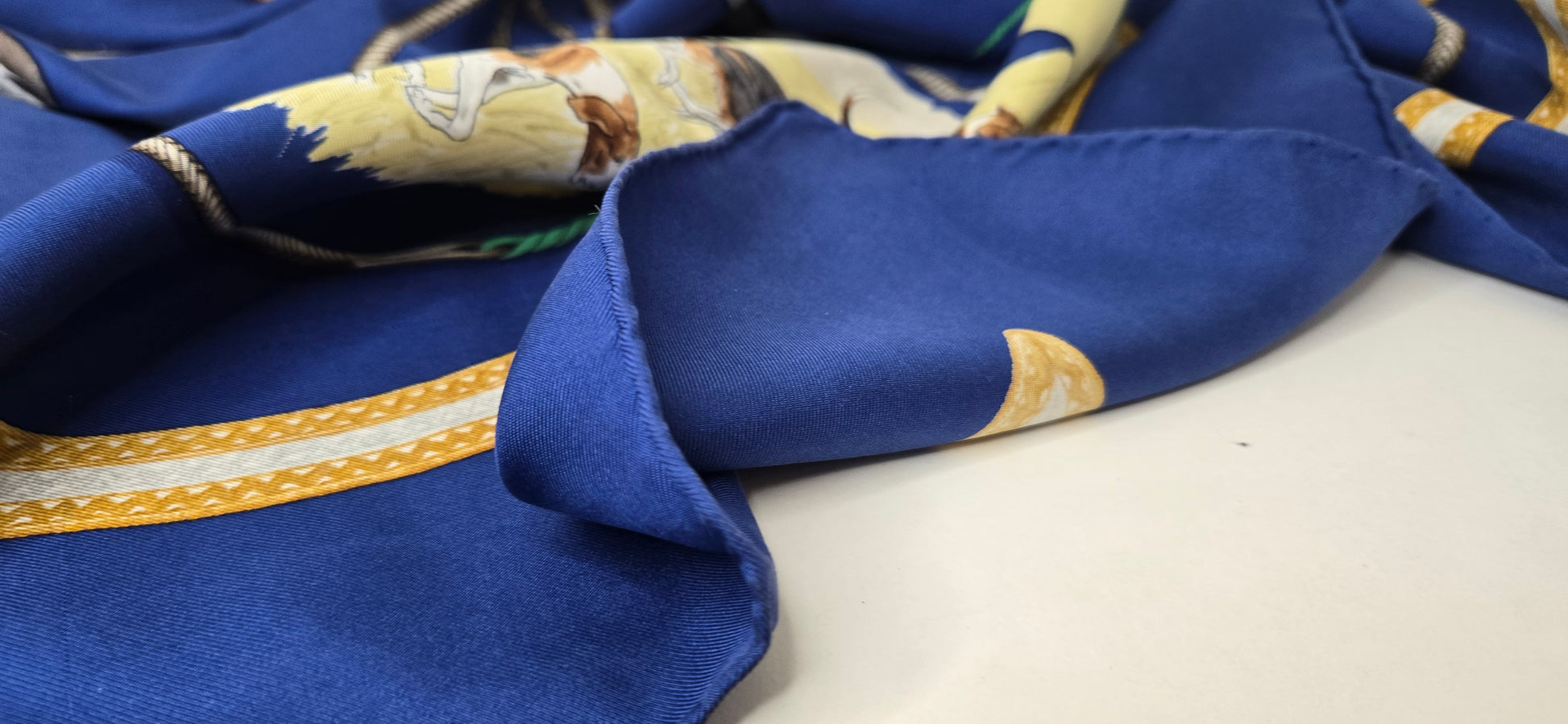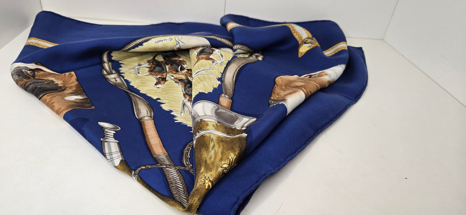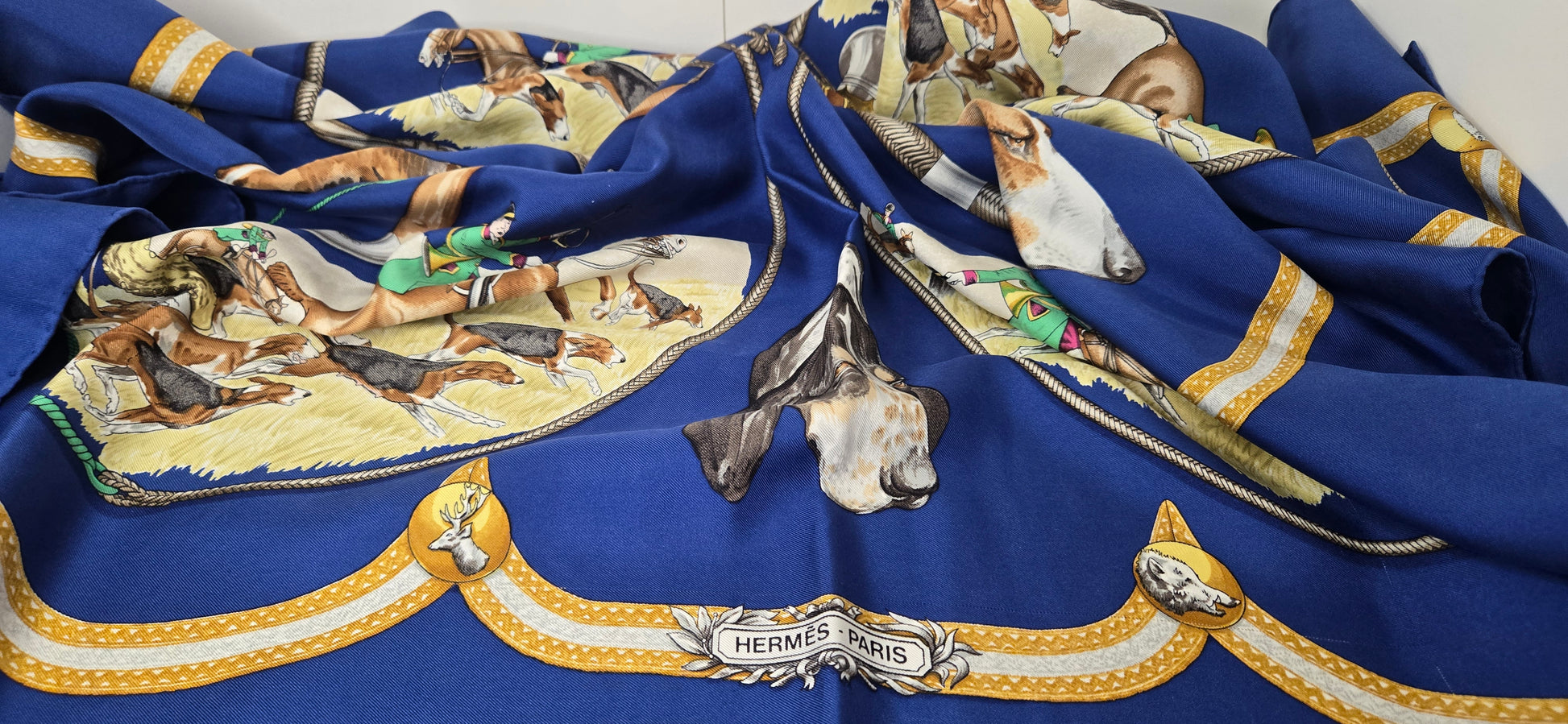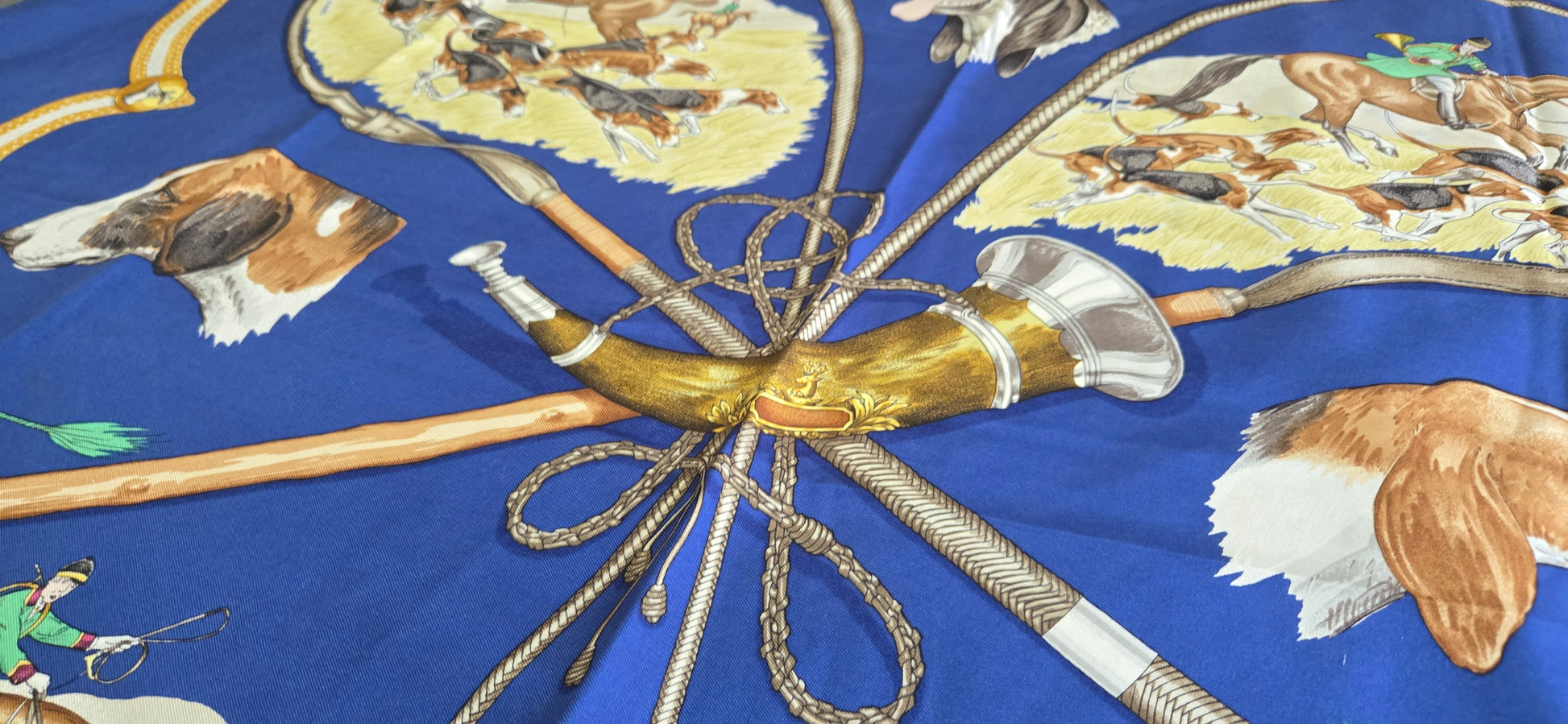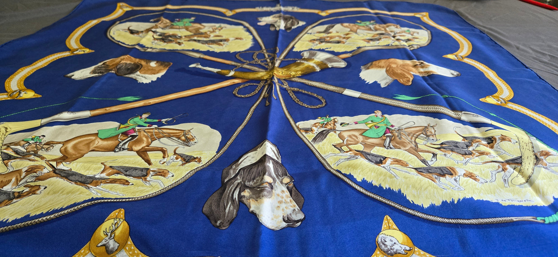 Carré Hermès "Le Laissee Courre" en twill de soie signé par J. de Fougerolles en excellent état .