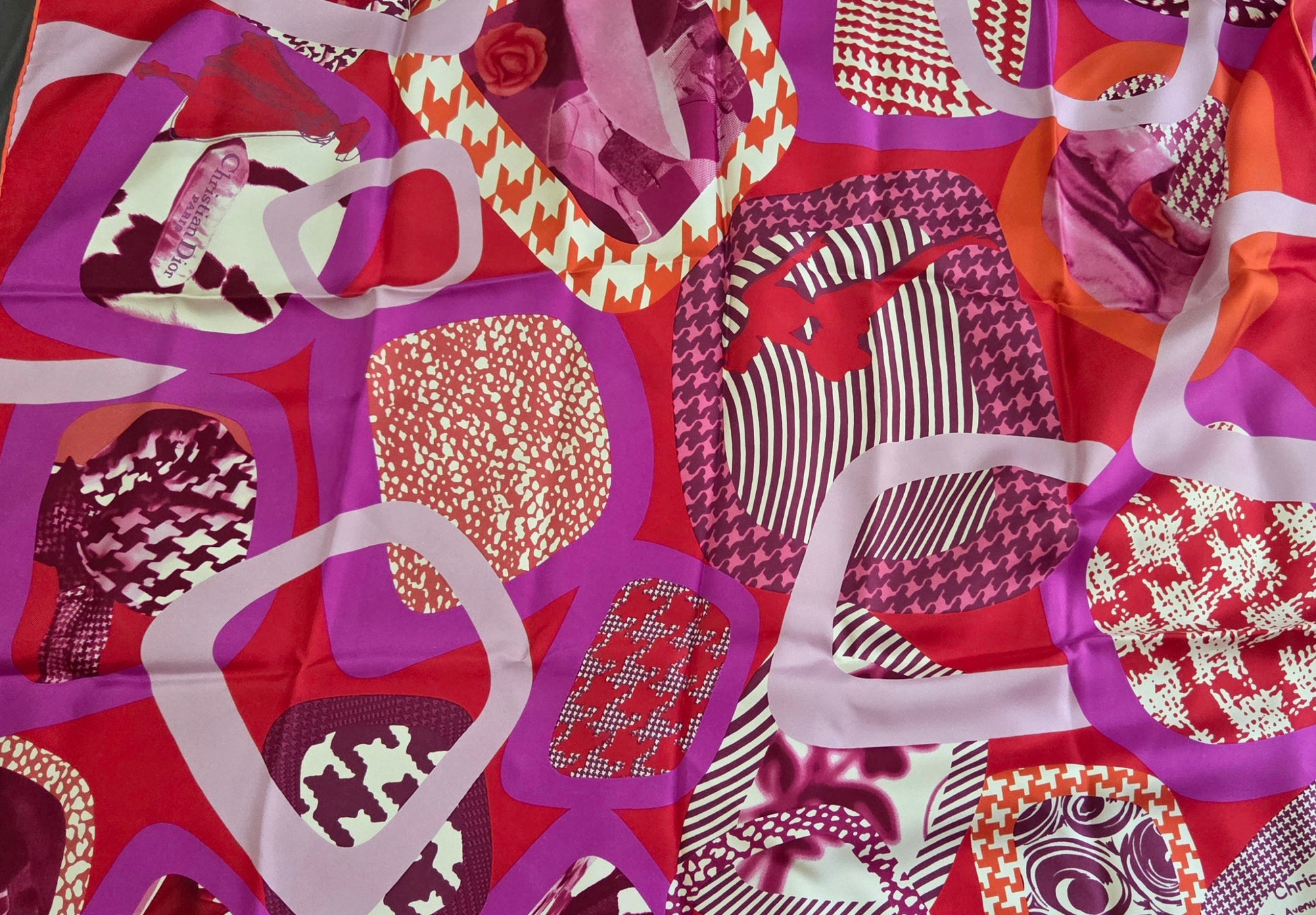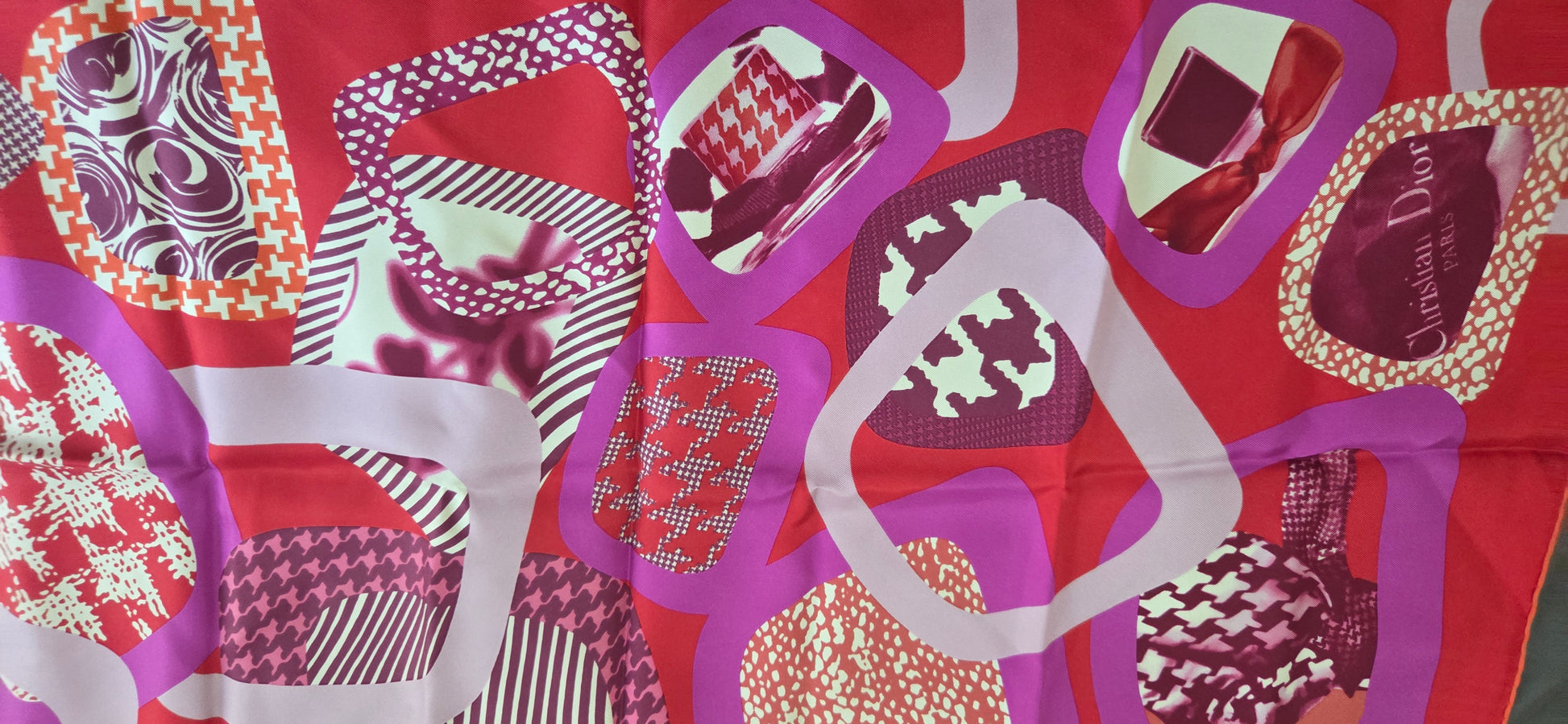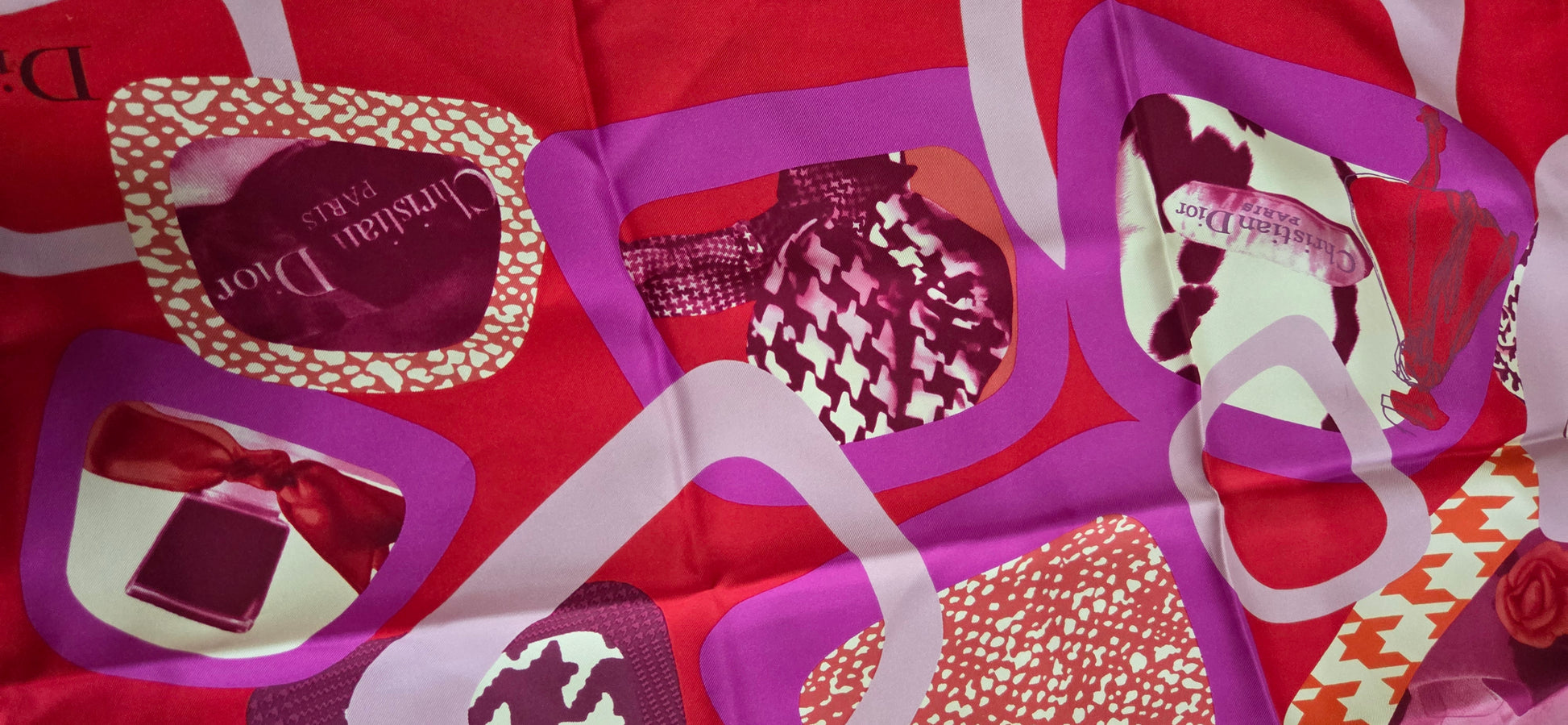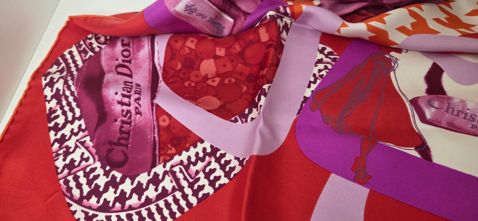 Carré Christian Dior en twill de soie imprimé de silhouettes et de motifs à dominante rouge , orange, fuchsia et beige.