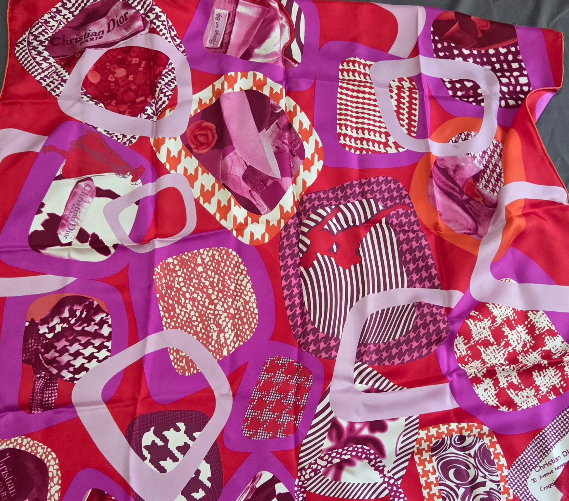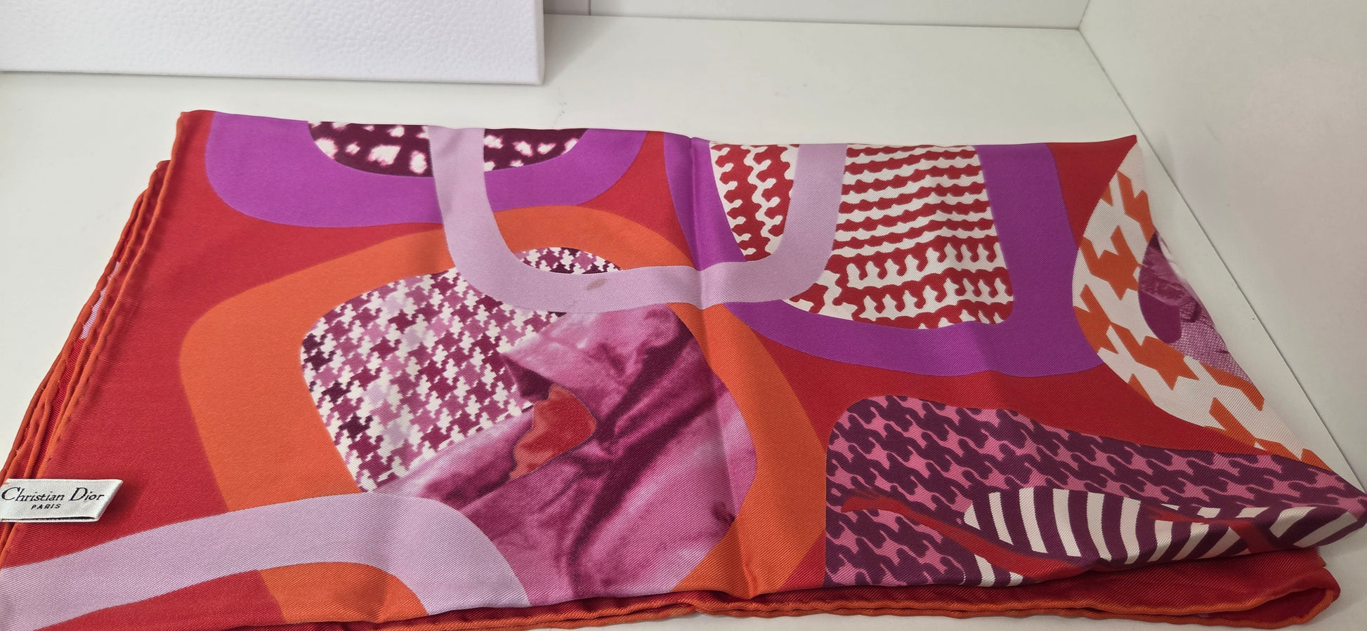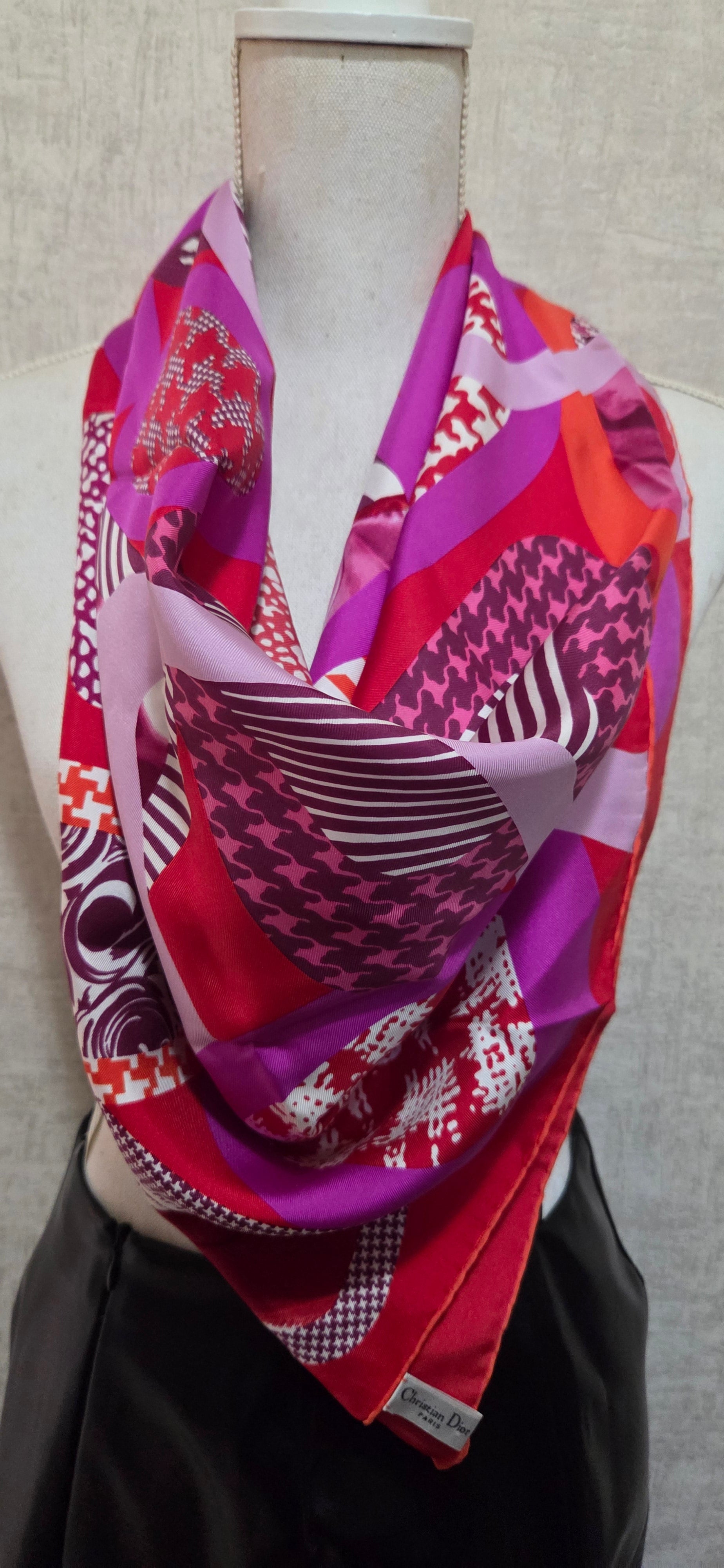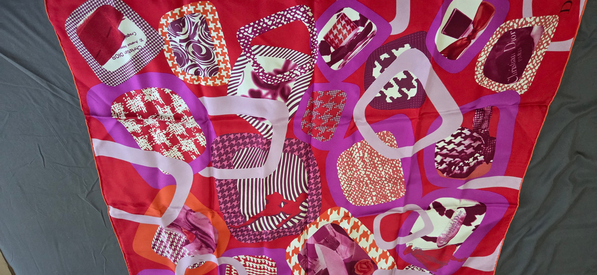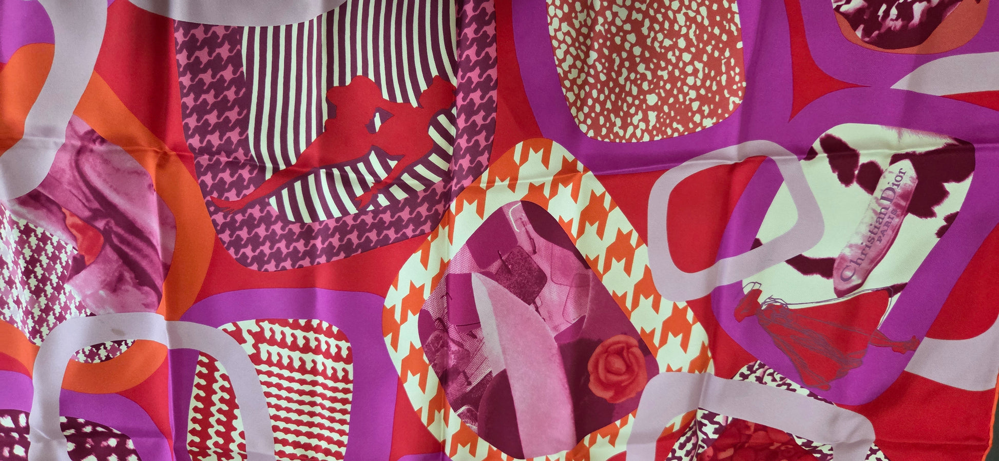 Carré Christian Dior en twill de soie imprimé de silhouettes et de motifs à dominante rouge , orange, fuchsia et beige.