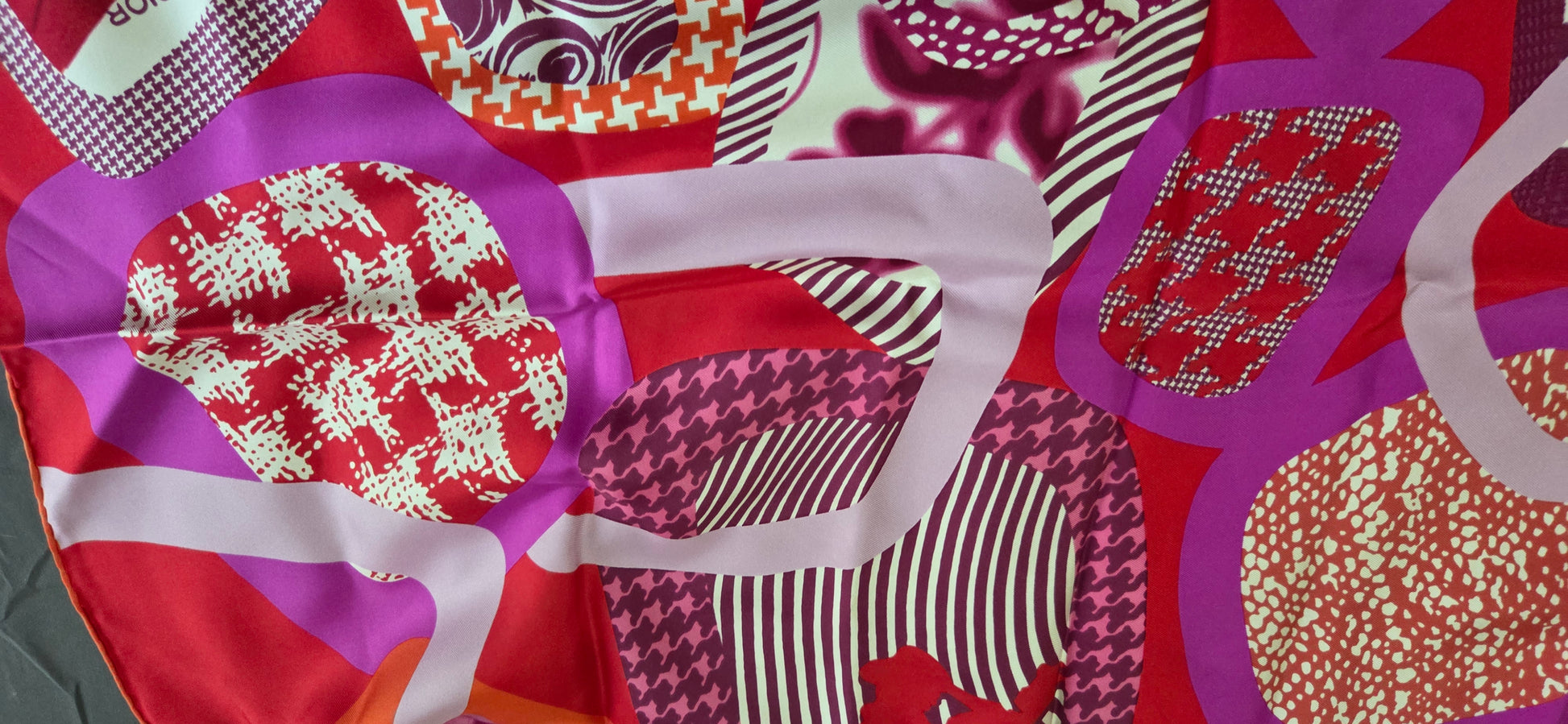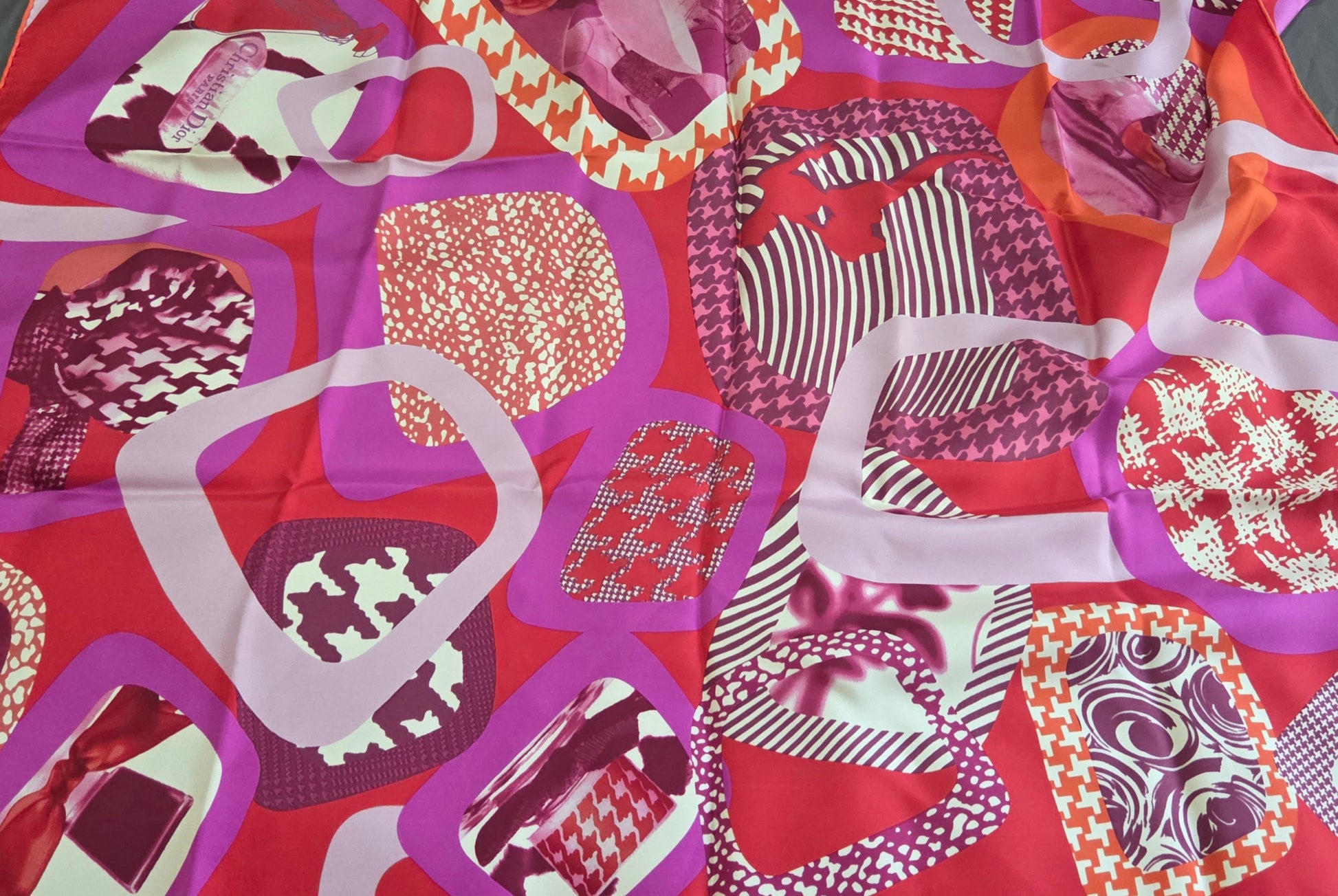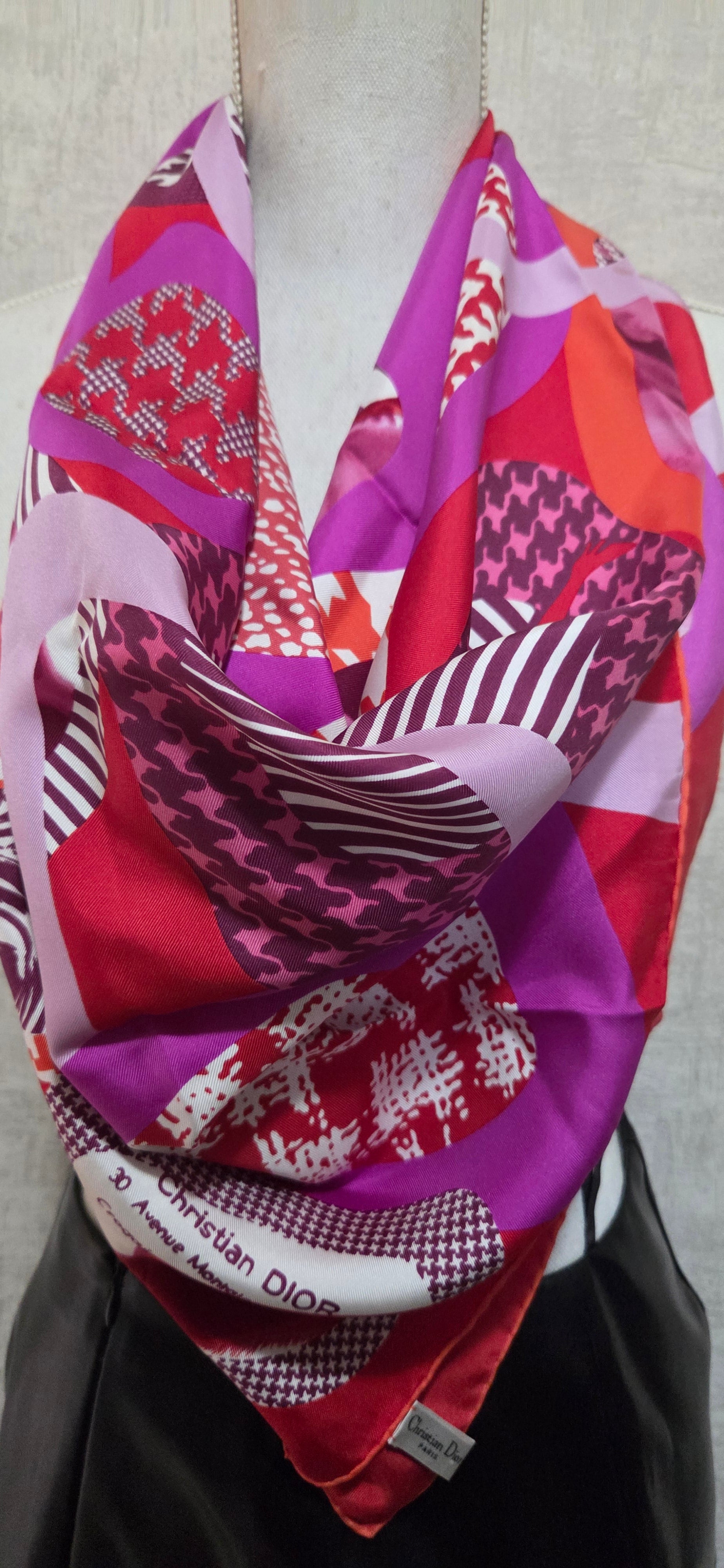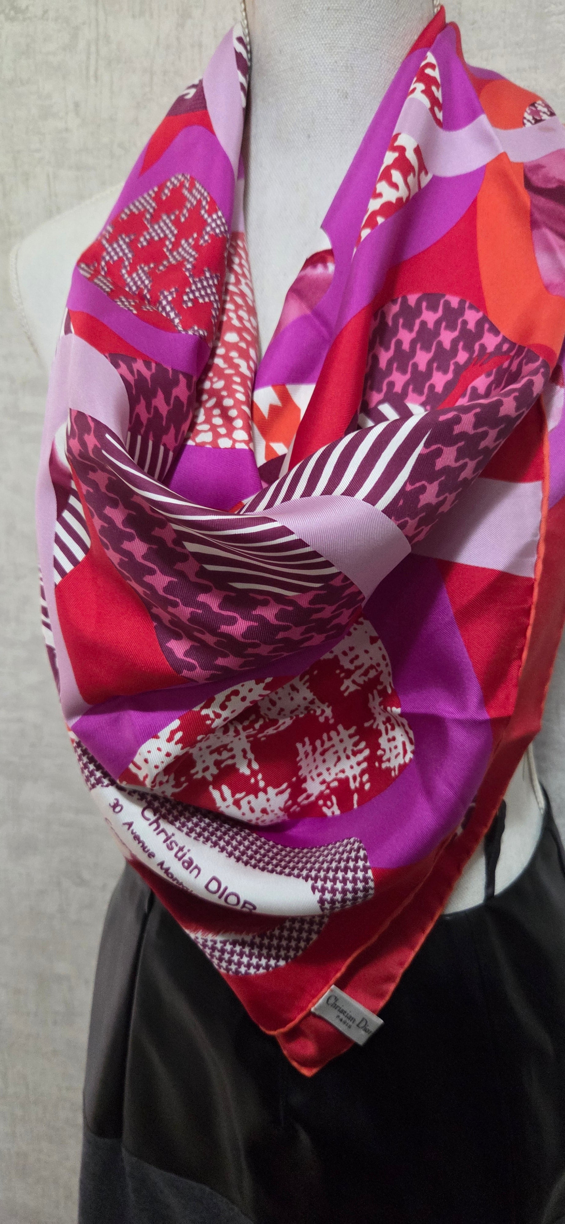 Carré Christian Dior en twill de soie imprimé de silhouettes et de motifs à dominante rouge , orange, fuchsia et beige.