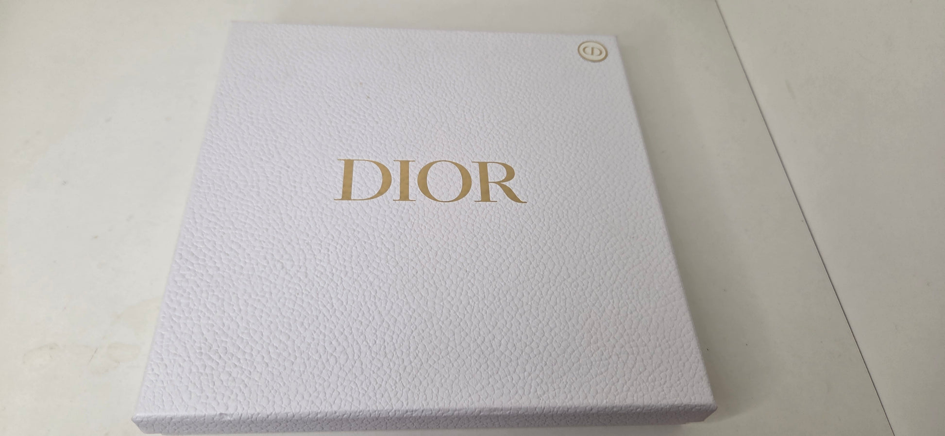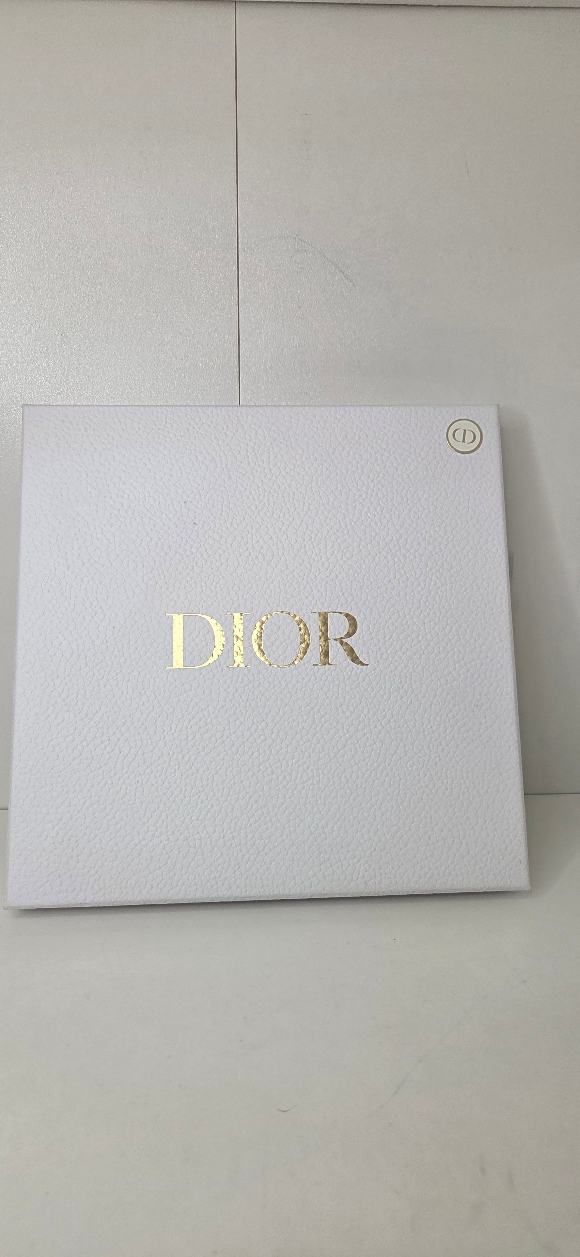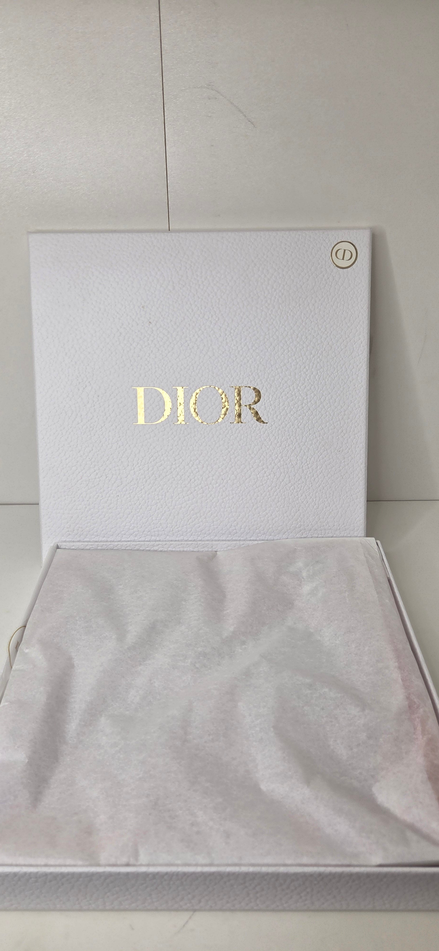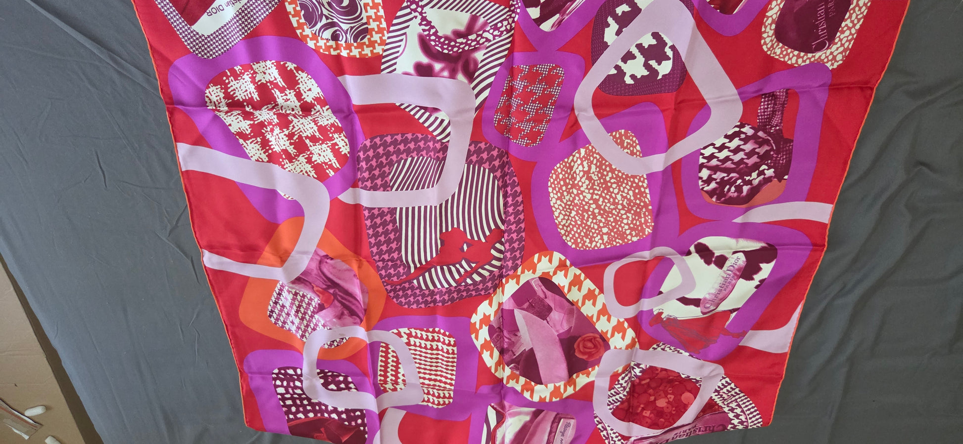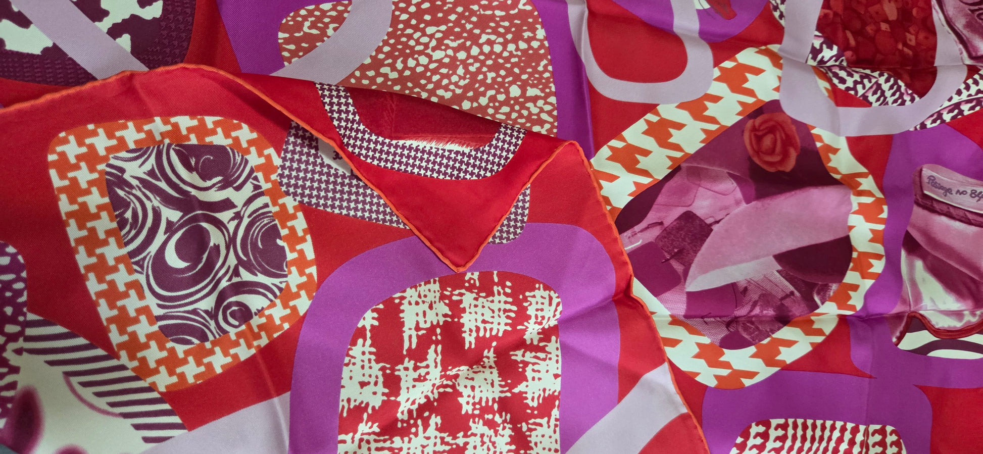 Carré Christian Dior en twill de soie imprimé de silhouettes et de motifs à dominante rouge , orange, fuchsia et beige.