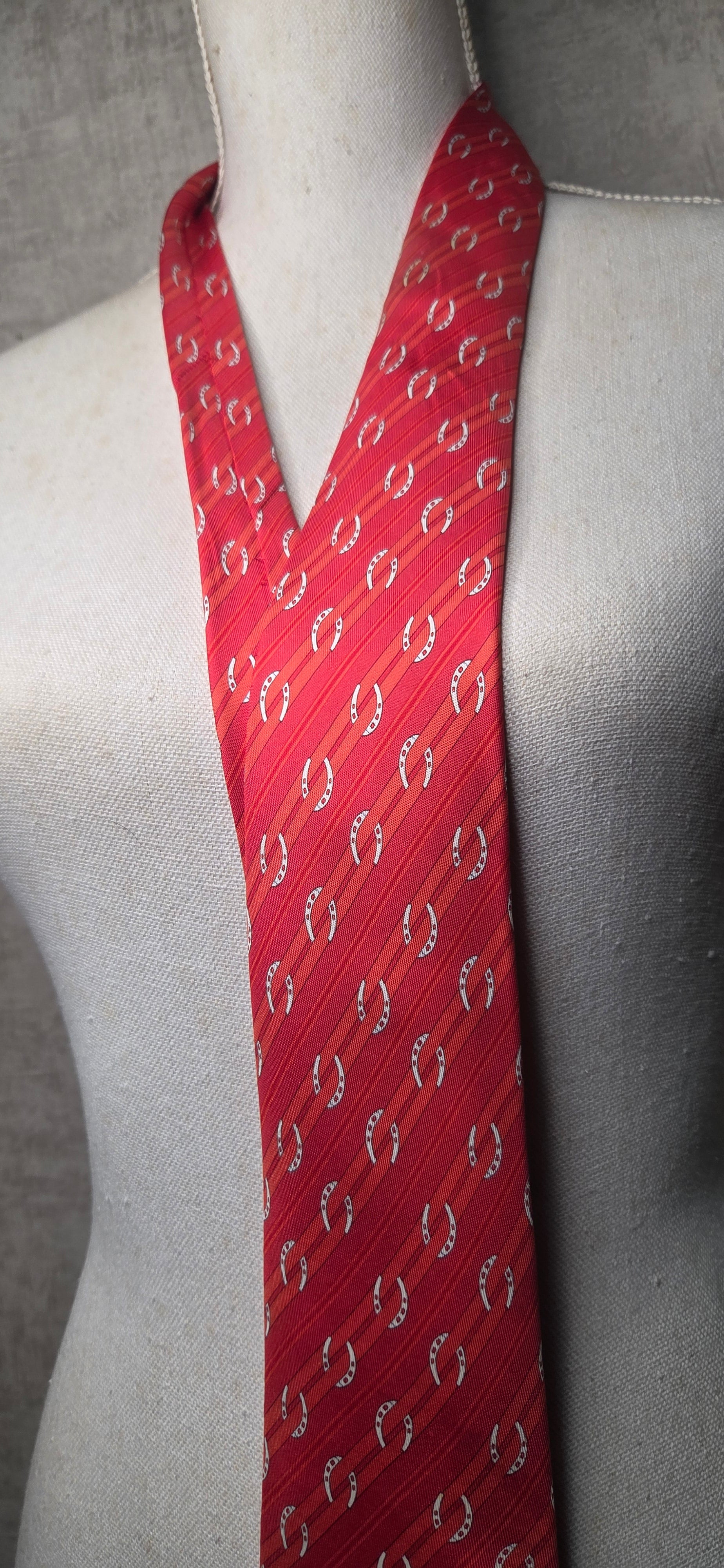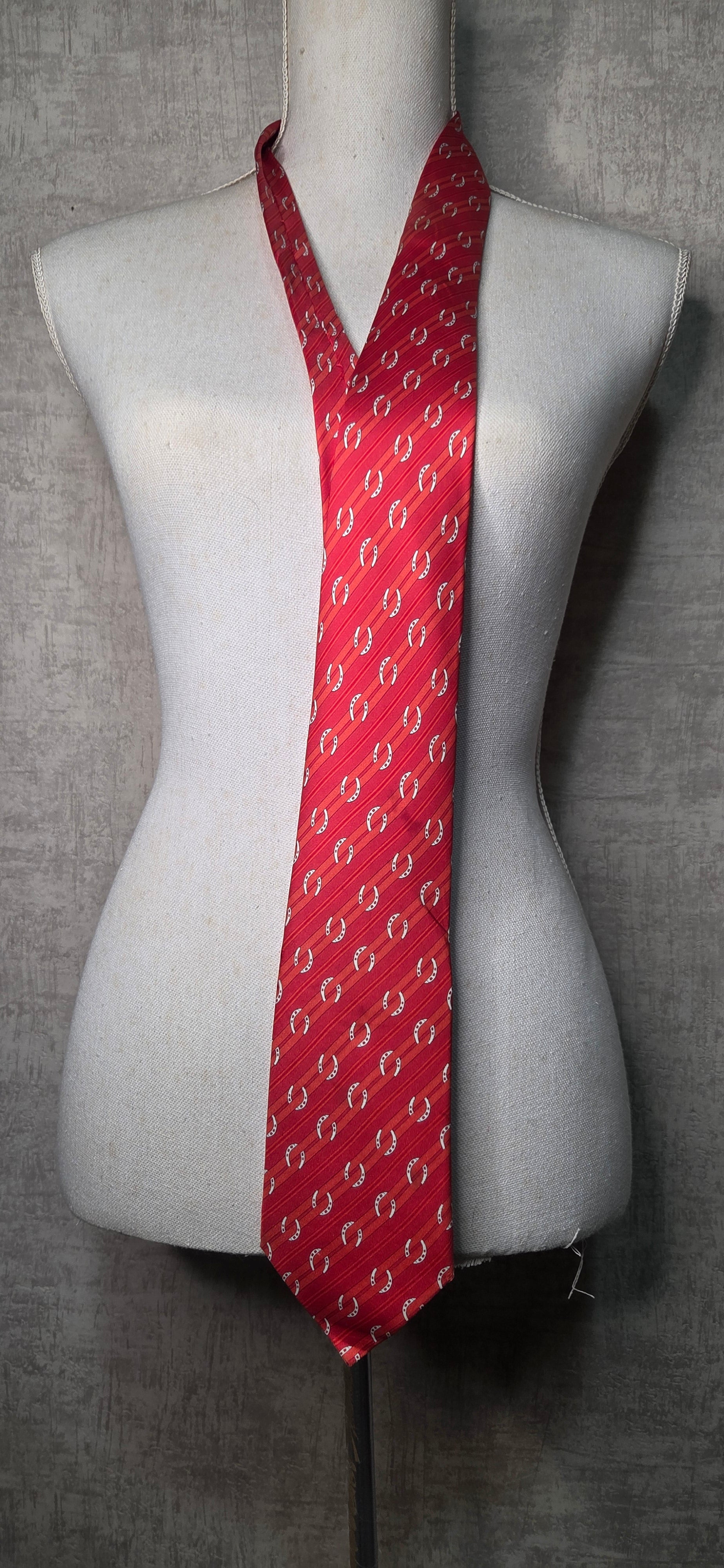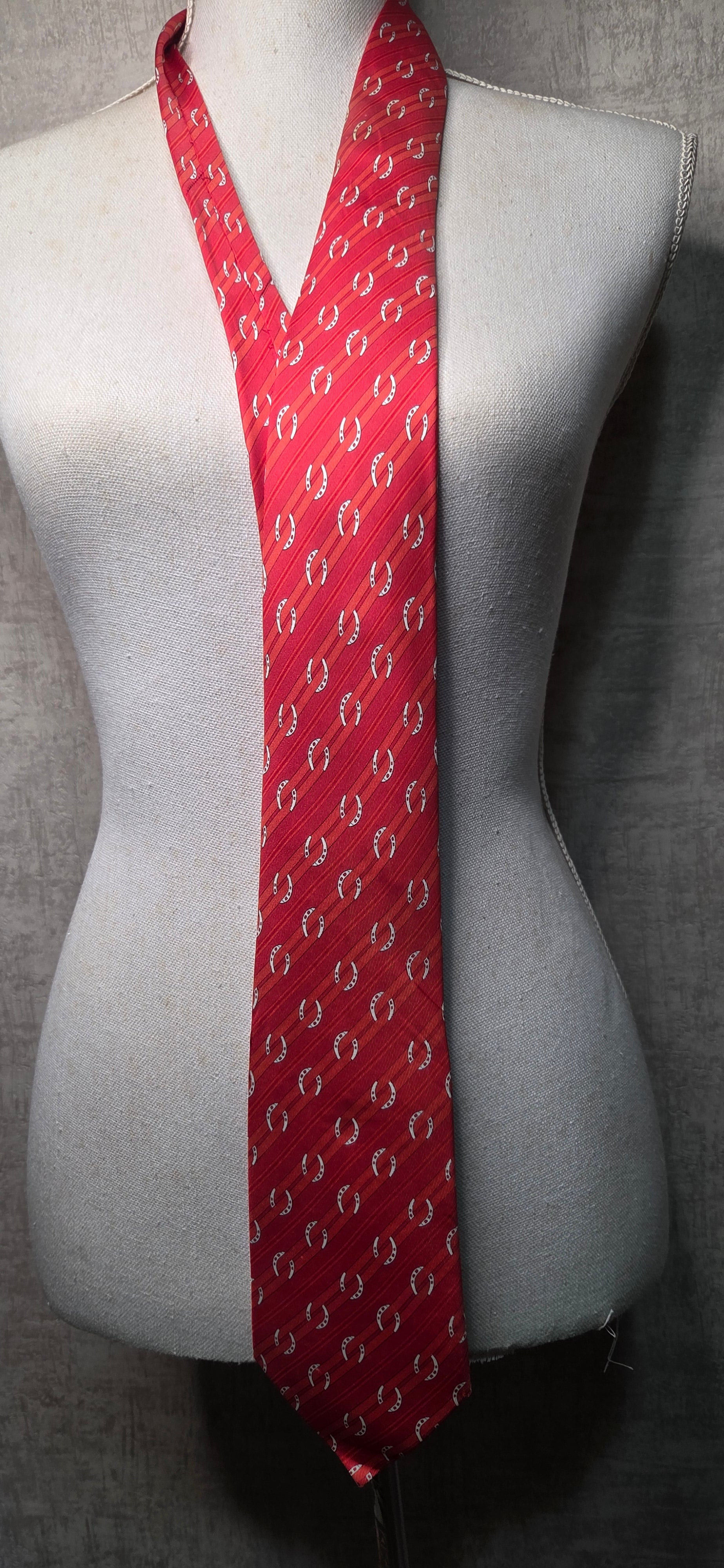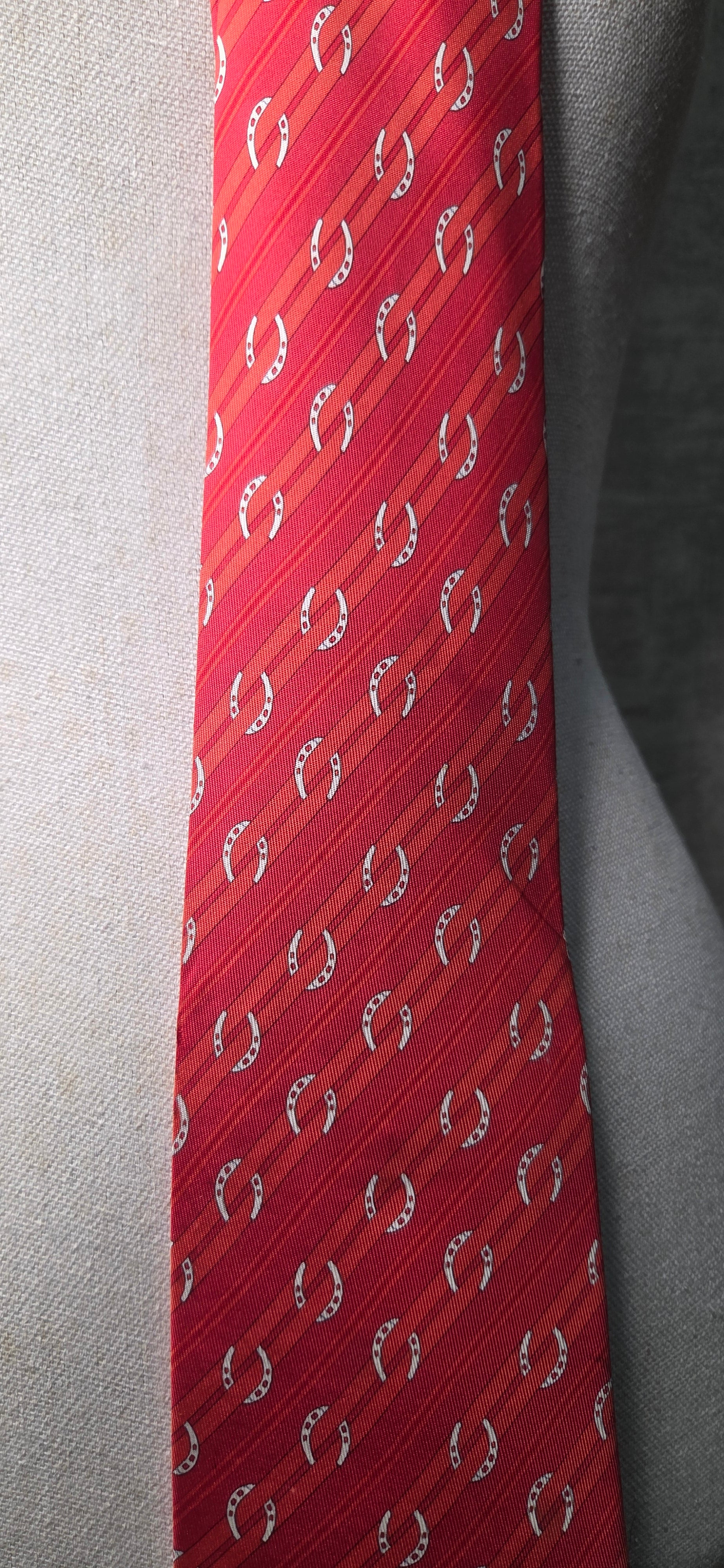 Cravate Hermès en soie rouge à motif de rayures et fer à cheval.