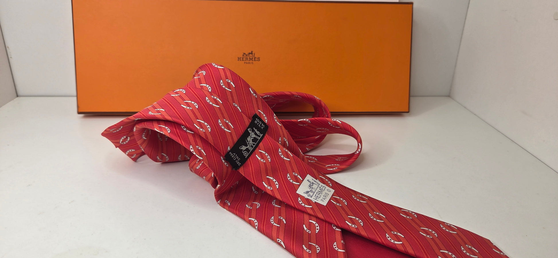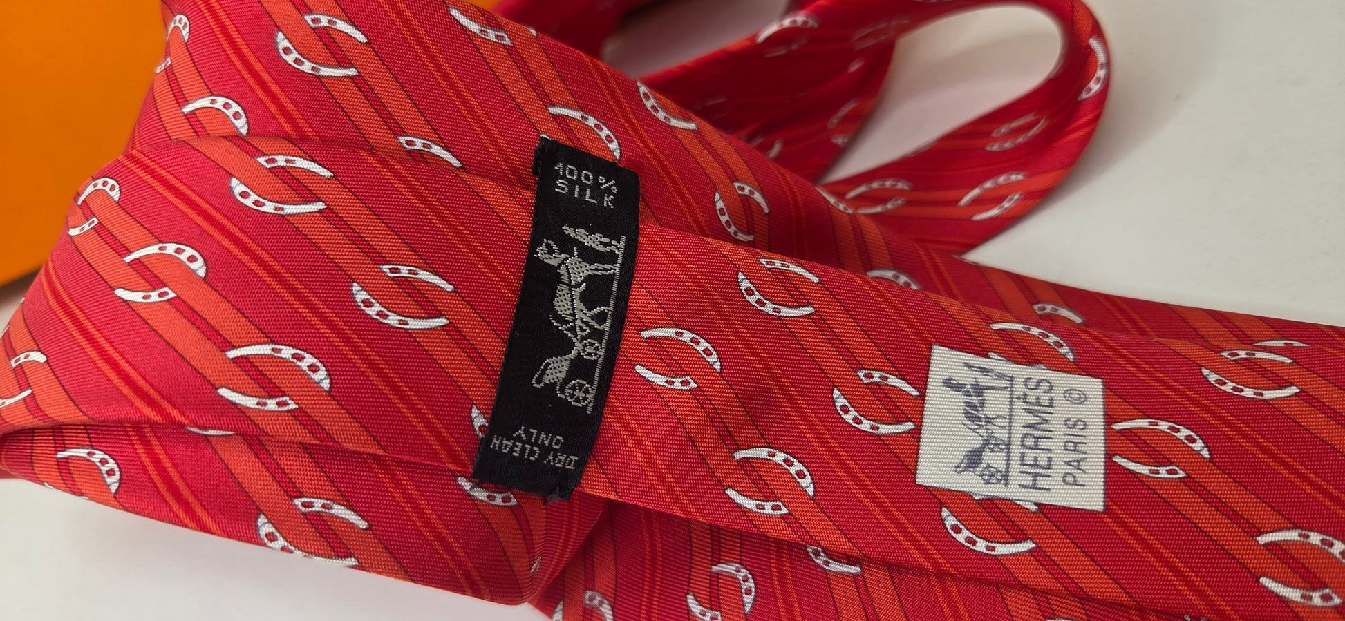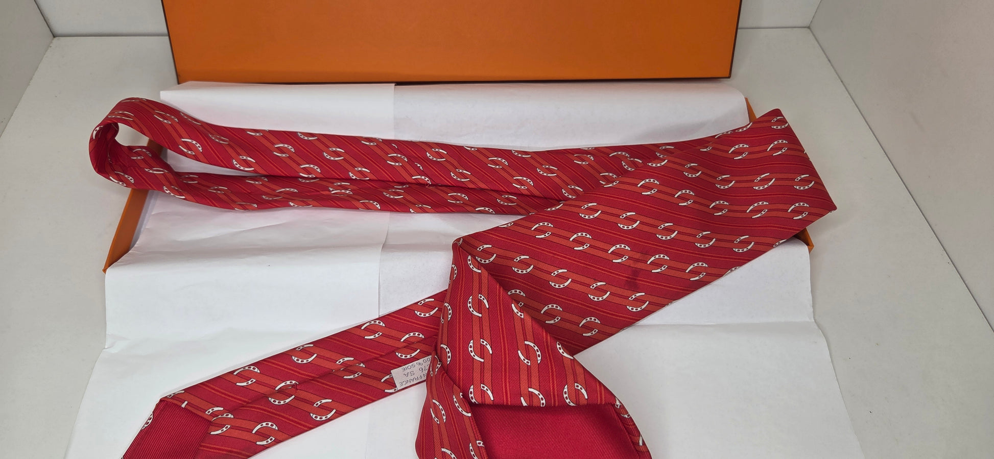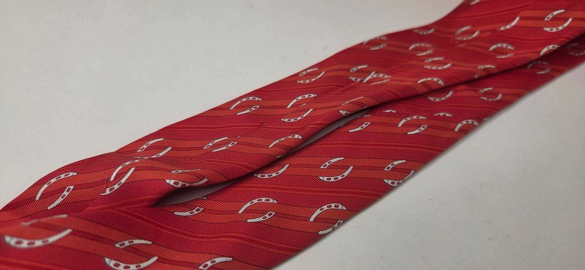 Cravate Hermès en soie rouge à motif de rayures et fer à cheval.