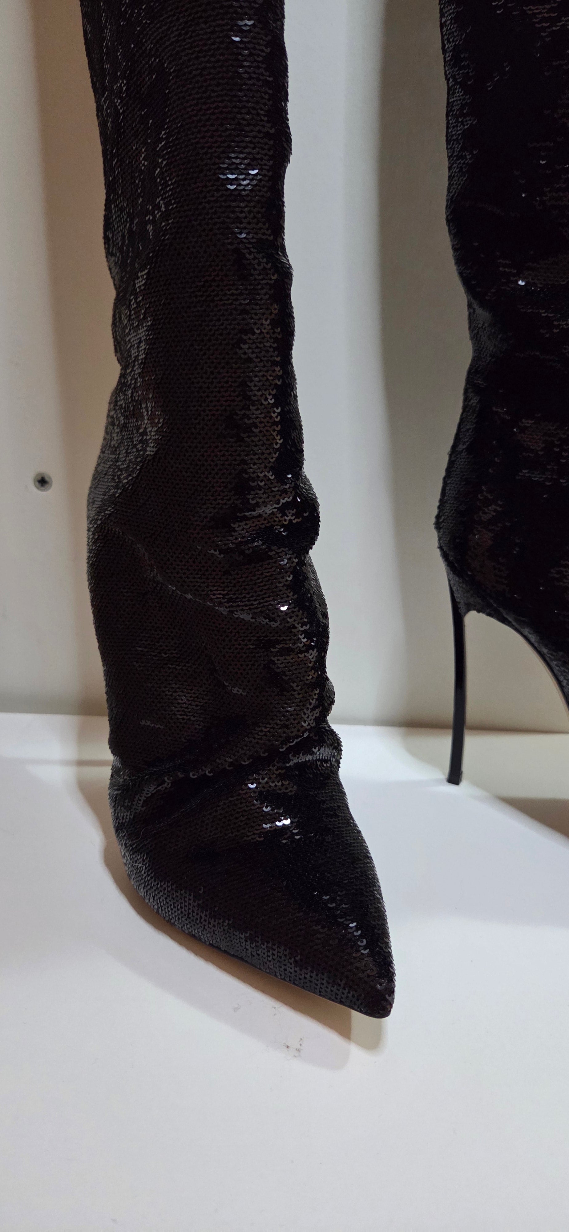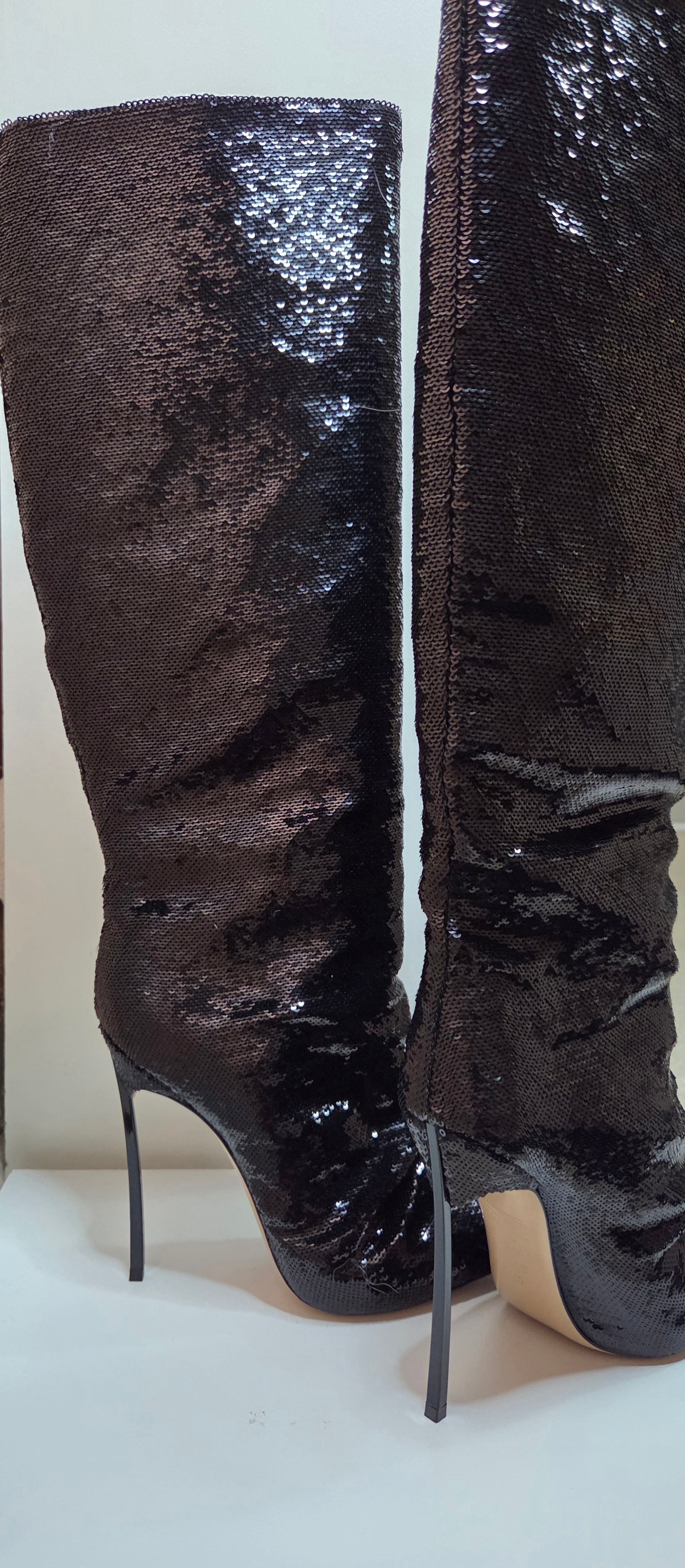 Paire De Bottes en sequin noir à talons aiguilles et bout pointu.