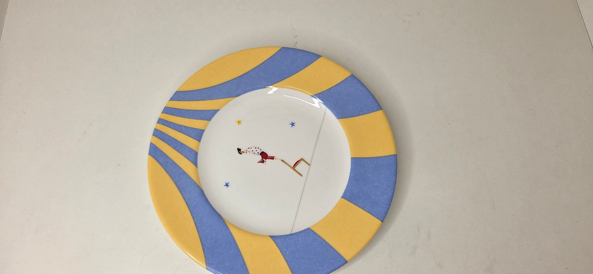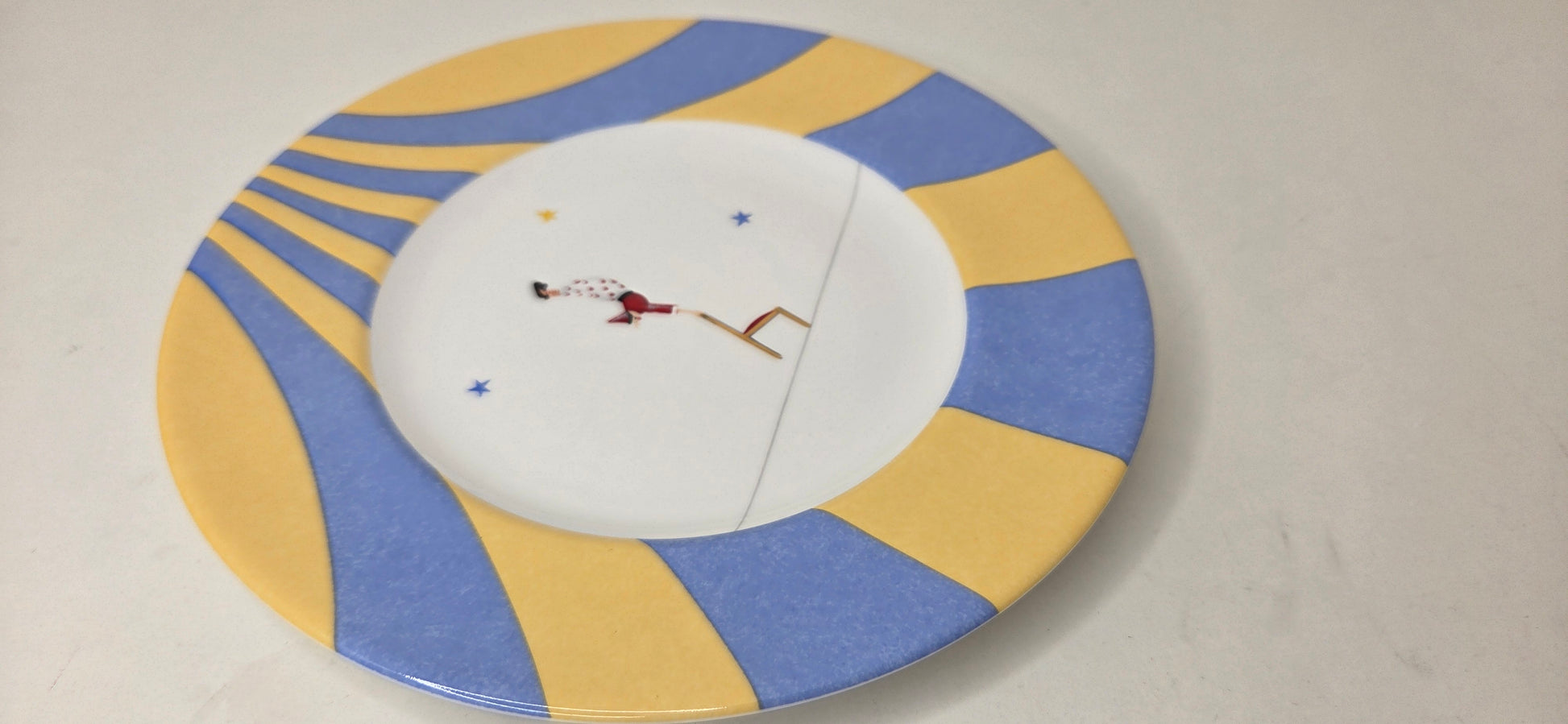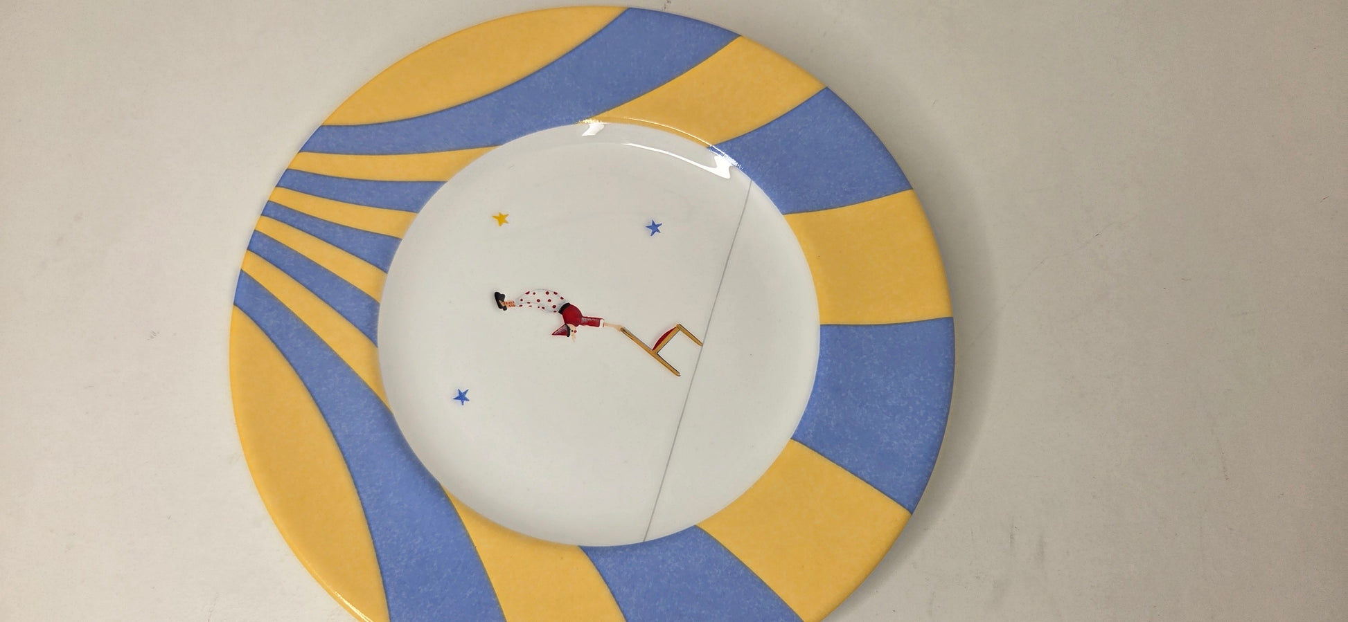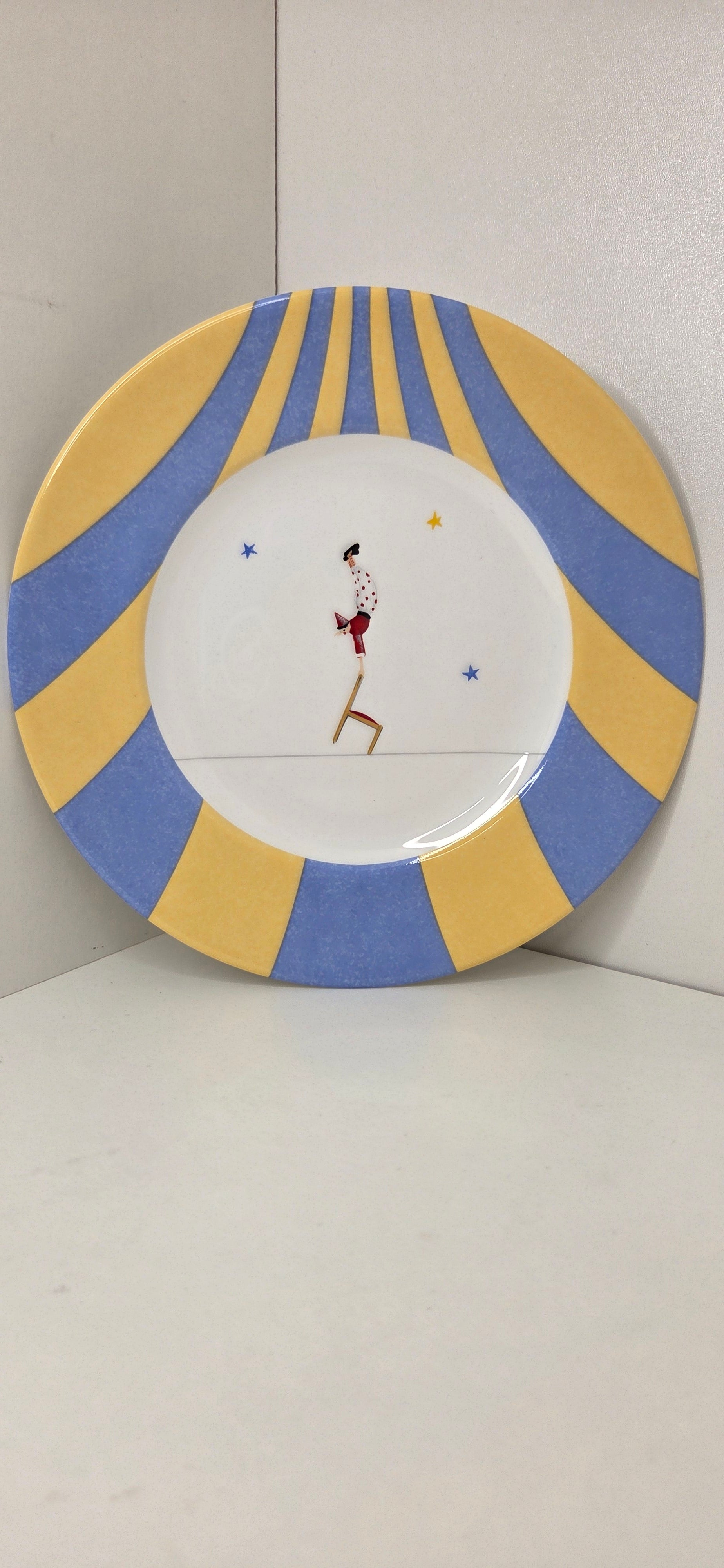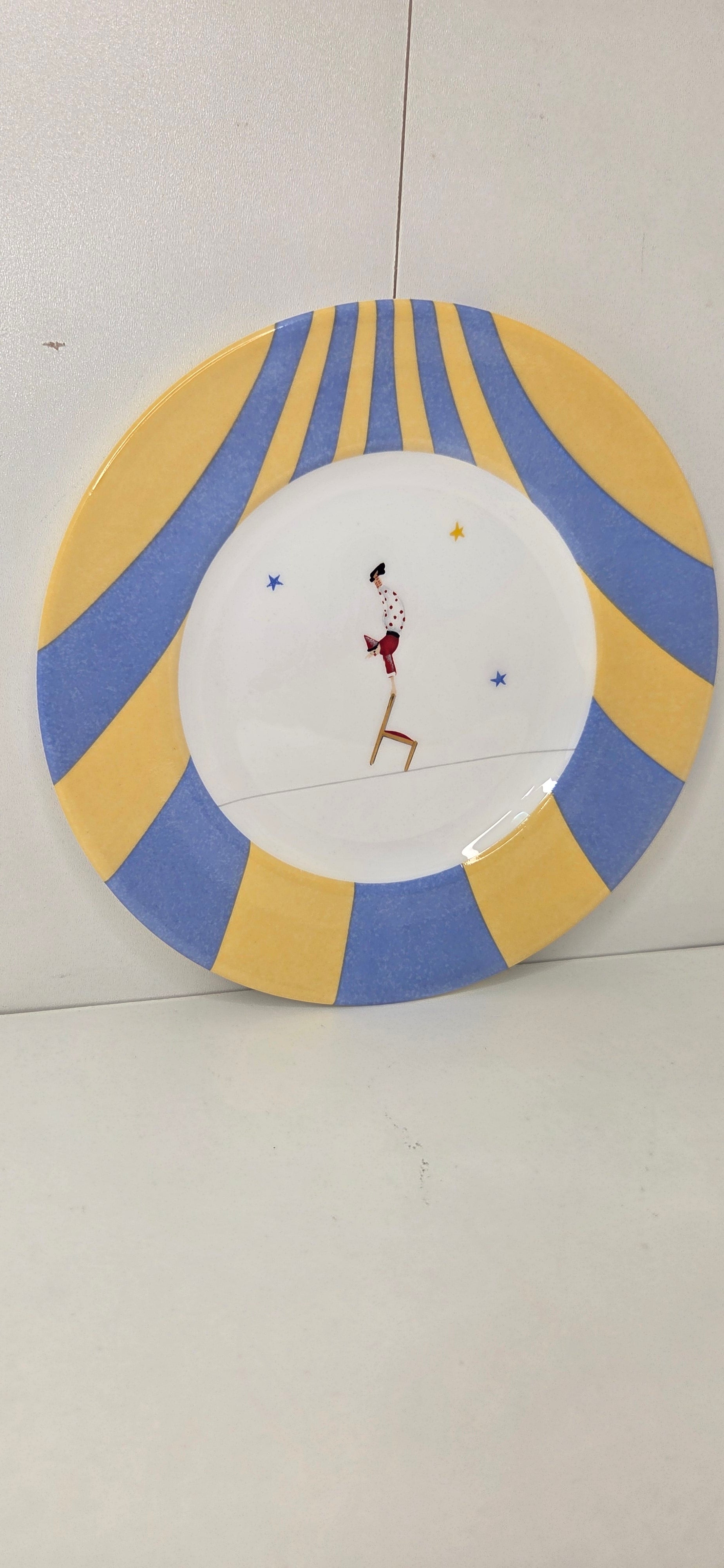 Petite assiette en porcelaine émaillée polychrome a décor de funambule. Modèle Circus le Funambule à la chaise.