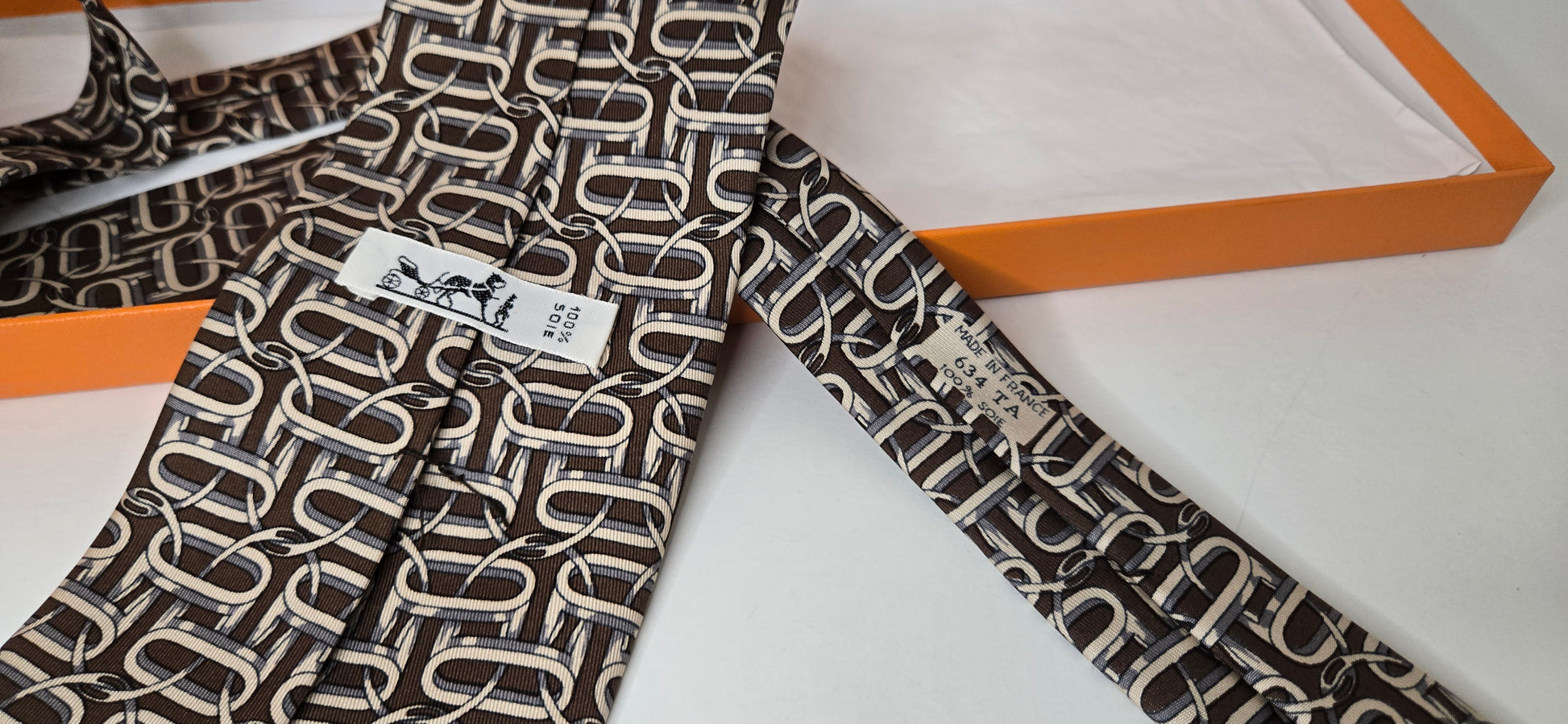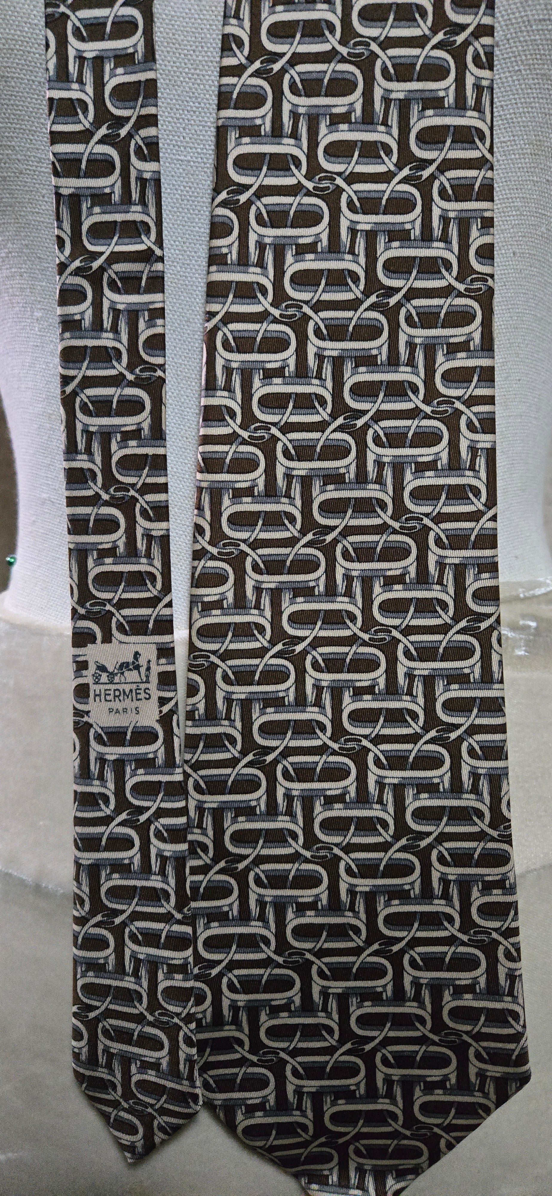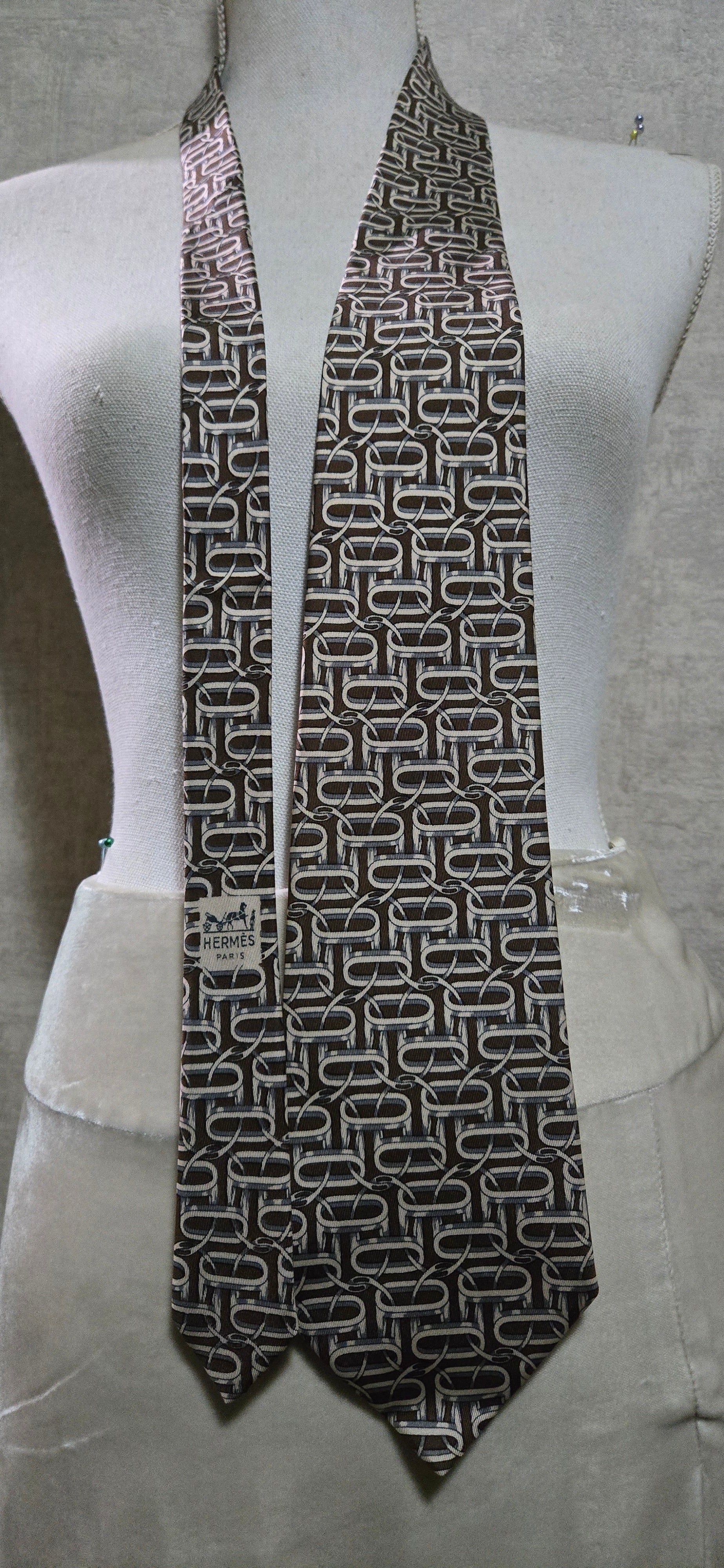 Cravate Hermès en soie, cravate vintage 1970 , a décor d'étriers sur fond marron glacé dans sa boîte. Très bon état
