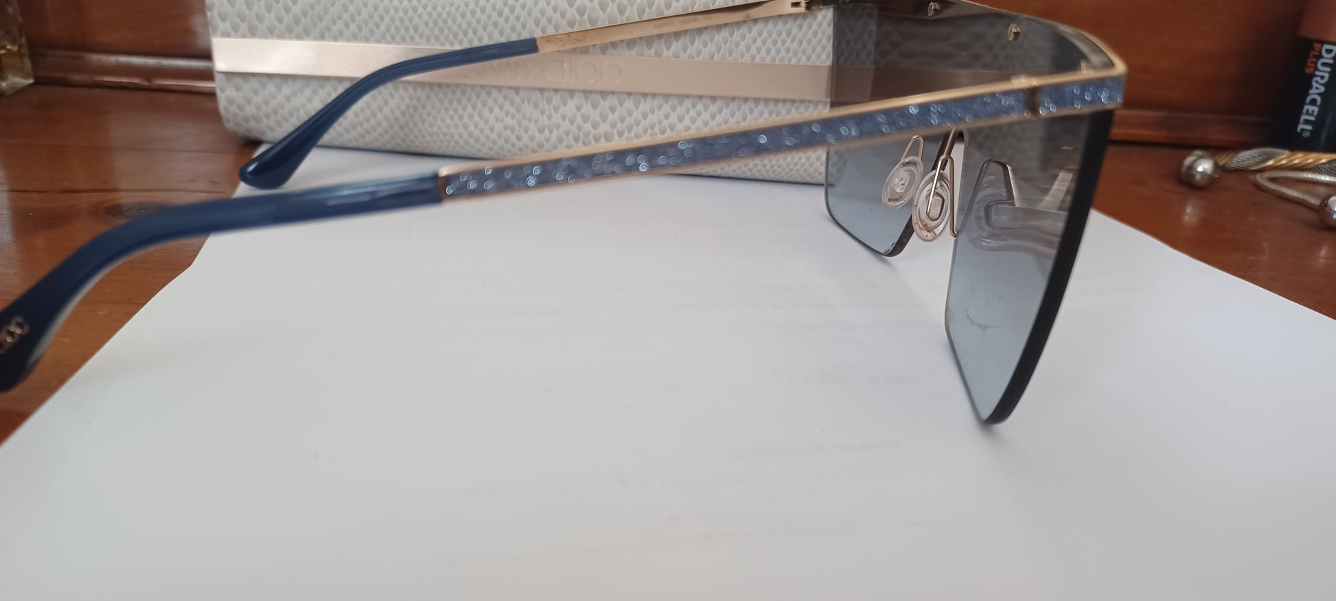 Lunettes Masque Jimmy Choo surdimensionne bleu ombré intense, avec barre d'or et vernis bleu pailleté branche fine en or.