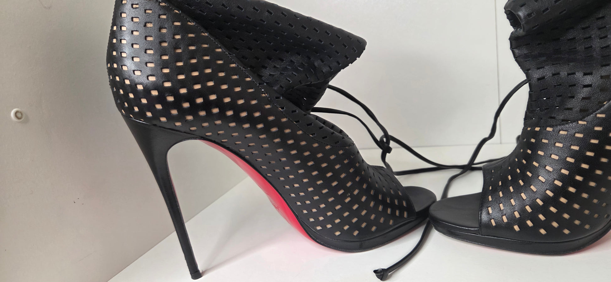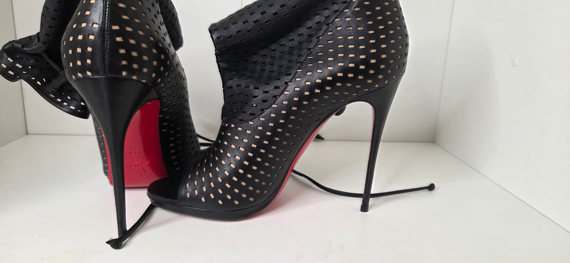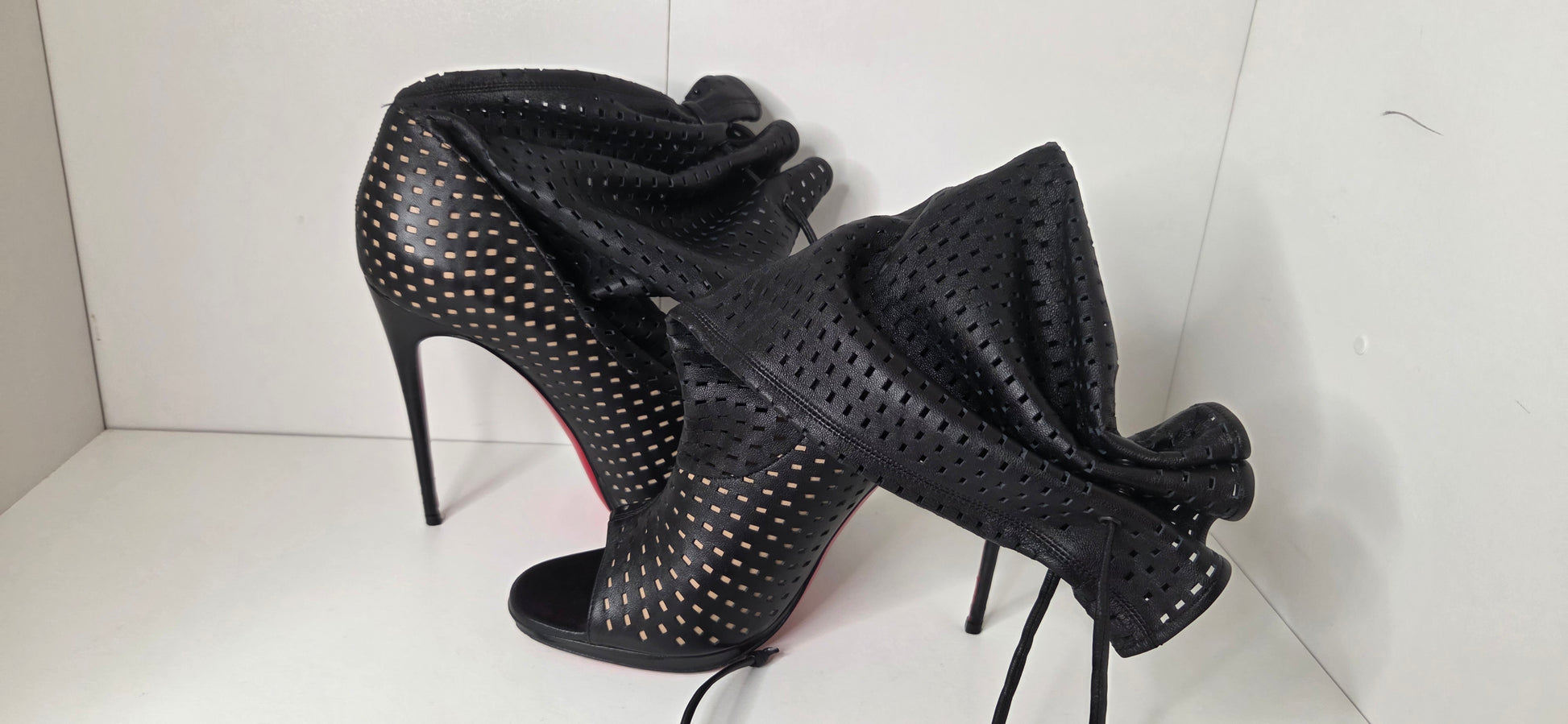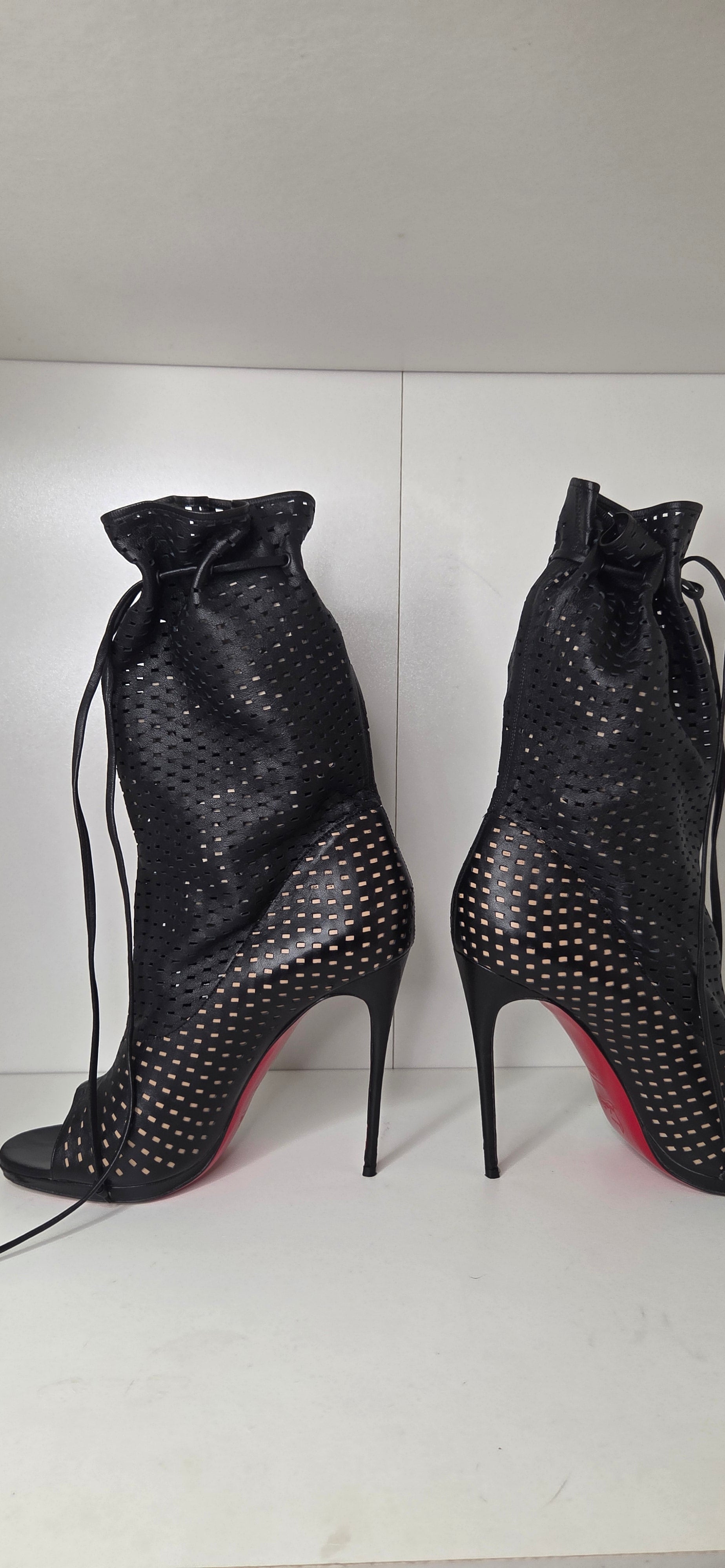 Louboutins Bottes a bout ouvert en cuir ajouré sur fond noir a effet froncé agrémenté de liens.