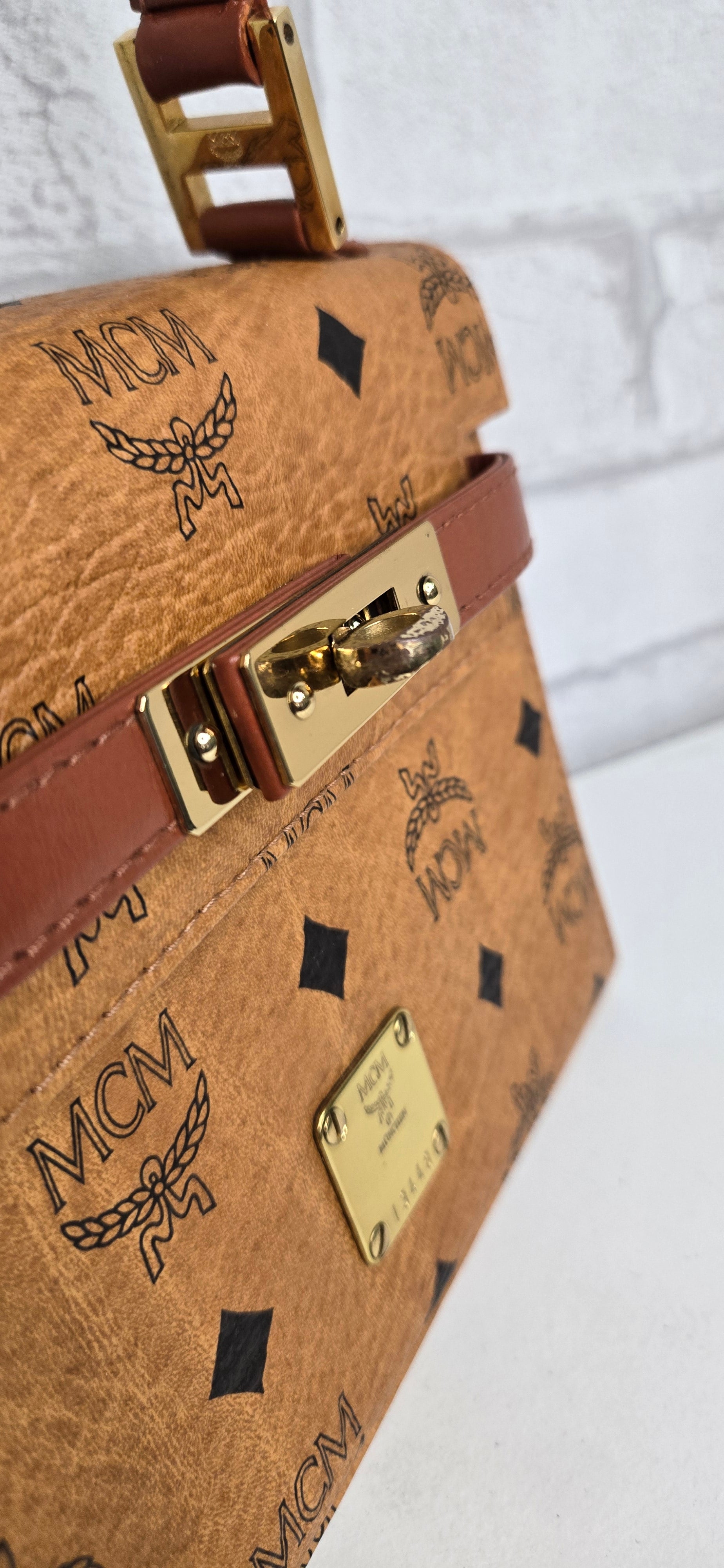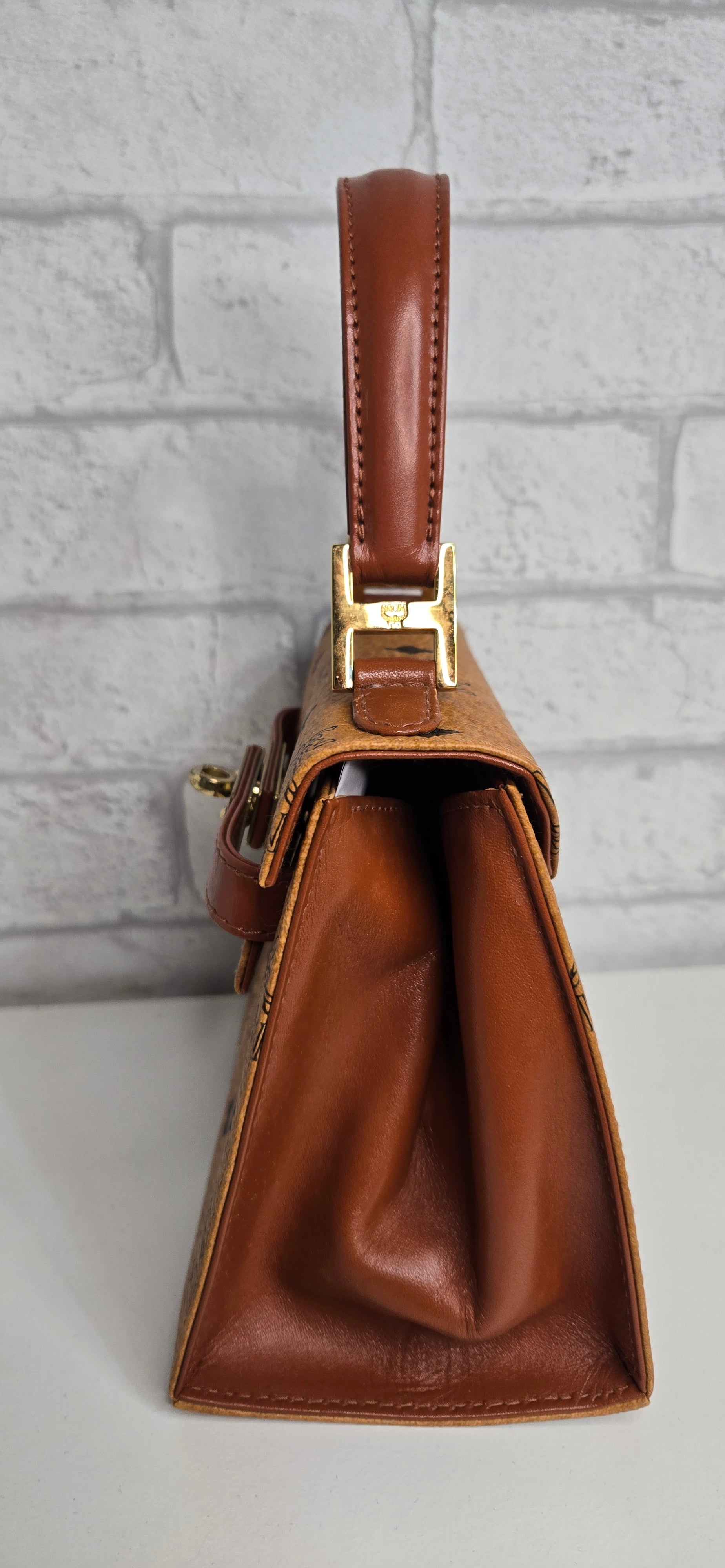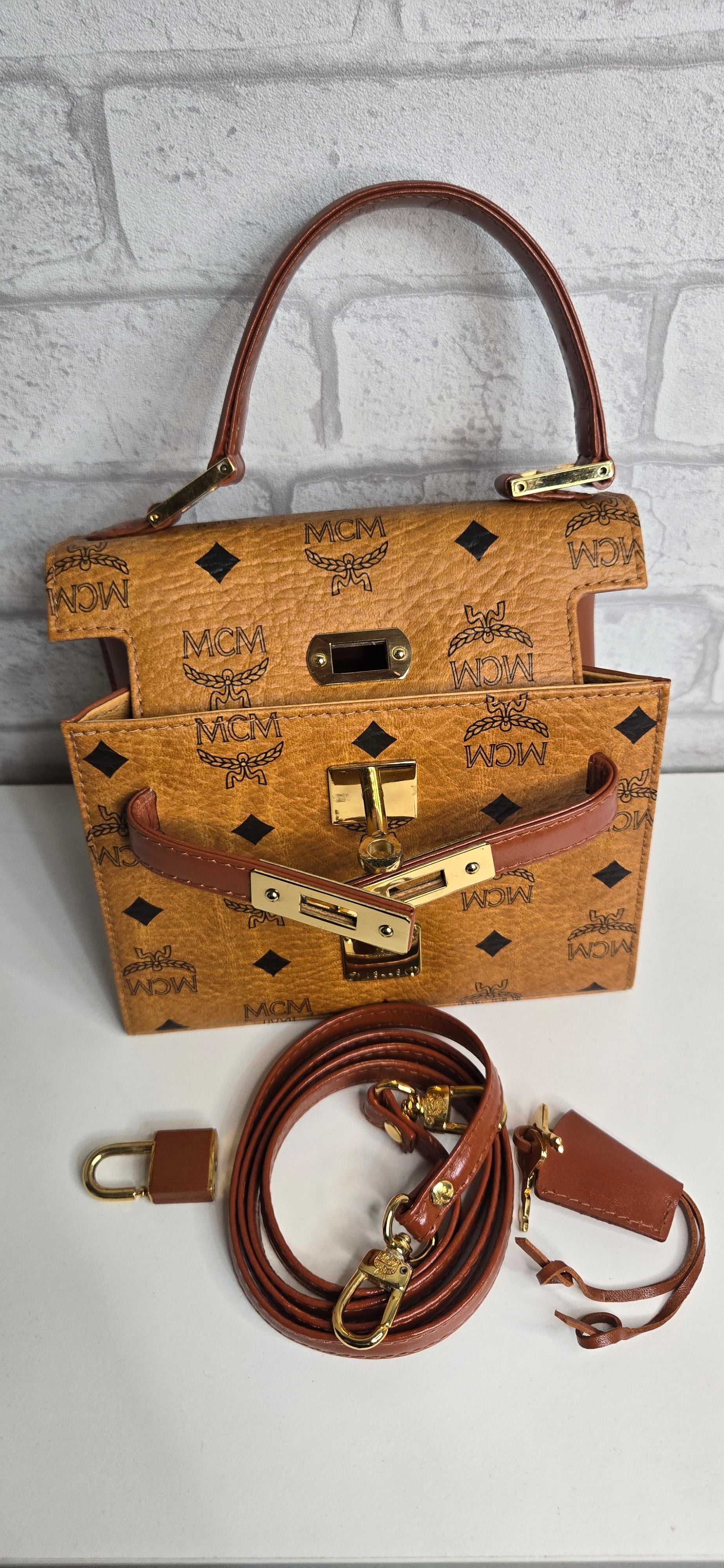 MCM Mini Kelly en toile enduite "Visetos" Marron. Bijouterie dorée. Complet de sa bandoulière, de son cadenas et de ses clés.