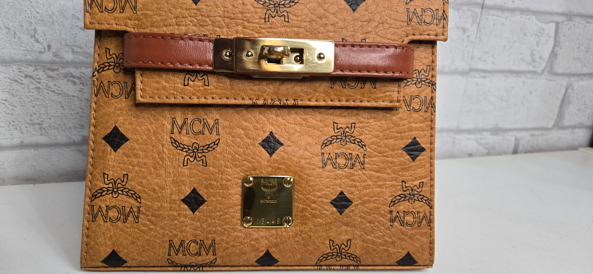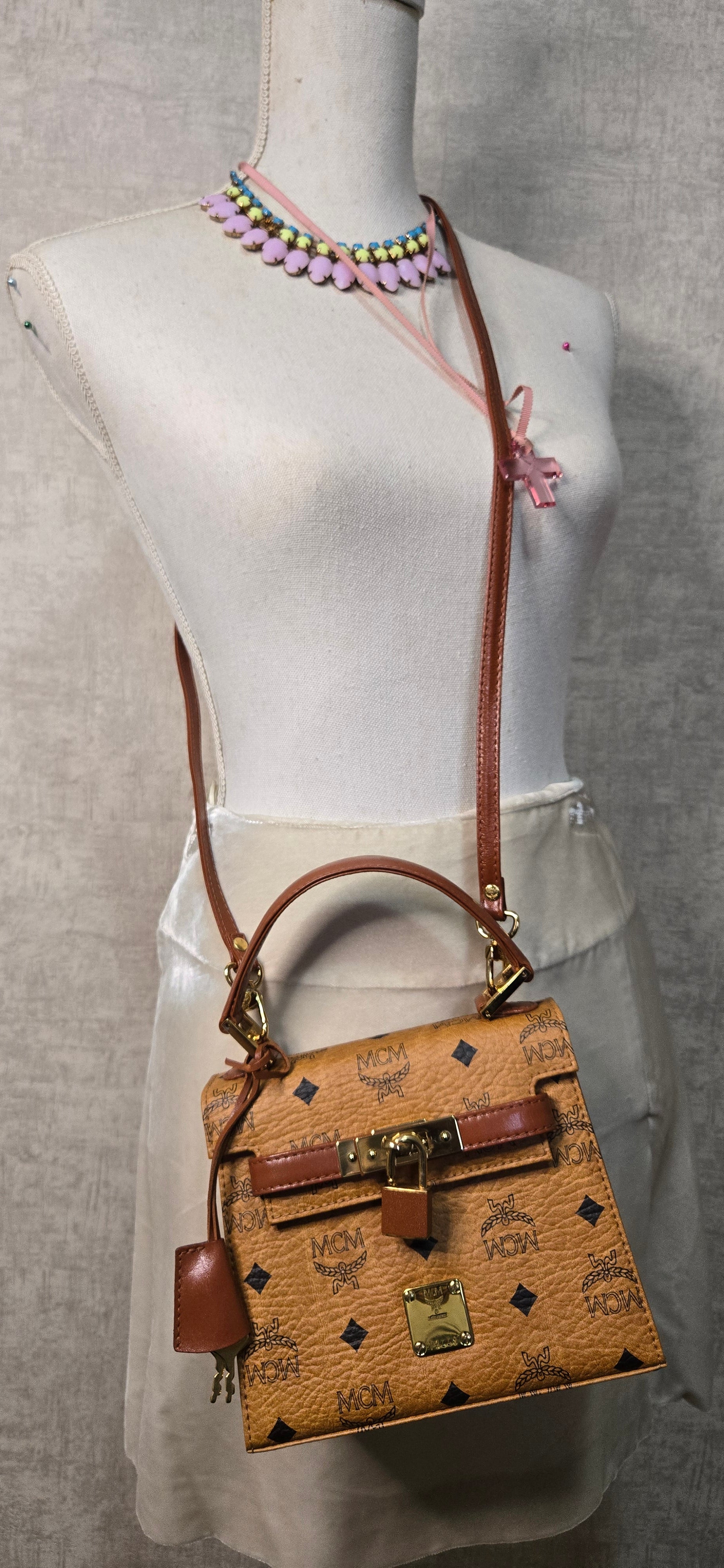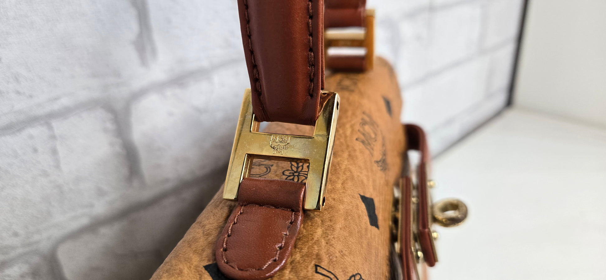 MCM Mini Kelly en toile enduite "Visetos" Marron. Bijouterie dorée. Complet de sa bandoulière, de son cadenas et de ses clés.