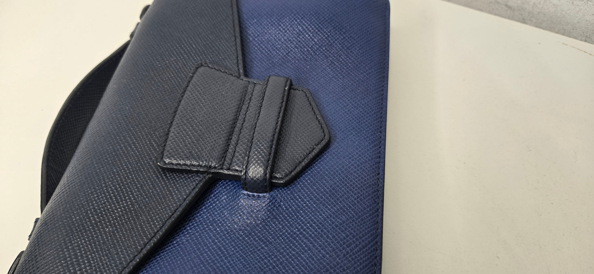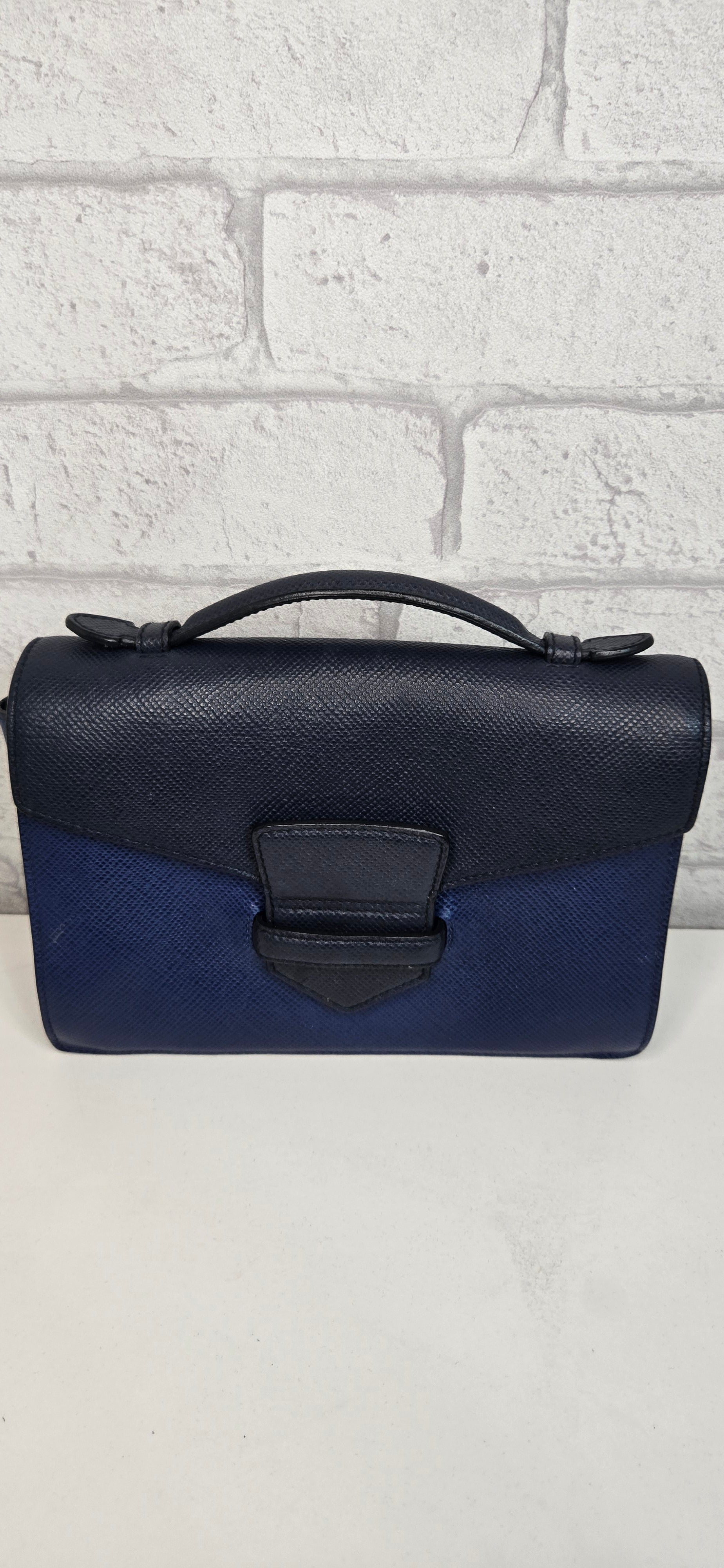 Prada Pochette 20 cm en veau grainé marine en deux tons, fermeture languette sur pression, poignée Bon état légères usures