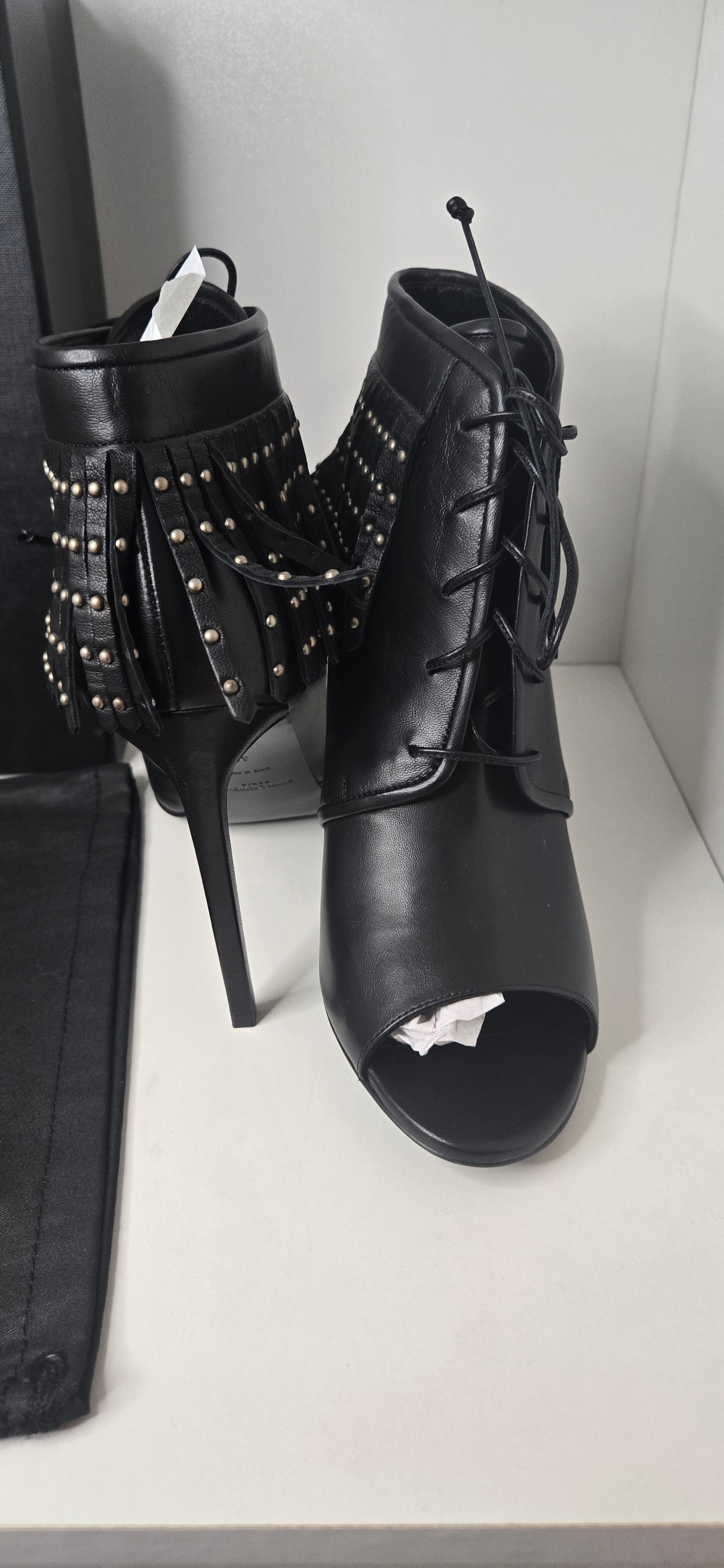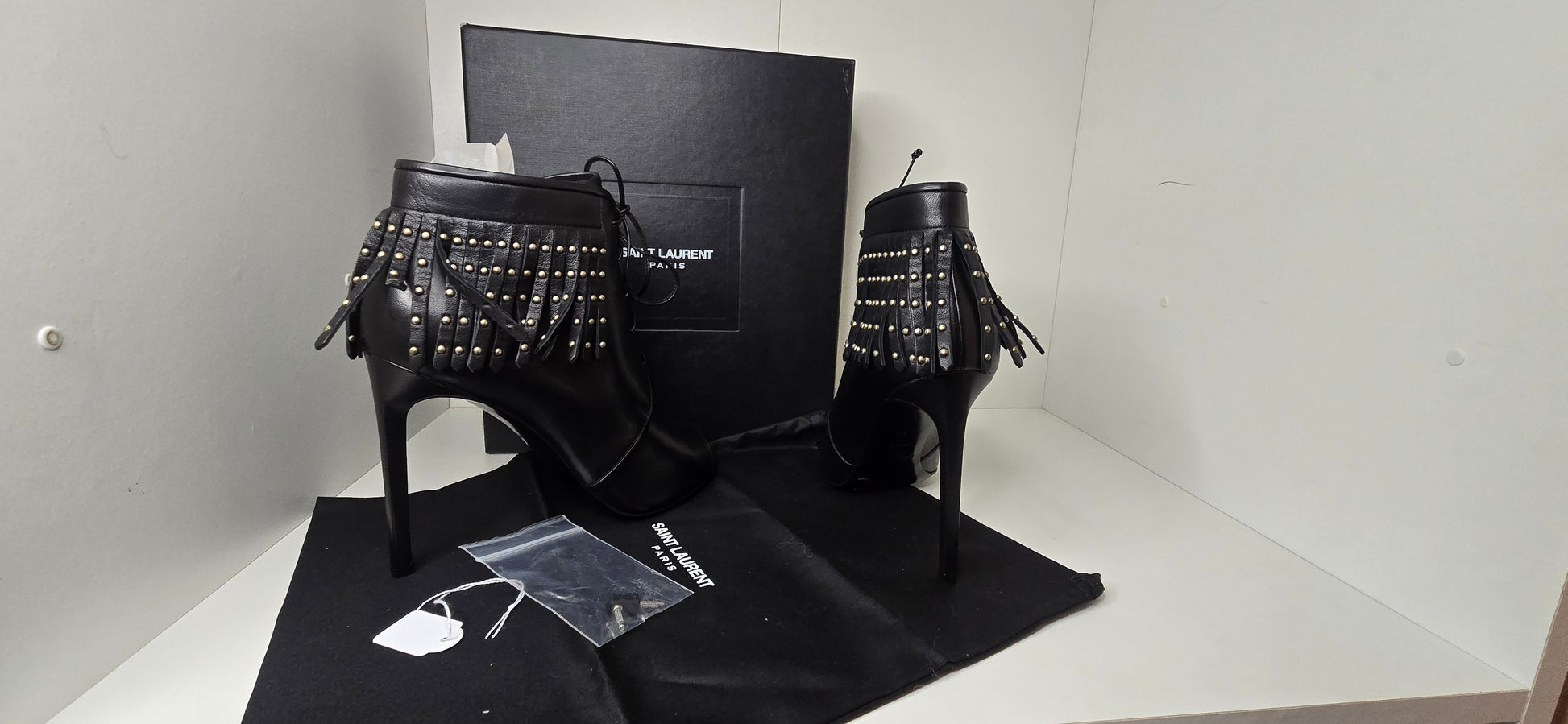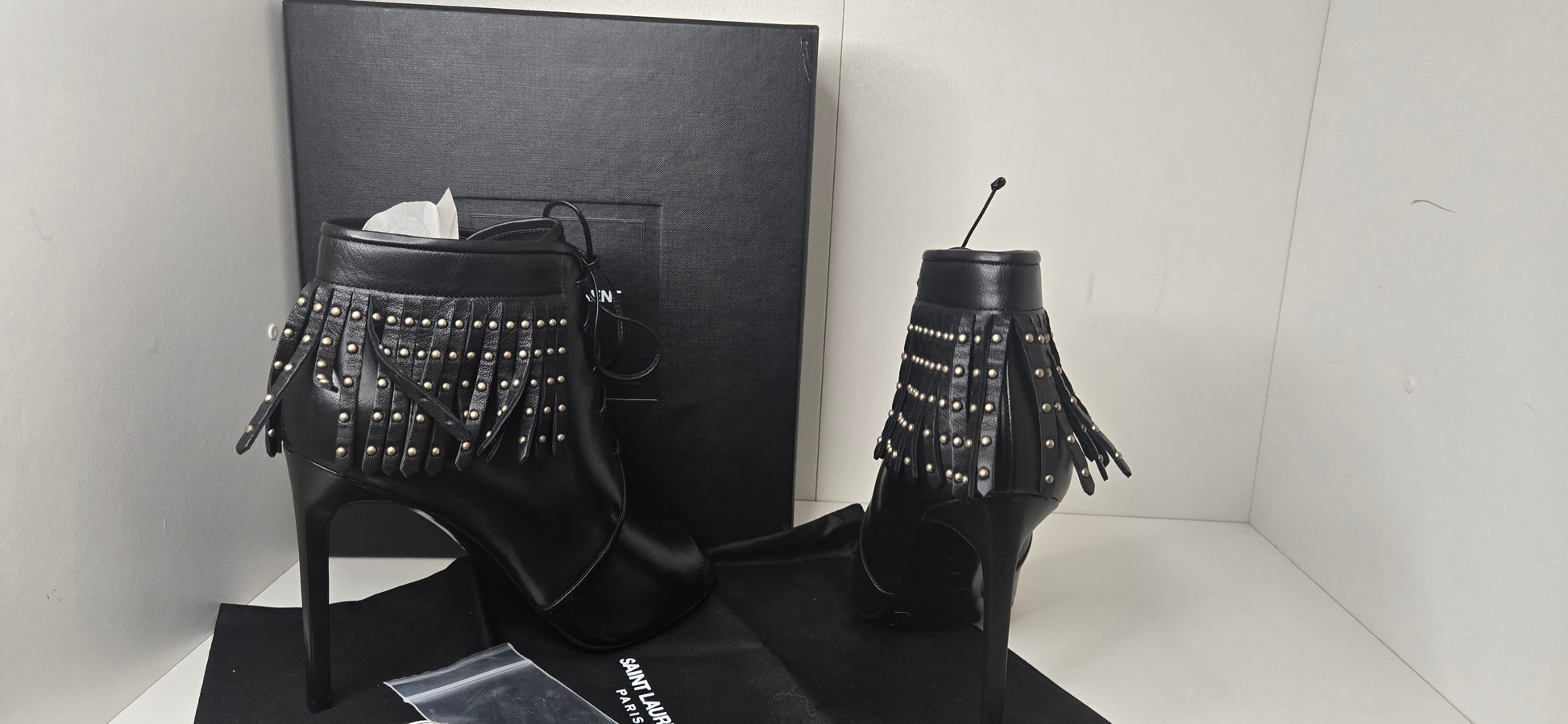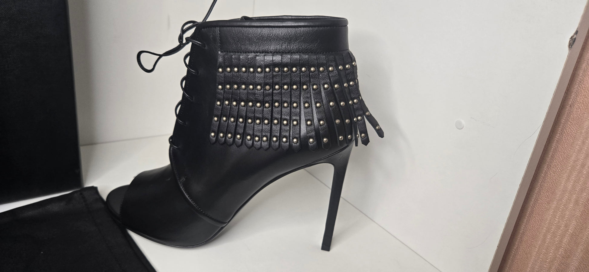 Saint Laurent Paire de Boots "Jane" a bouts ouverts en cuir noir, franges cloutées (Pointure 40). Dust bag , boîte, etc..