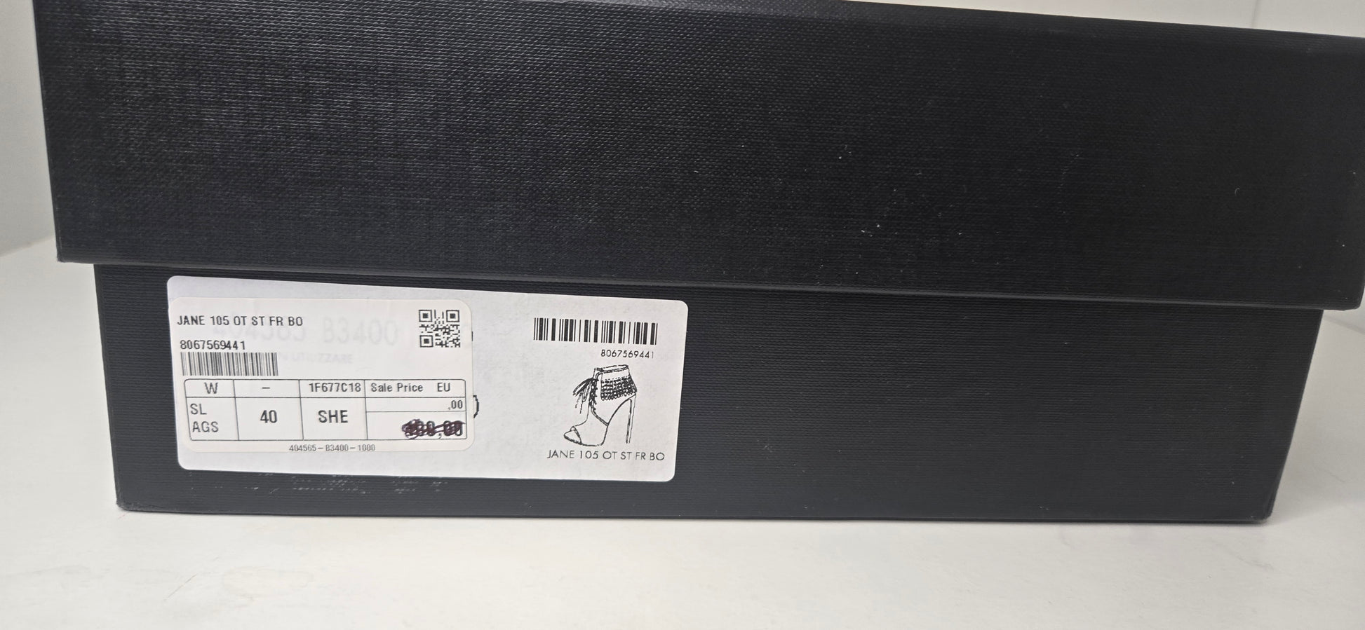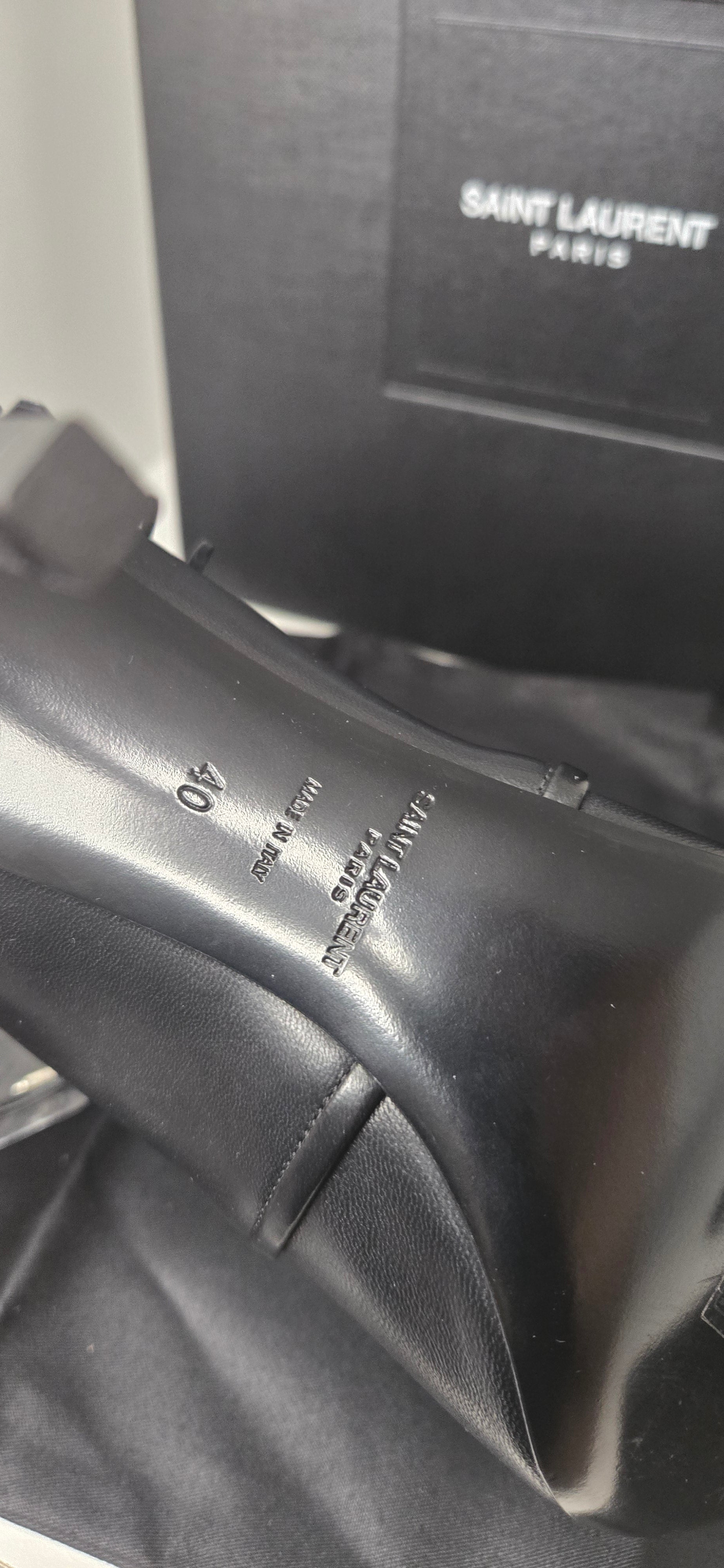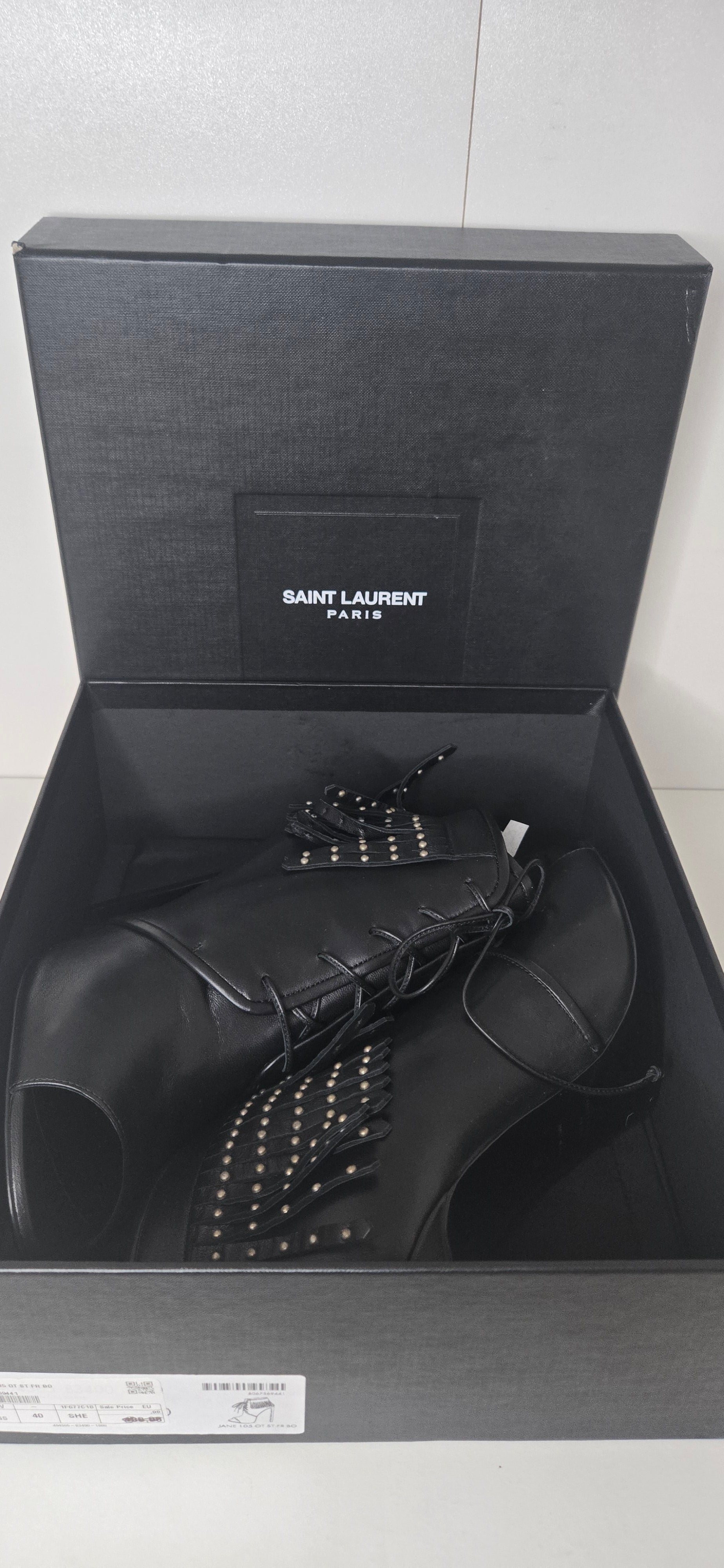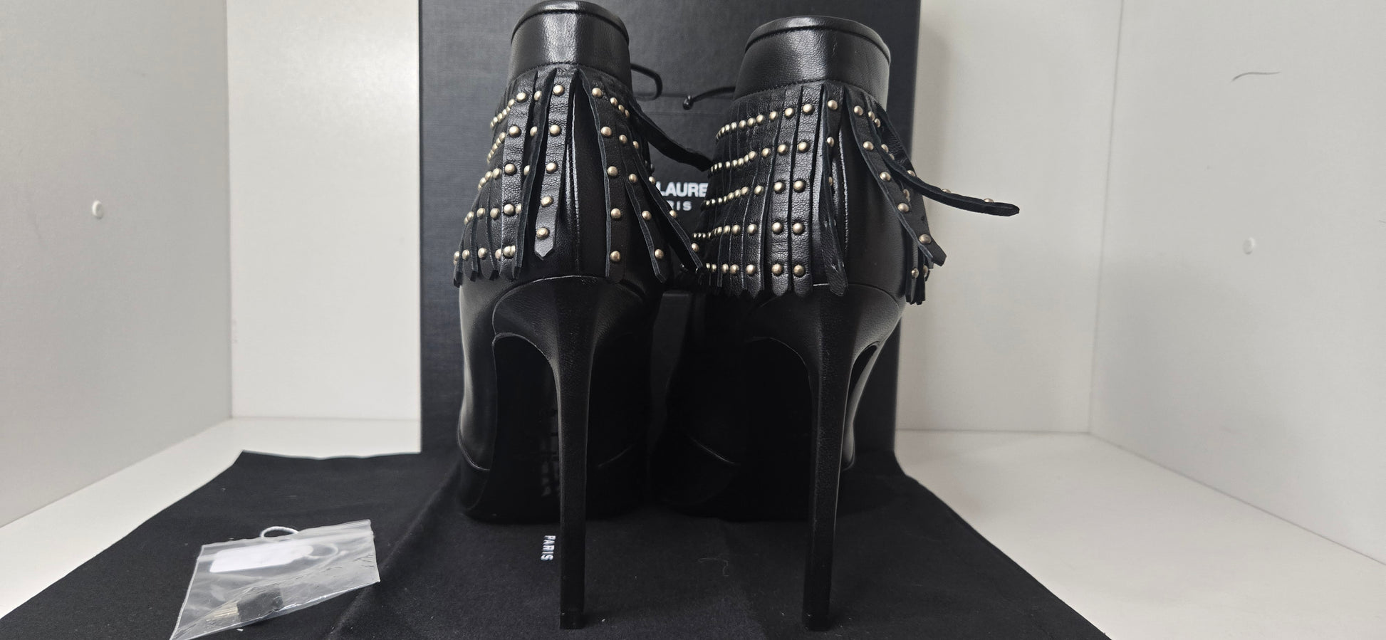 Saint Laurent Paire de Boots "Jane" a bouts ouverts en cuir noir, franges cloutées (Pointure 40). Dust bag , boîte, etc..