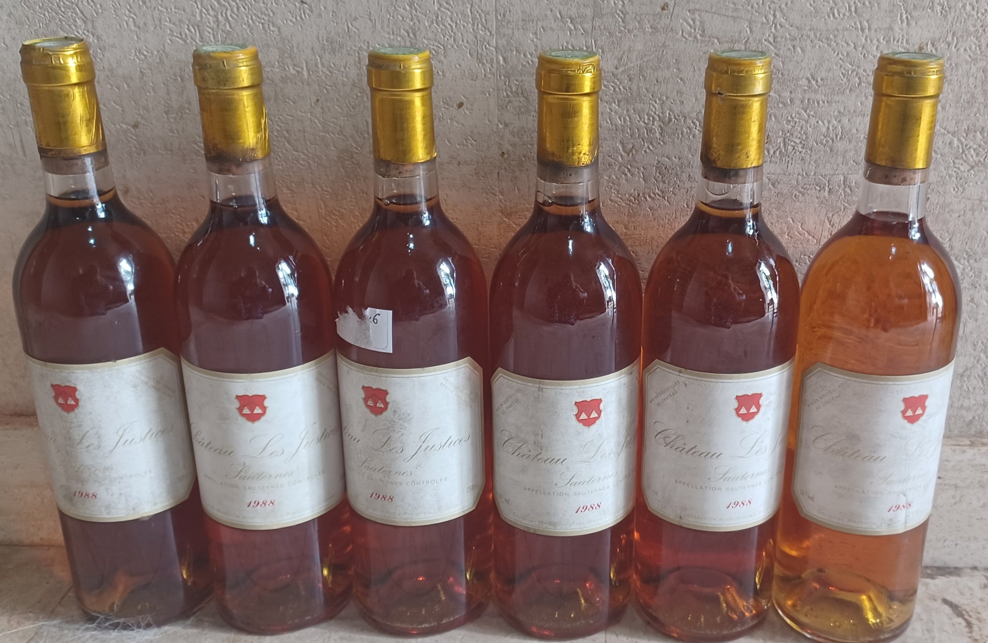 Bouteilles Sauternes , Château les Justices 1988 1BG ,Capsules sales et avec des plis. Étiquettes légèrement sales et fanées. Voir photos