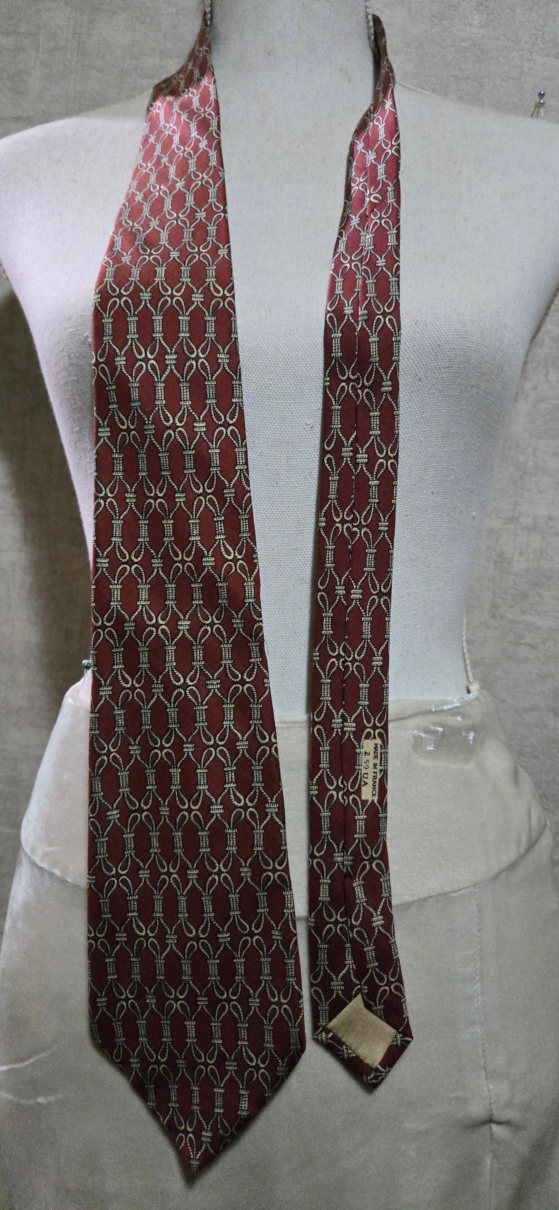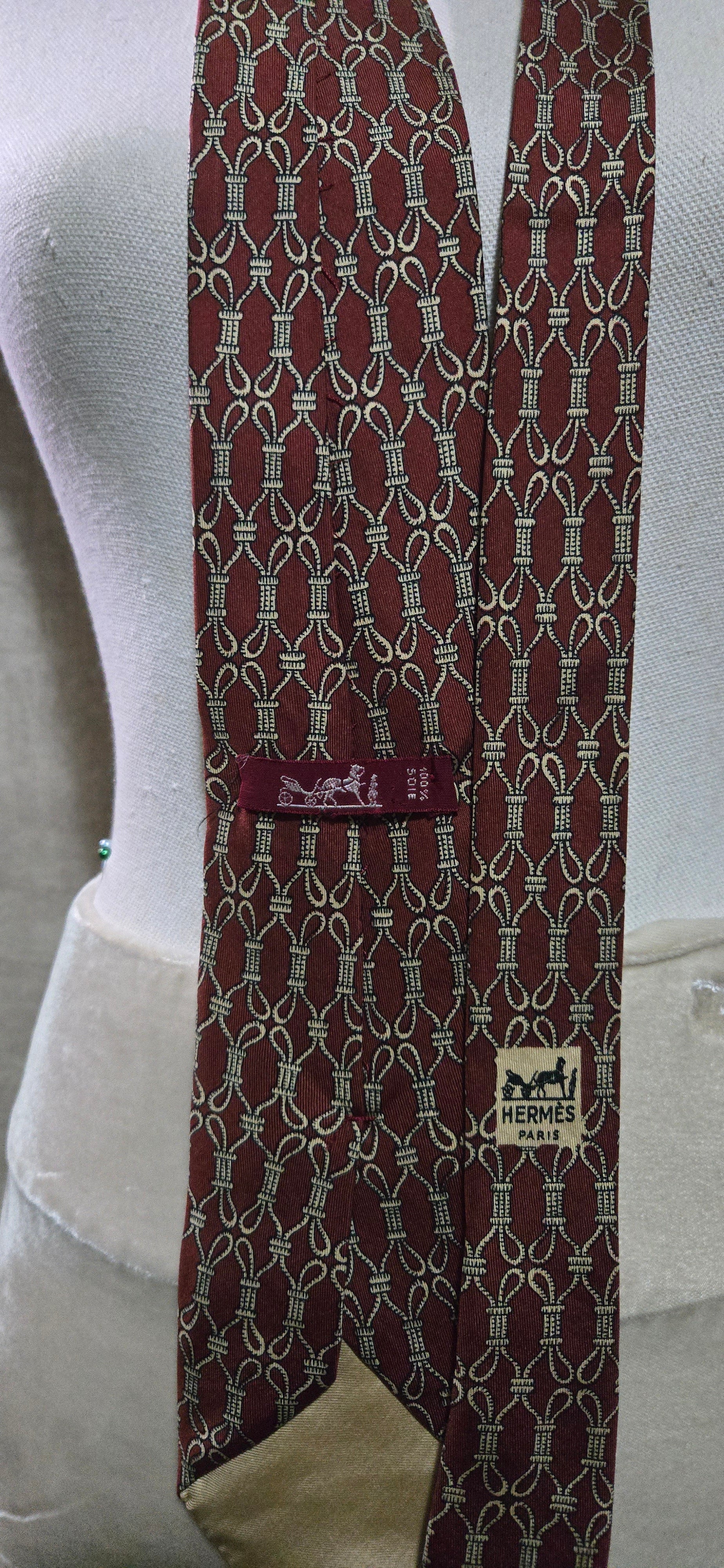 Hermès Paris, Cravate Vintage 1970 en soie a décor de cadrage sur fond de lie de vin dans sa boîte en très bon état.